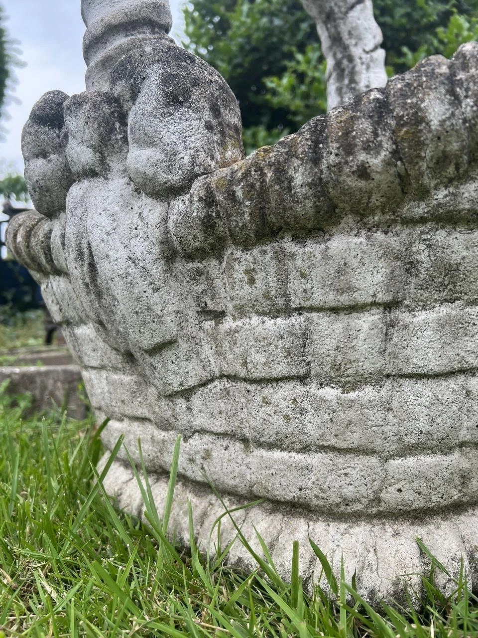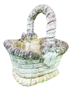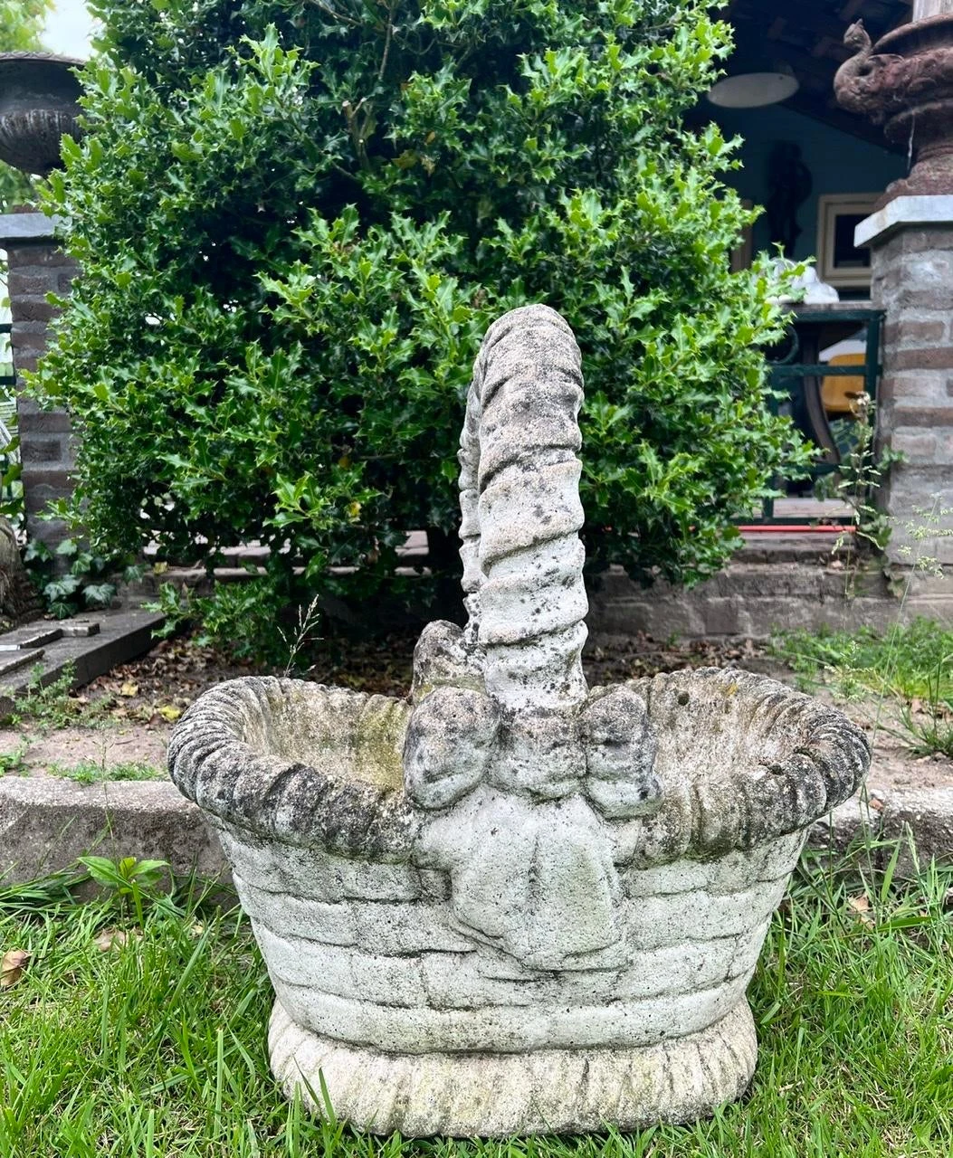A 20th century detailed French faux basket weave concrete planter in the shape of a basket with handle. The orname faux basket weave pattern on the basket and the handle are a reflection of the quality of the authenticity of this piece. It has signs of weather influences, but no damages.