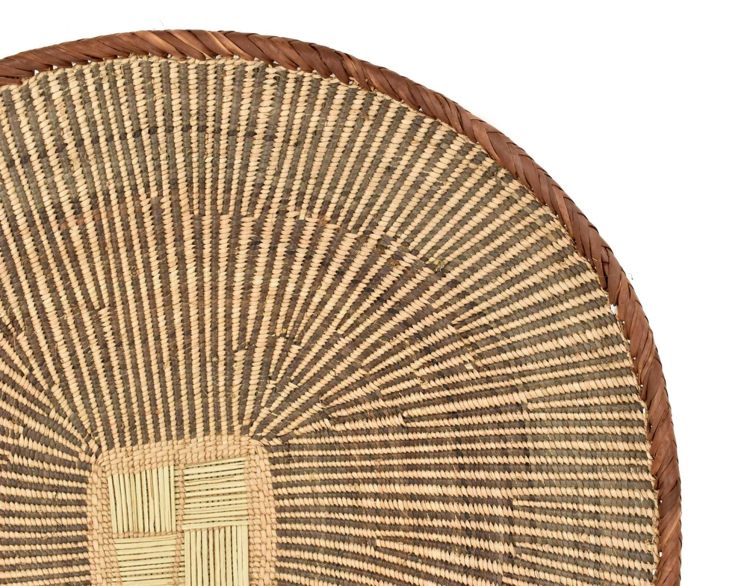 These contemporary solid-edged baskets are the apex of the basket maker’s art in Zimbabwe. The baskets start as a woven square and end up almost perfectly round. The pattern on the edging is referred to as “snake’s belly”, as the pattern resembles the scales of a serpent. The design is very functional, as the baskets are used to winnow grain even today. The baskets are sometimes called “grandmother baskets” because few younger women are making them.