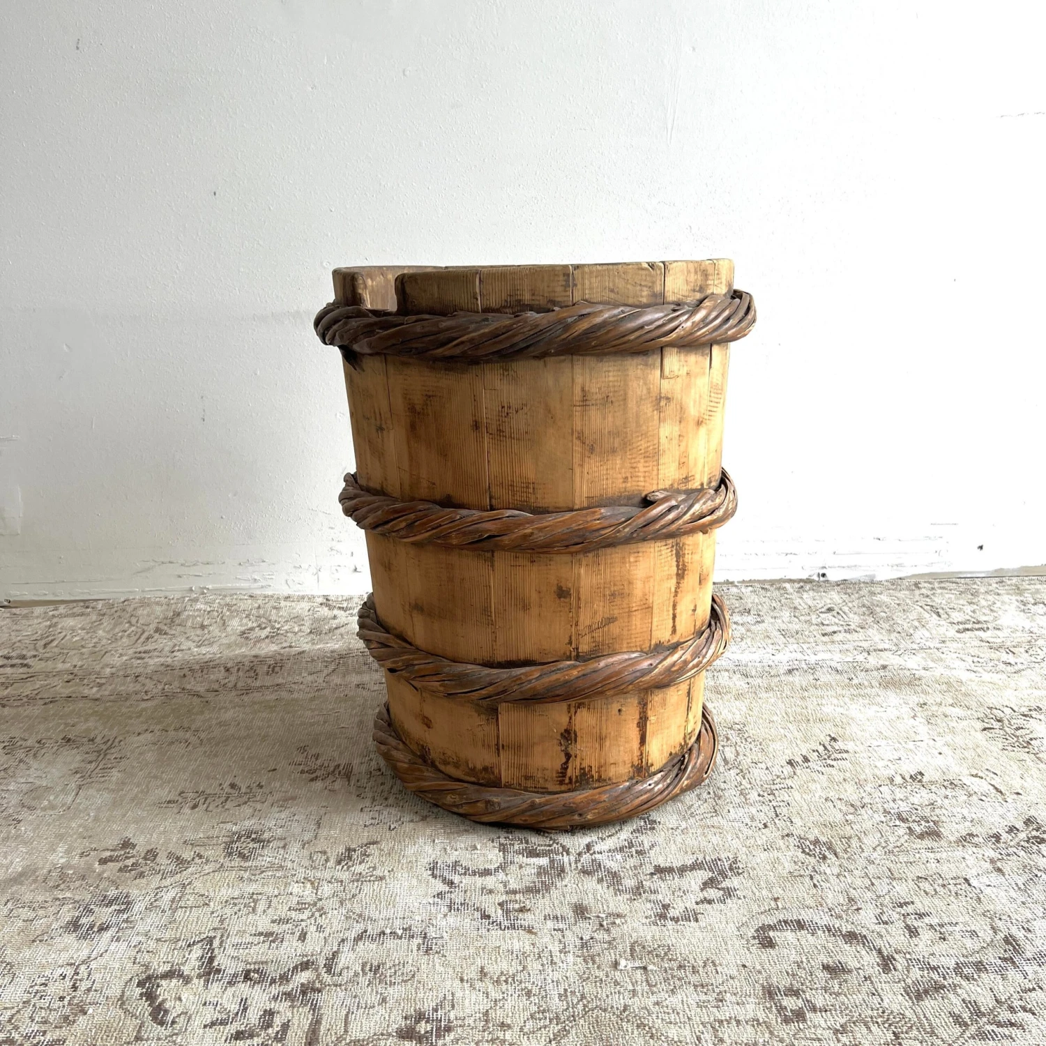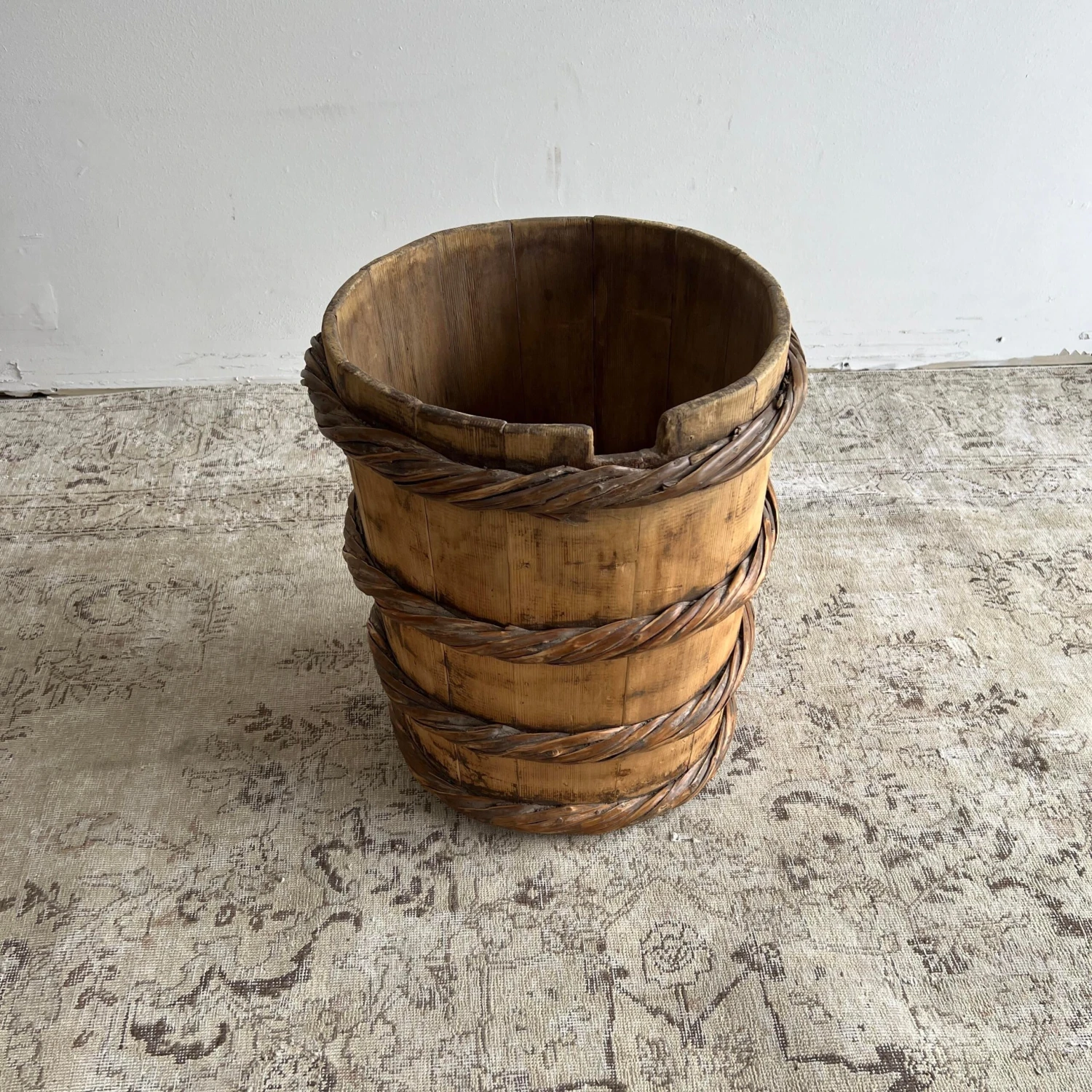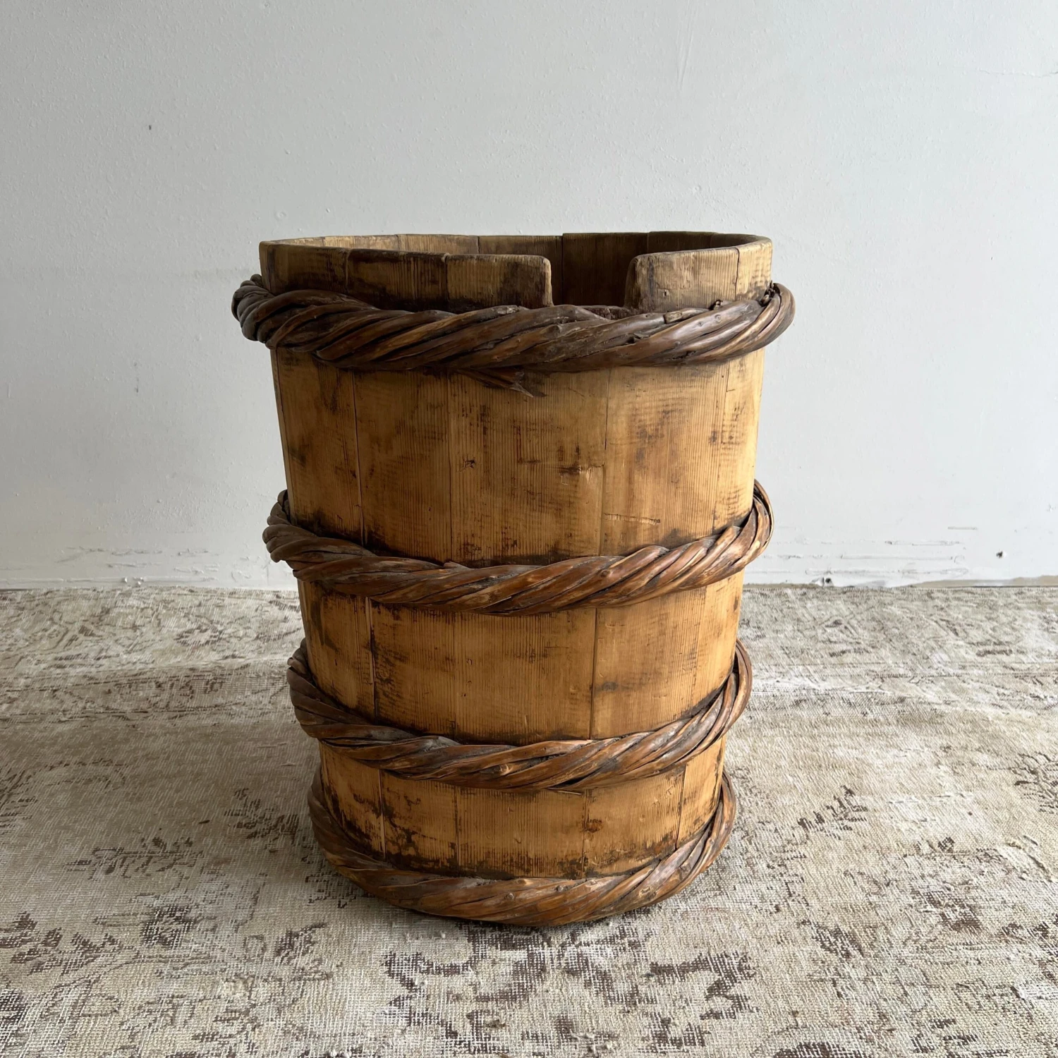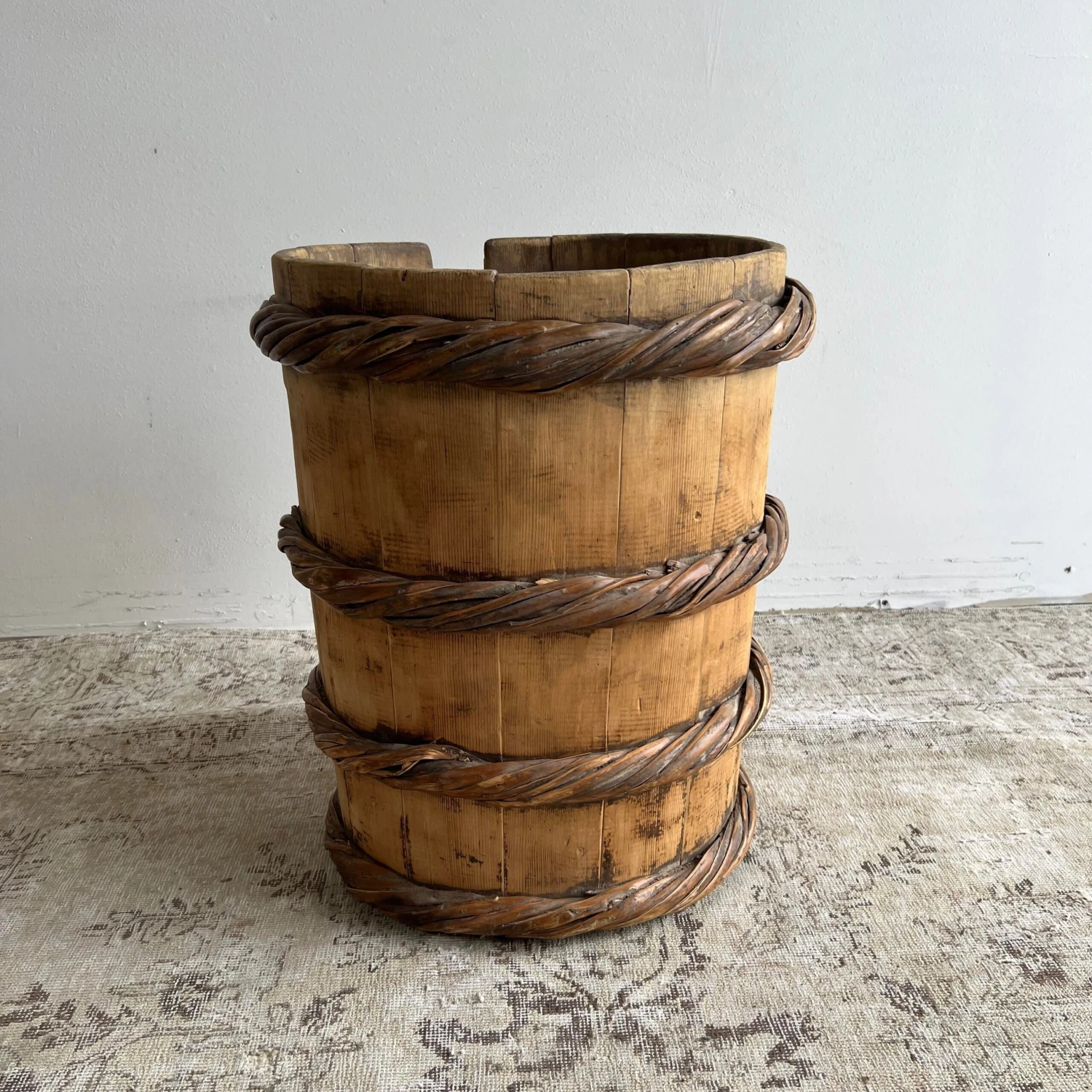 Vintage cypress wooden container for tree or plants, for indoor use only.