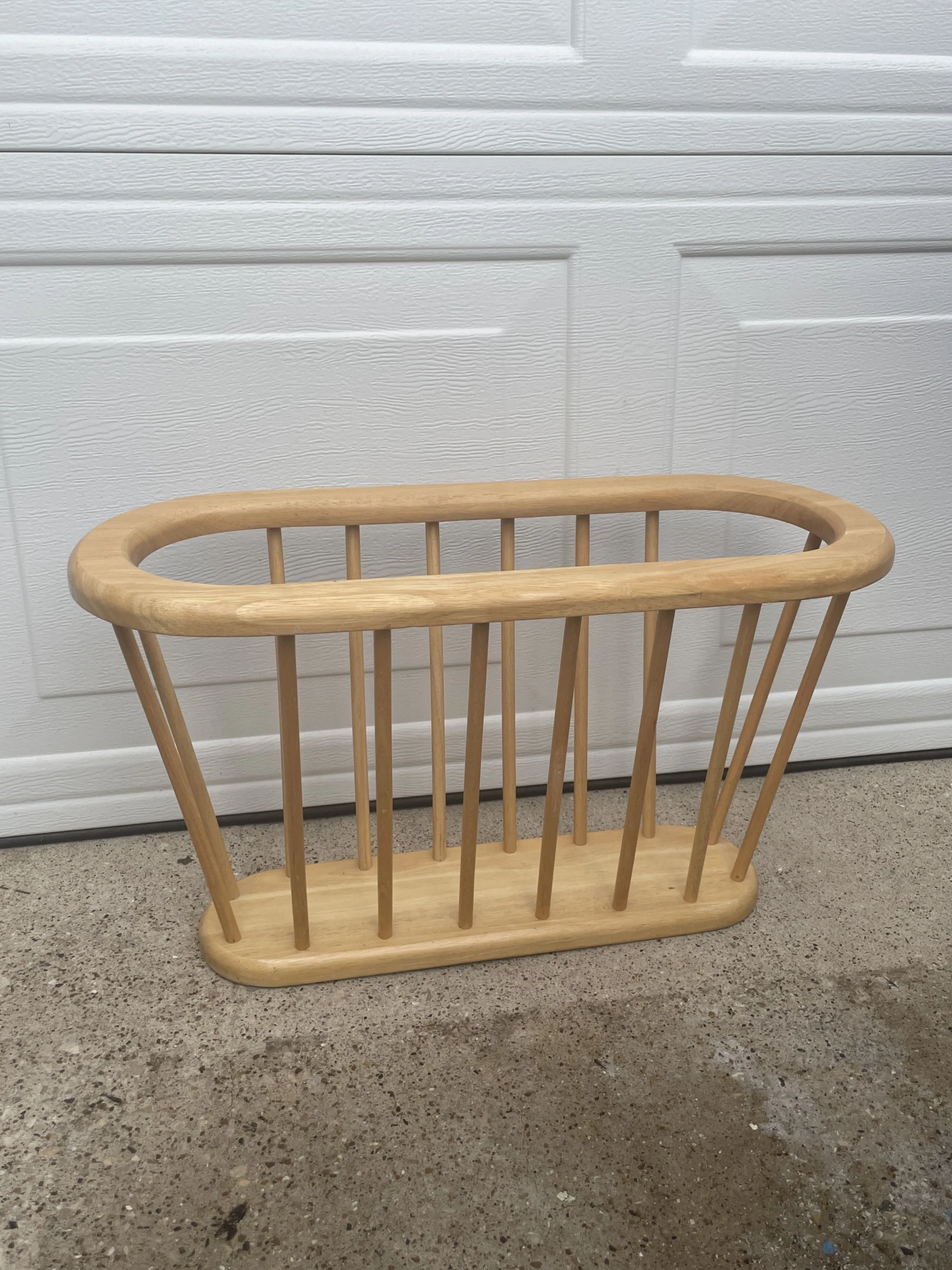 This is a very nice, mid century, Danish style, wooden, magazine rack. Made in the style of Arthur Umanoff, this retro, 1960’s, magazine / newspaper holder is oval in shape with open wooden spindles making up the sides.