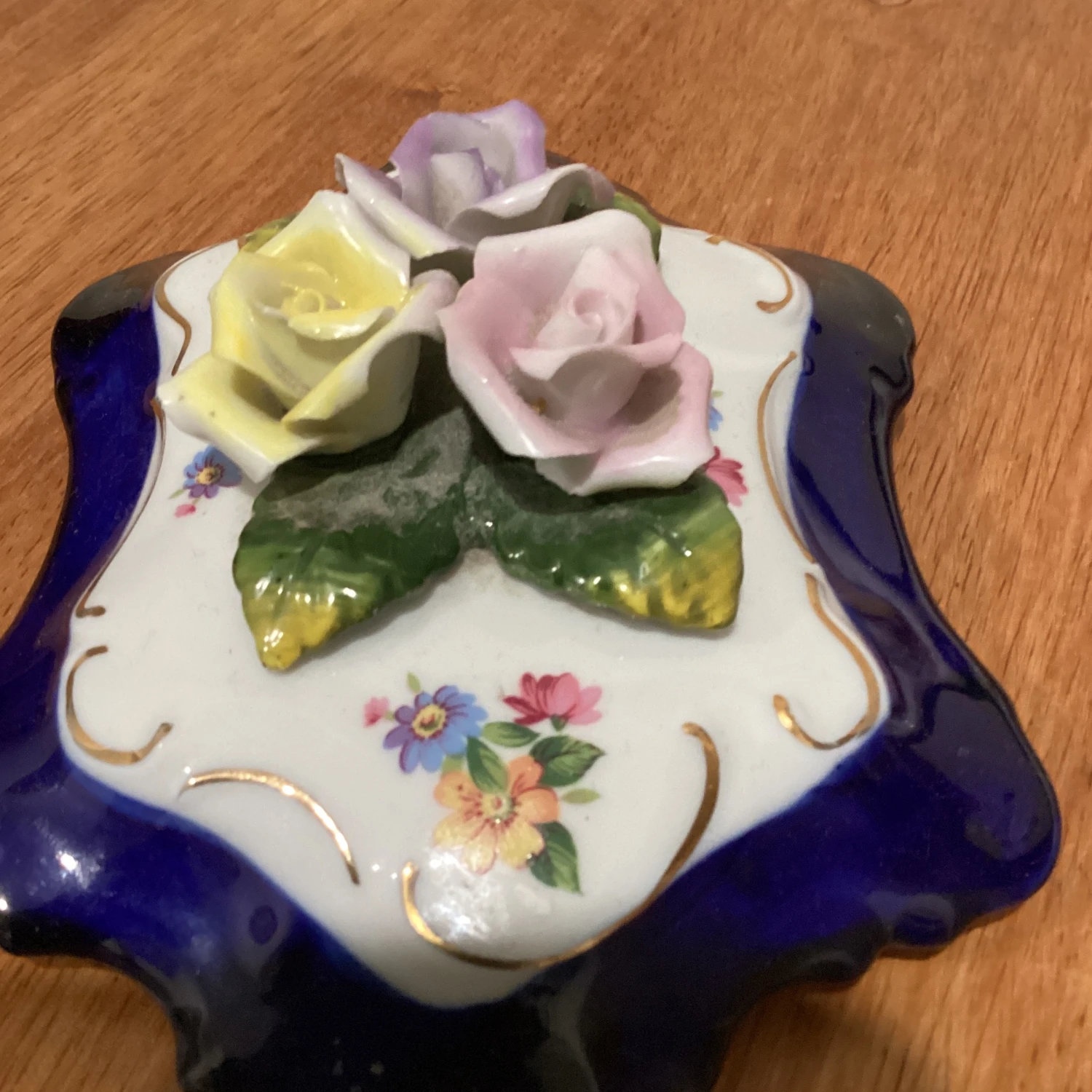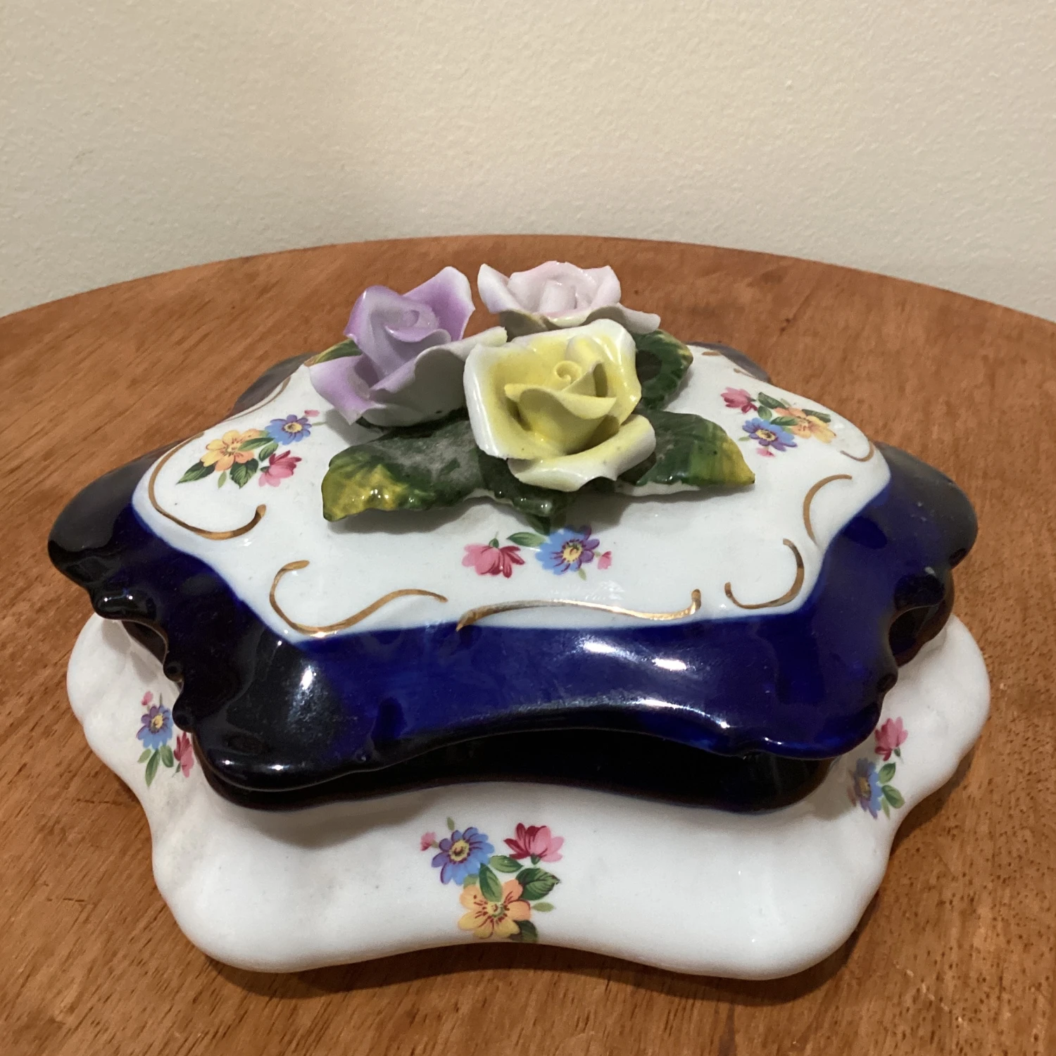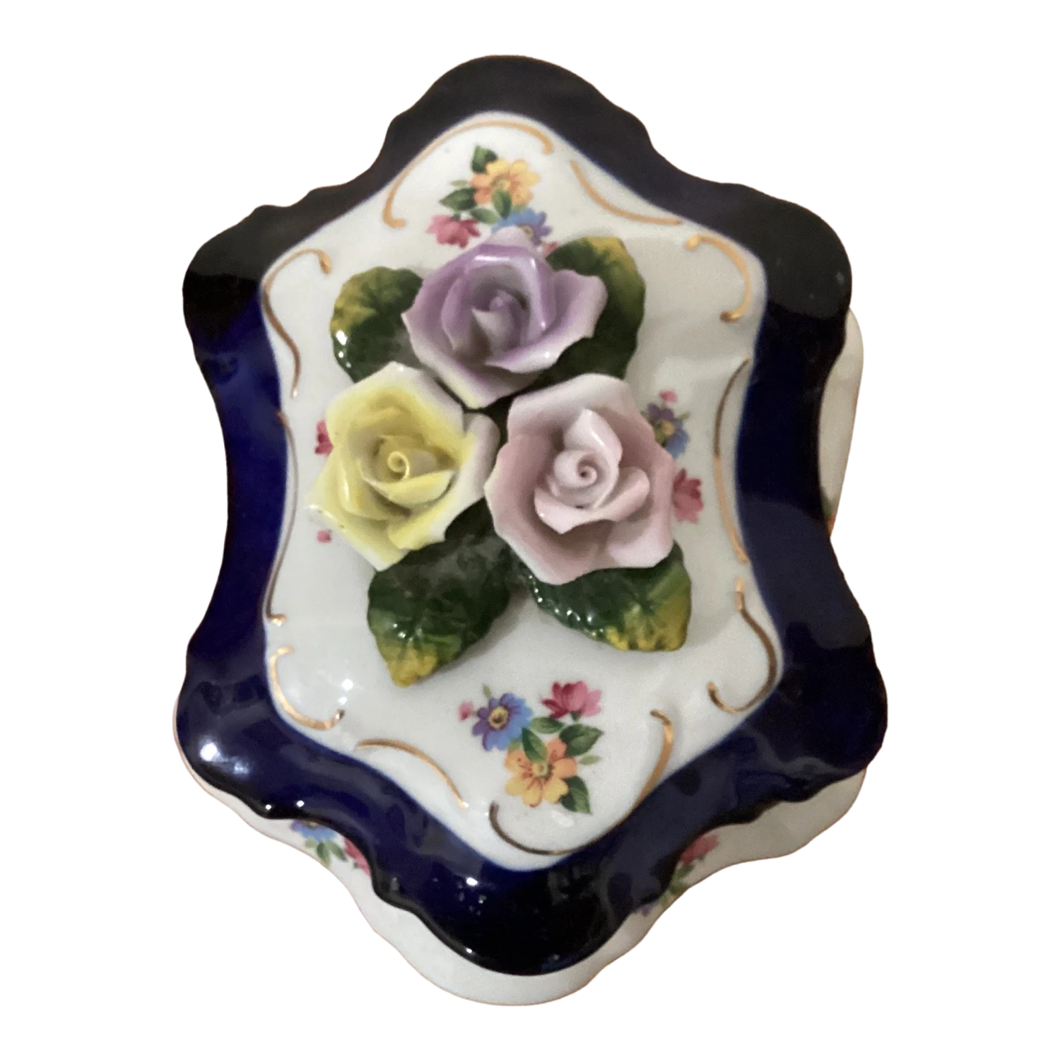This authentic I Borbone Capodimonte covered box is handmade in Campania, Italy. In a lovely colors, accented with ceramic roses in blush pink and pale yellow that are carefully displayed on the top of the cover. The fluted feet of this box adds to the beauty and charm of this covered box.