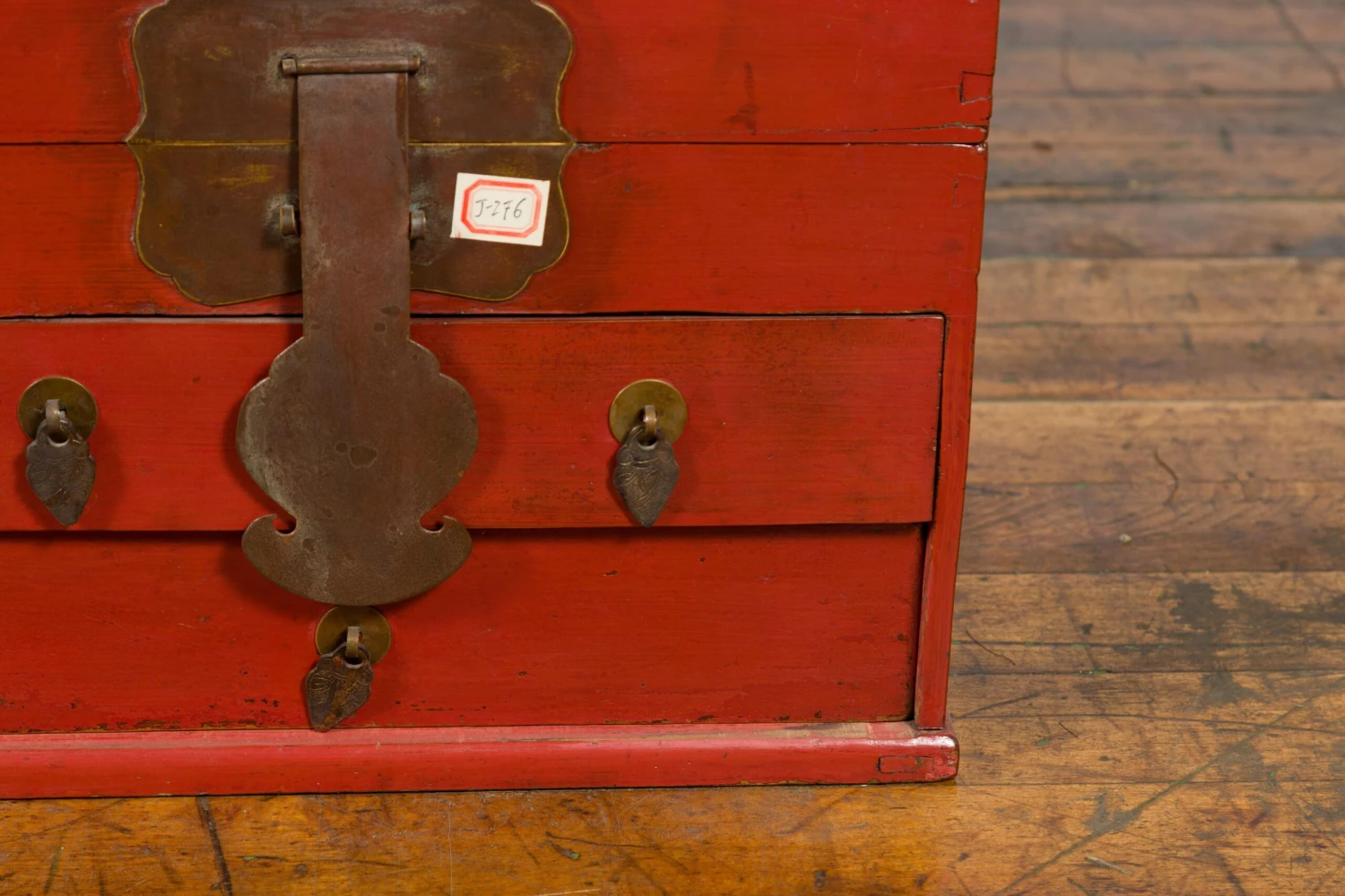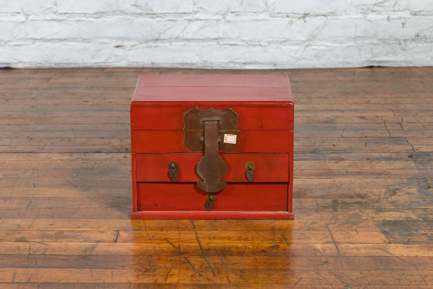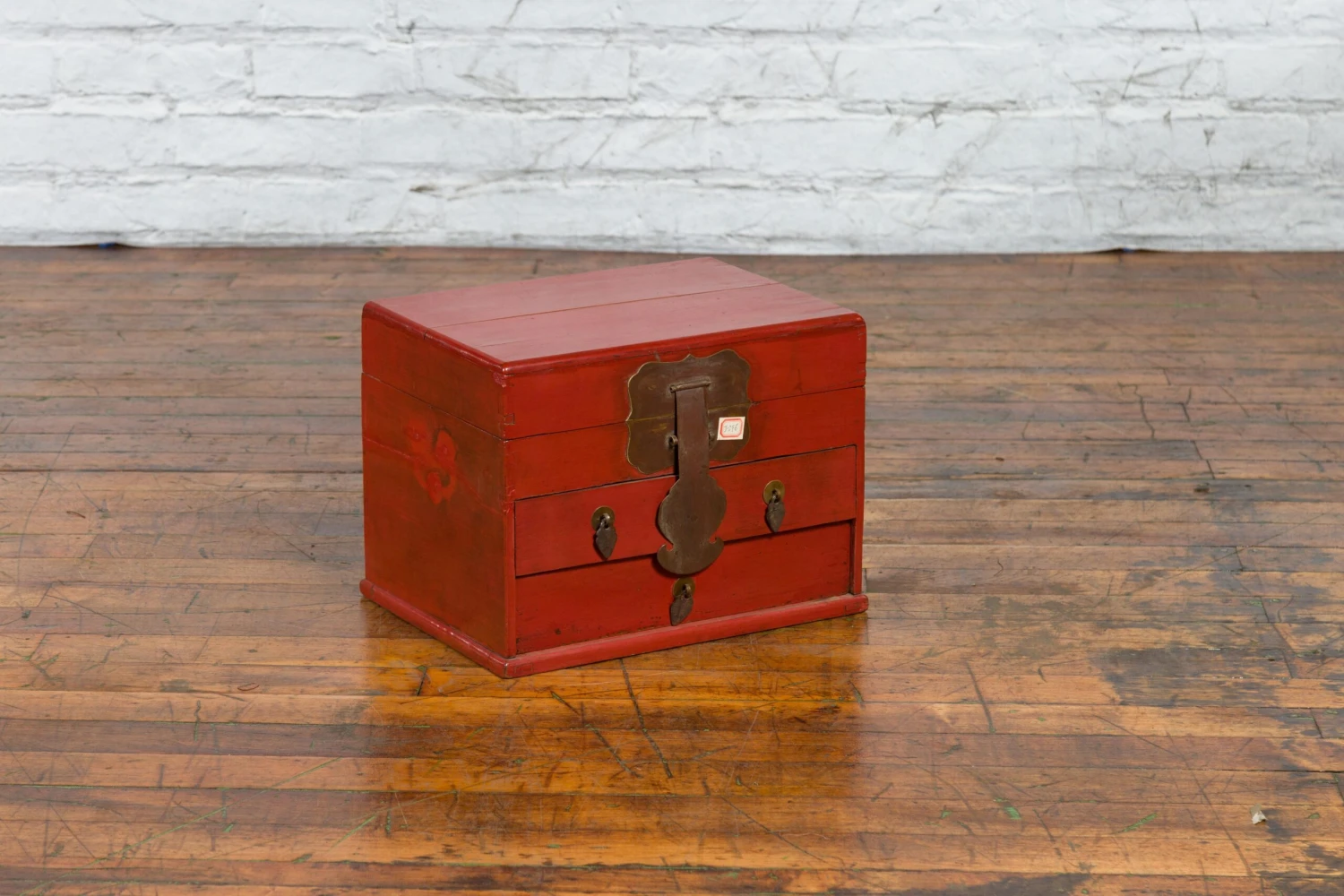 A Chinese red lacquered jewelry box from the early 20th century, with lidded top and three drawers. Created in China during the early years of the 20th century, this jewelry box attracts our attention with its red lacquer and large bronze hardware. Showcasing a rectangular lid opening to reveal a lacquered interior, the box showcases three drawers (two small ones over a larger one) fitted with teardrop pulls. A great addition to any bedroom or dressing room!