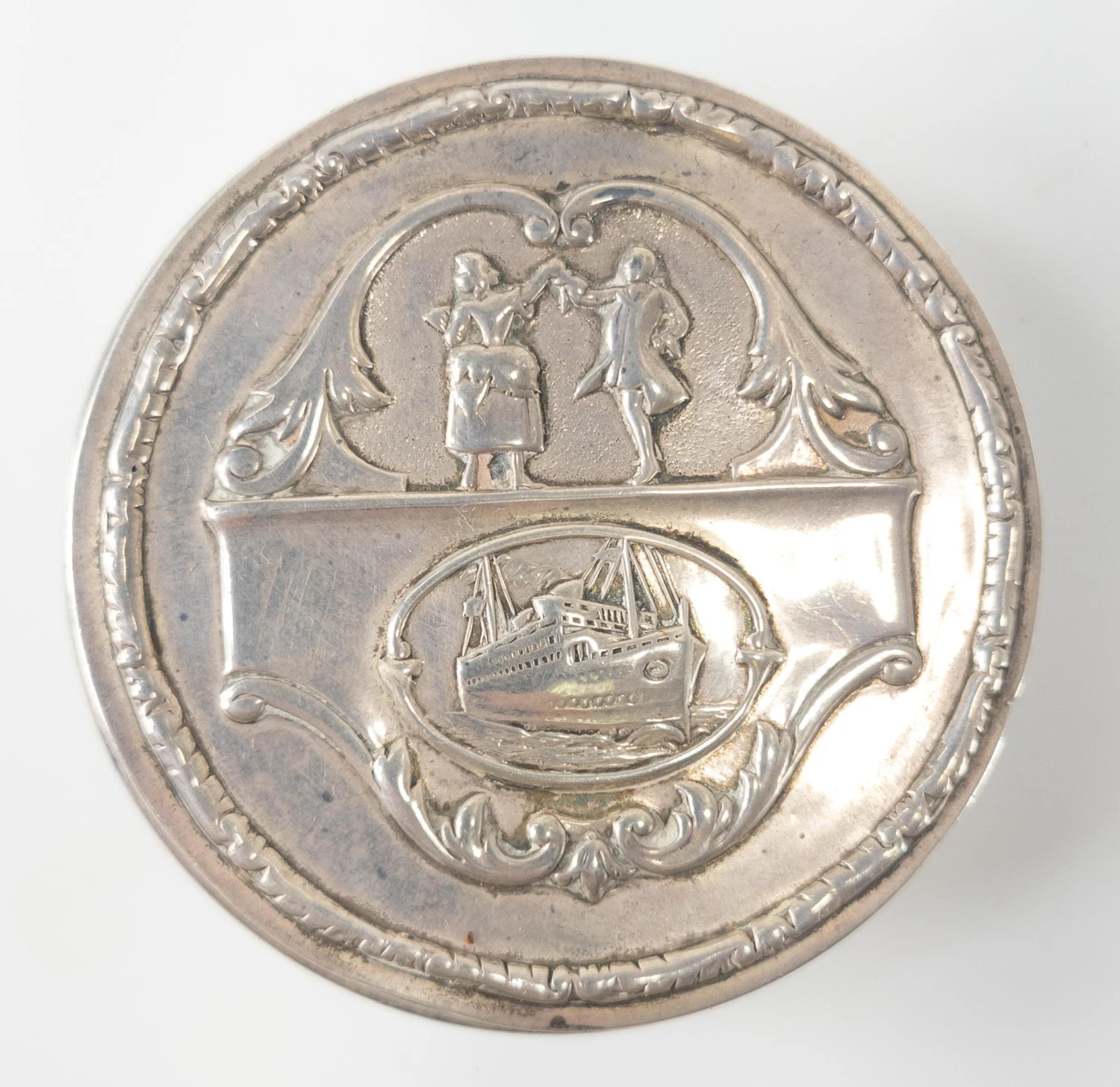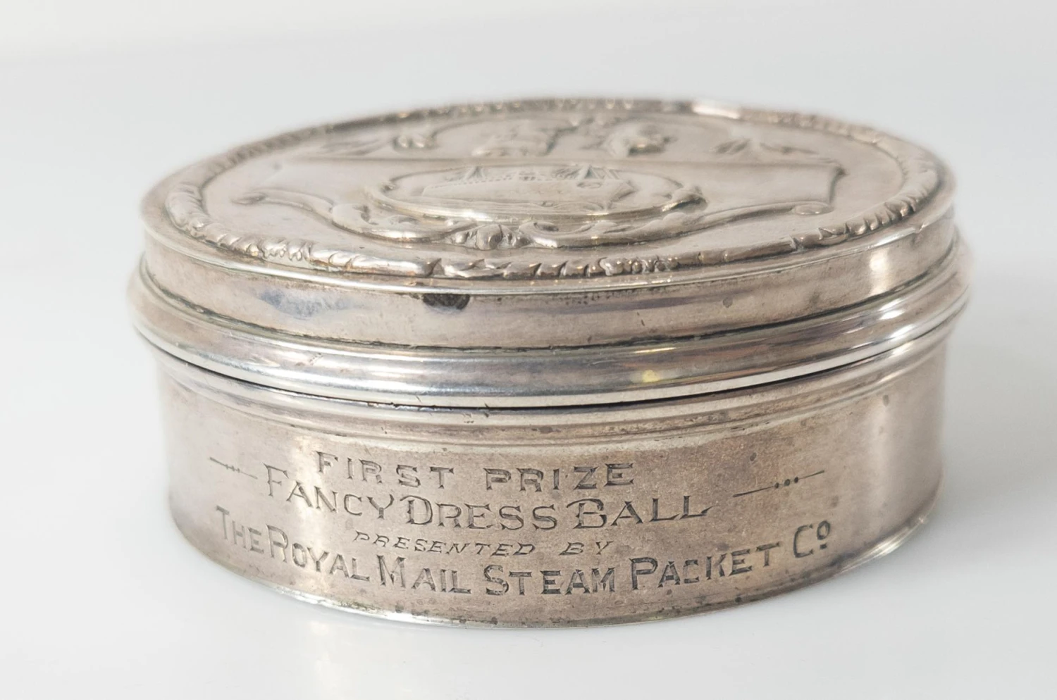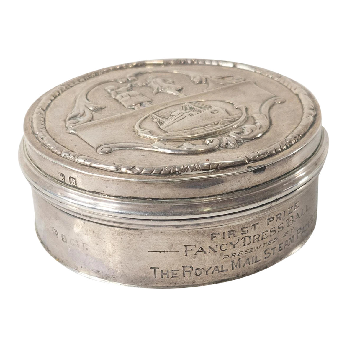 We are selling this English Sterling Silver compact box by Elkington & Co. This Special Elkington box has a cover with two dancers and a ship and is engraved First Price Fancy Dress Ball Presented by The Royal Mail Steam Packet Co.
