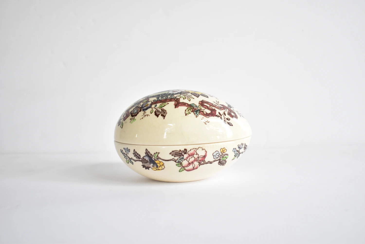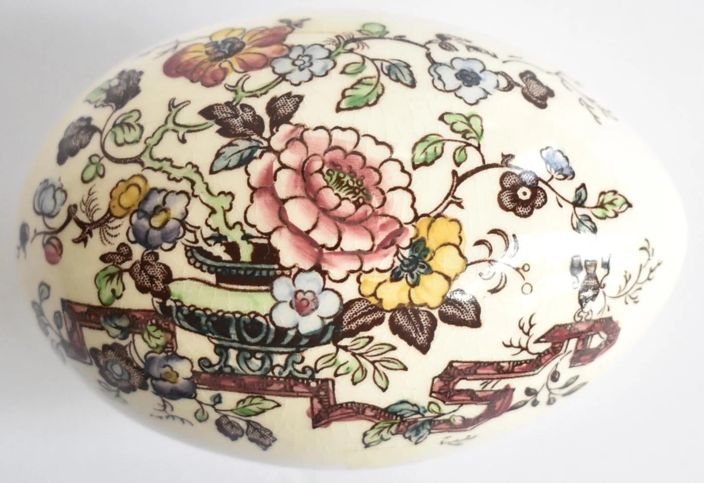 An antique English Staffordshire ironstone trinket box in the shape of an egg with brown sepia transferware chinoiserie botanical designs, hand-tinted with brown, red, yellow, green, and blue glazes. Mason’s England. Early 20th-century. 4.5″x2.75″x2.75″.