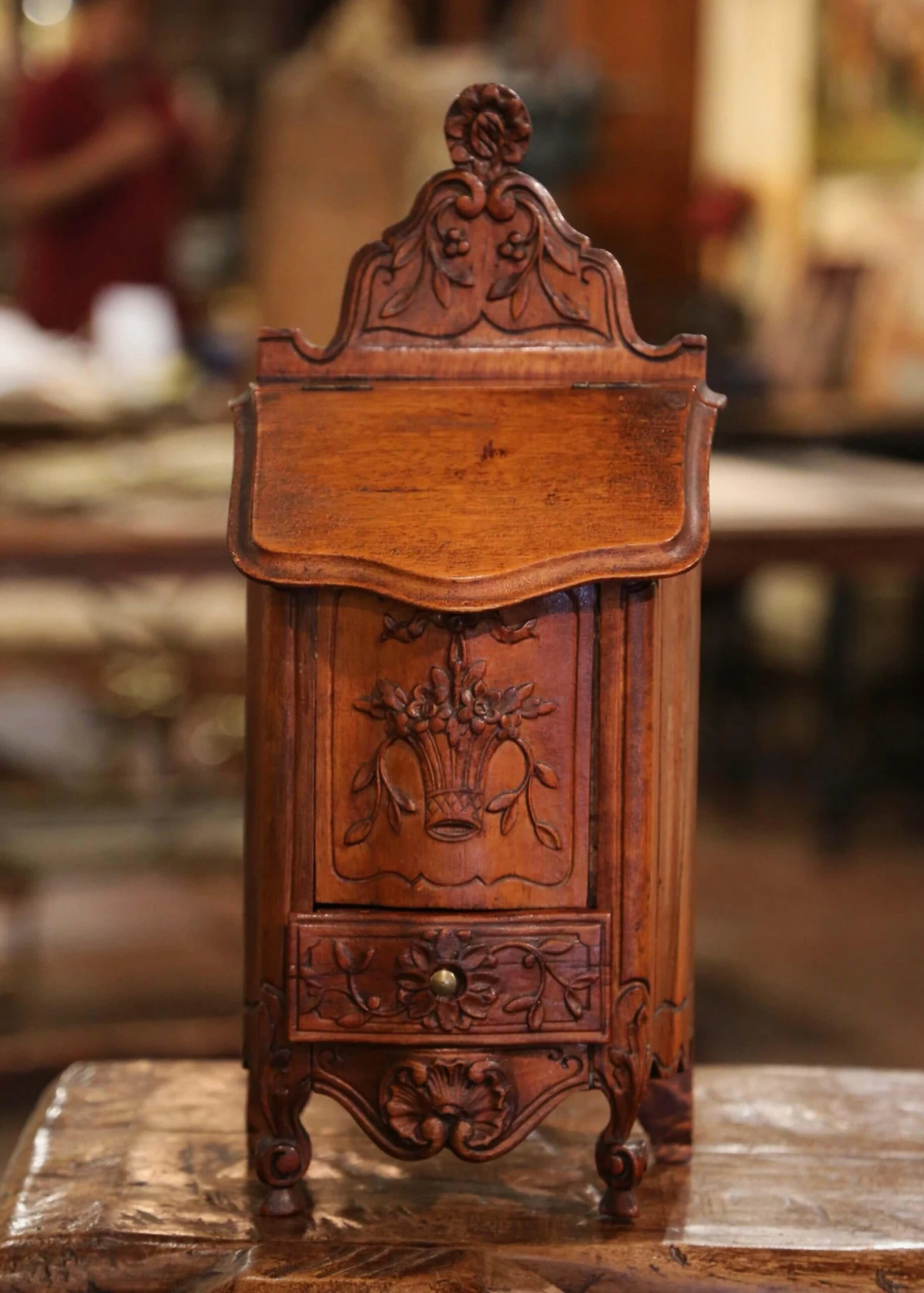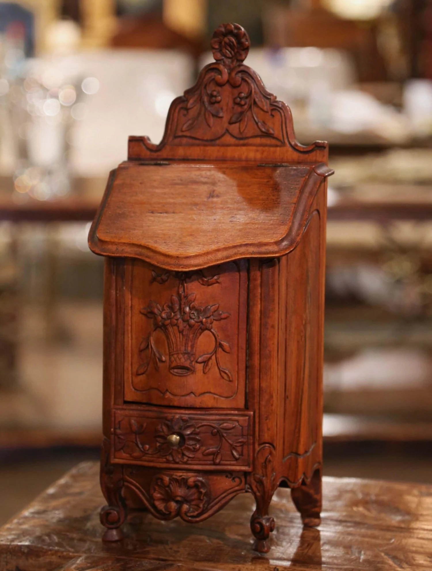 This elegant, antique fruitwood salt box was crafted in southern, France, circa 1920. The ornate, decorative, walnut box sits on delicate escargot feet over a scalloped apron decorated with a shell motif; it features beautiful carvings throughout including a vase and floral decor. The piece has a small but usable drawer at the bottom dressed with a brass knob, and a lift up top to reveal inside storage. The kitchen accessory is in excellent condition with a rich walnut patina, and could be used on a counter, a shelf or hung on a wall.