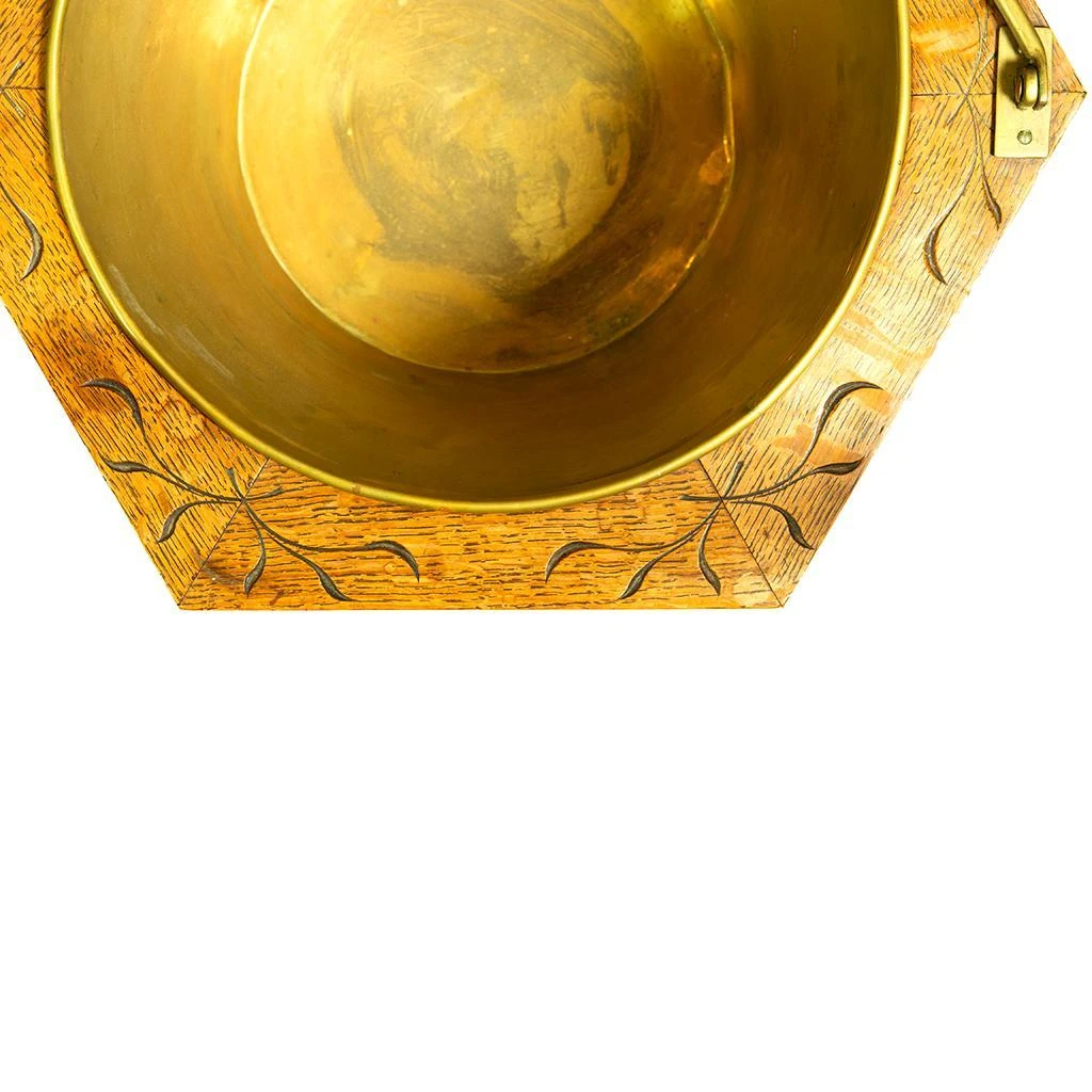 With brass handle and liner. Hexagonal form with incised carved decoration. Toupie feet.