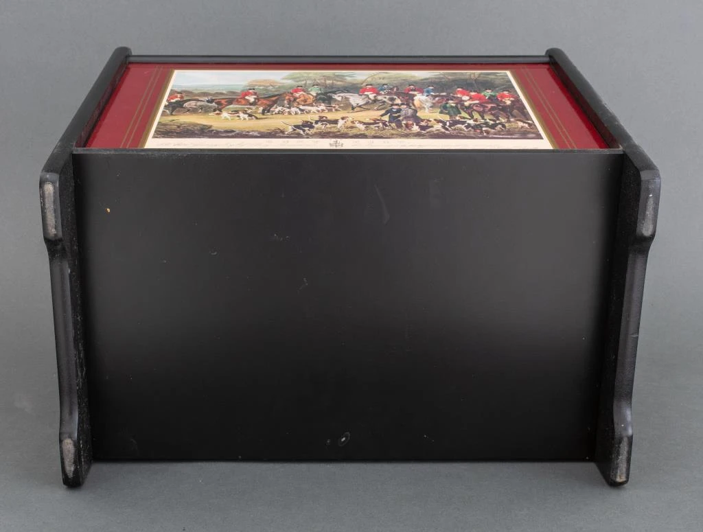 English fox hunting themed magazine rack, decorated with prints of two lithographs depicting fox hunting, wood and resin, unmarked. 15″ …