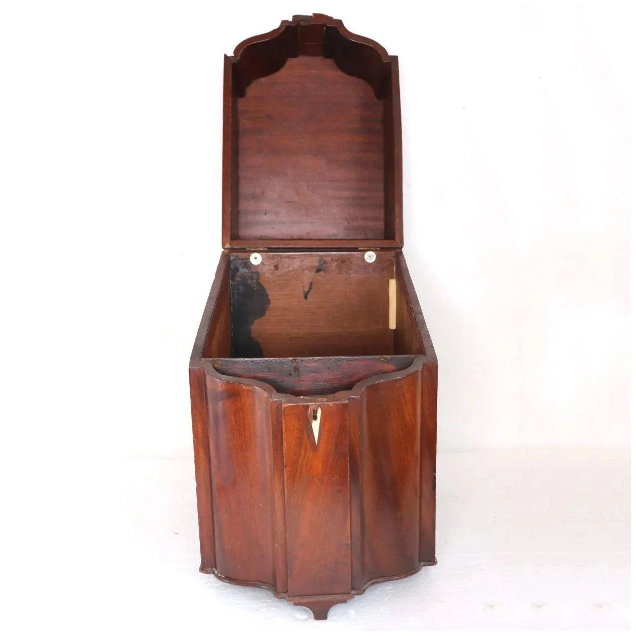 An antique cutlery canteen of traditonal form with a serpentine front and slanted hinged lid.