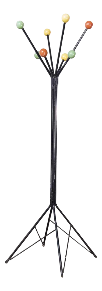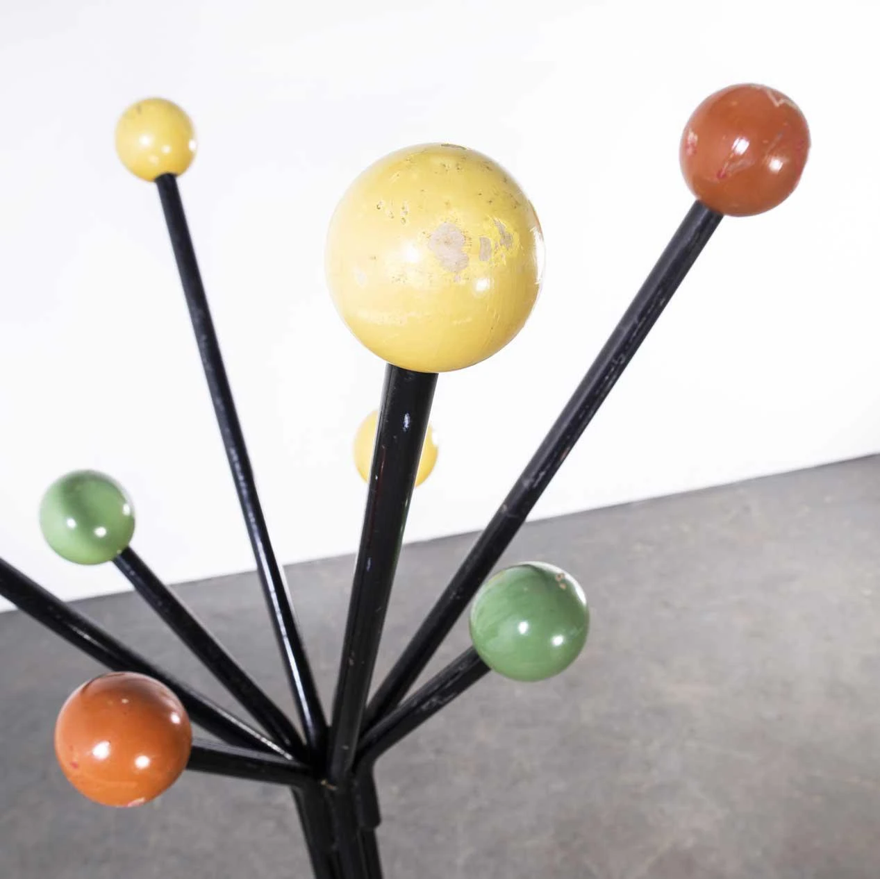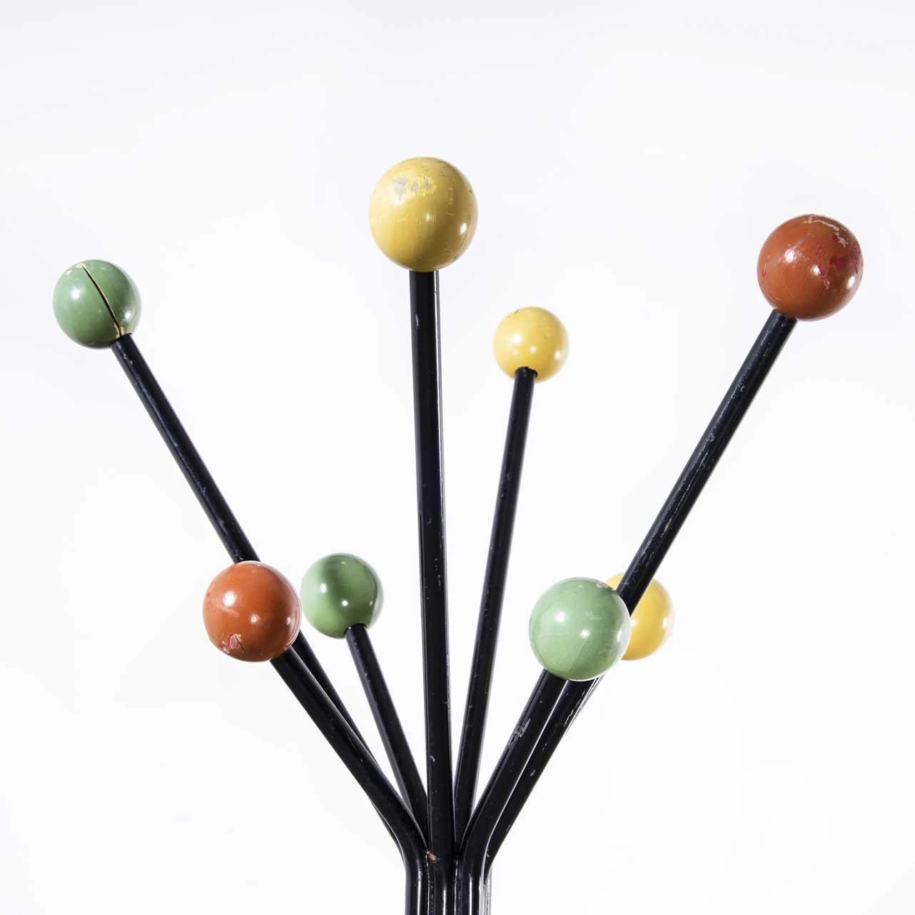 This is a 1950’s French geometric coat rack. It is a superb original French coat rack. The frame is made from solid steel rod grouped together in the centre yet splaying out equally for the feet and the hanging rods, each one topped with the original 1950’s coloured wooden balls. This piece is attributed to the mentioned designer/maker. It has no attribution mark and no