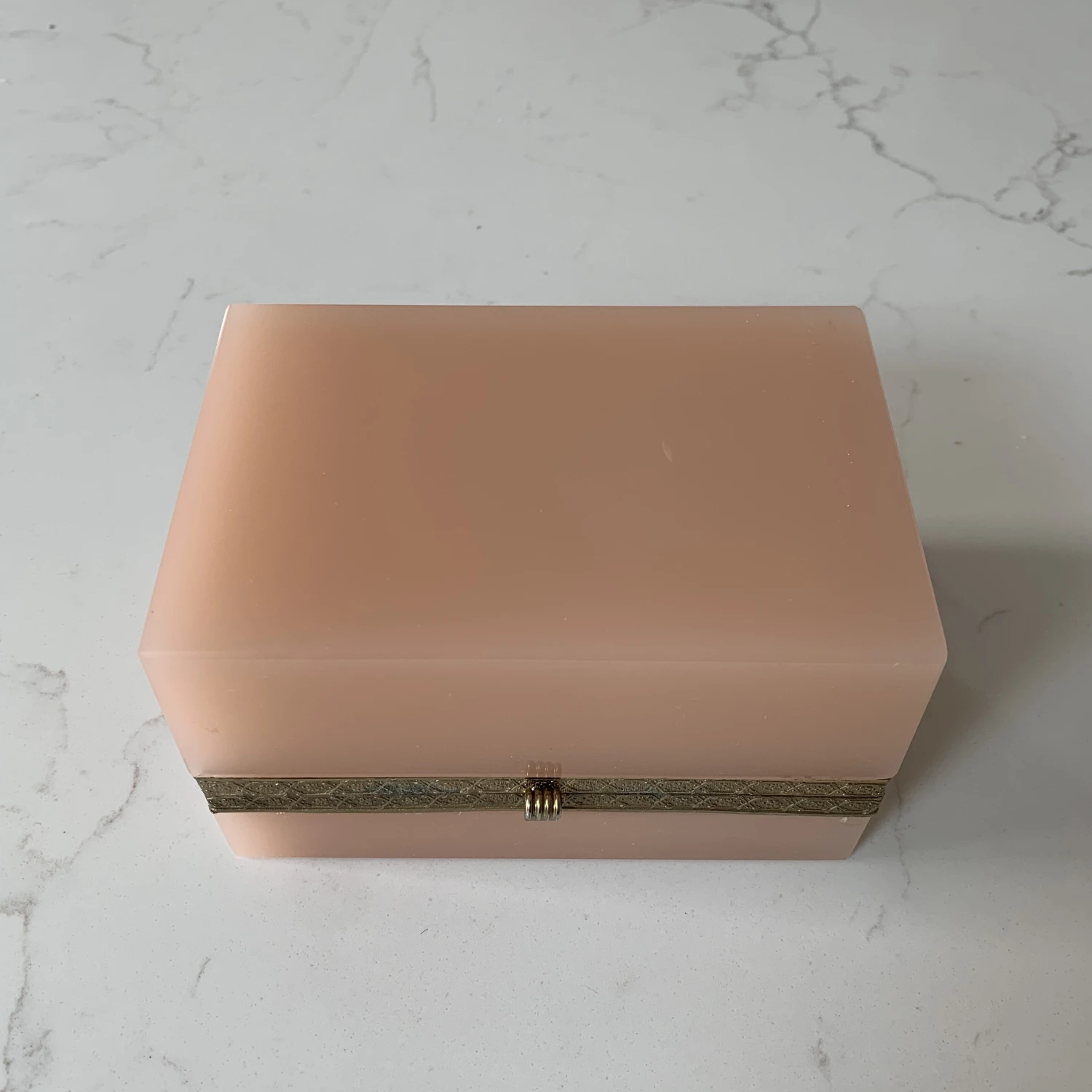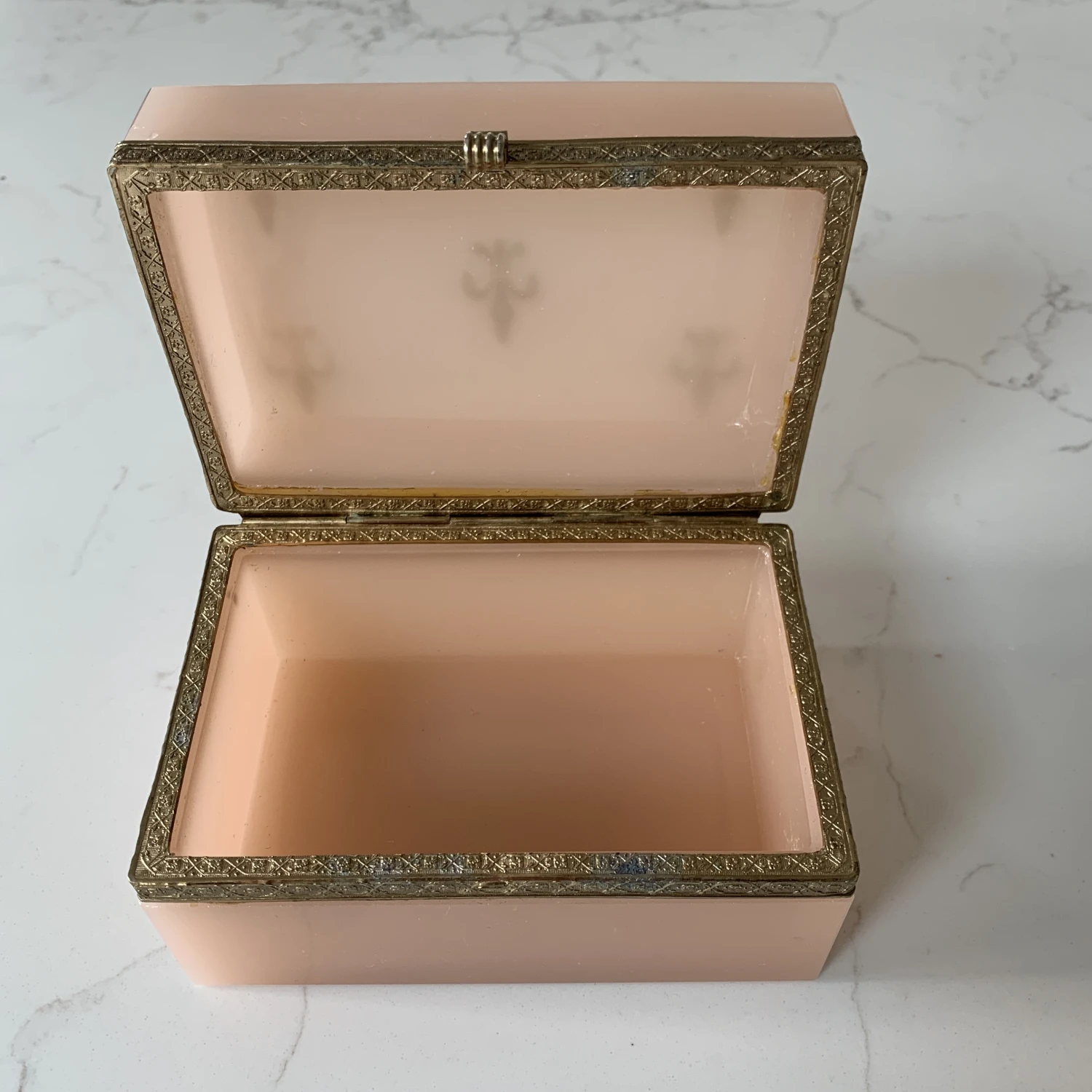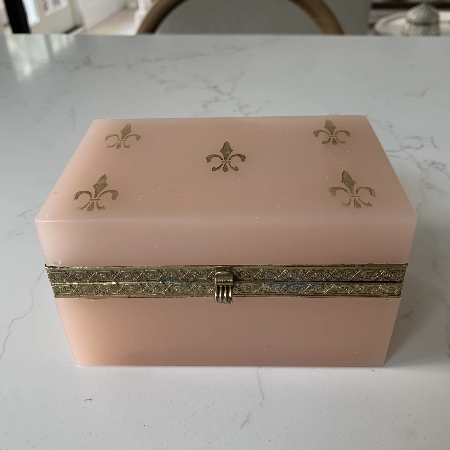 French Pale Pink Opaline glass Casket Box With Brass and Fleur De Lis Design