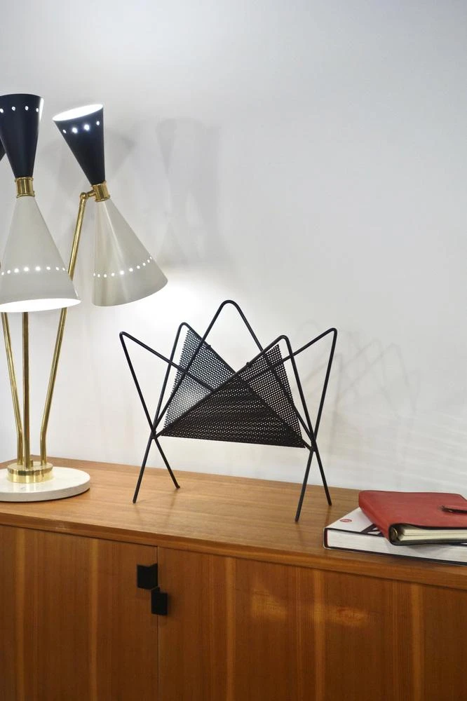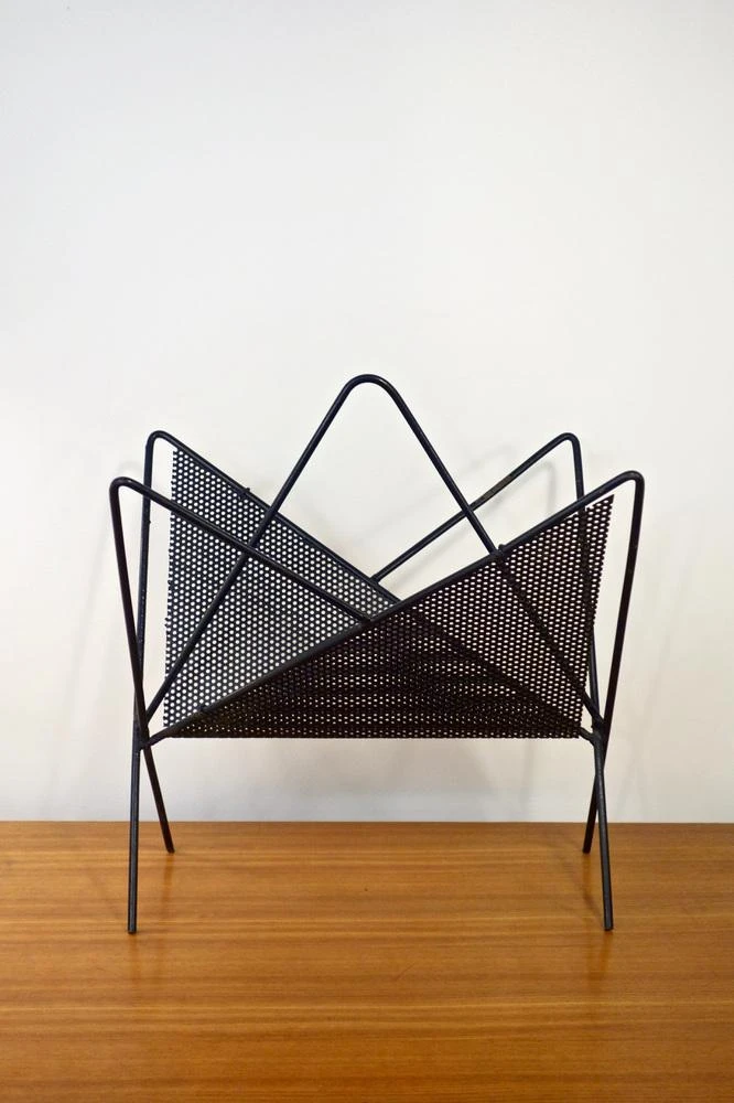 Mathieu Matégot vintage magazine holder. Made and designed in France by the company Matégot in 1954. Model called “Butterfly” in lacquered and black perforated metal rods. Good general condition, the Revues Porte is in juice with its traces of time, repainted at one time, it kept all its patina. Notice to purists! Rare part with geometric lines characteristic of Matégot’s work.