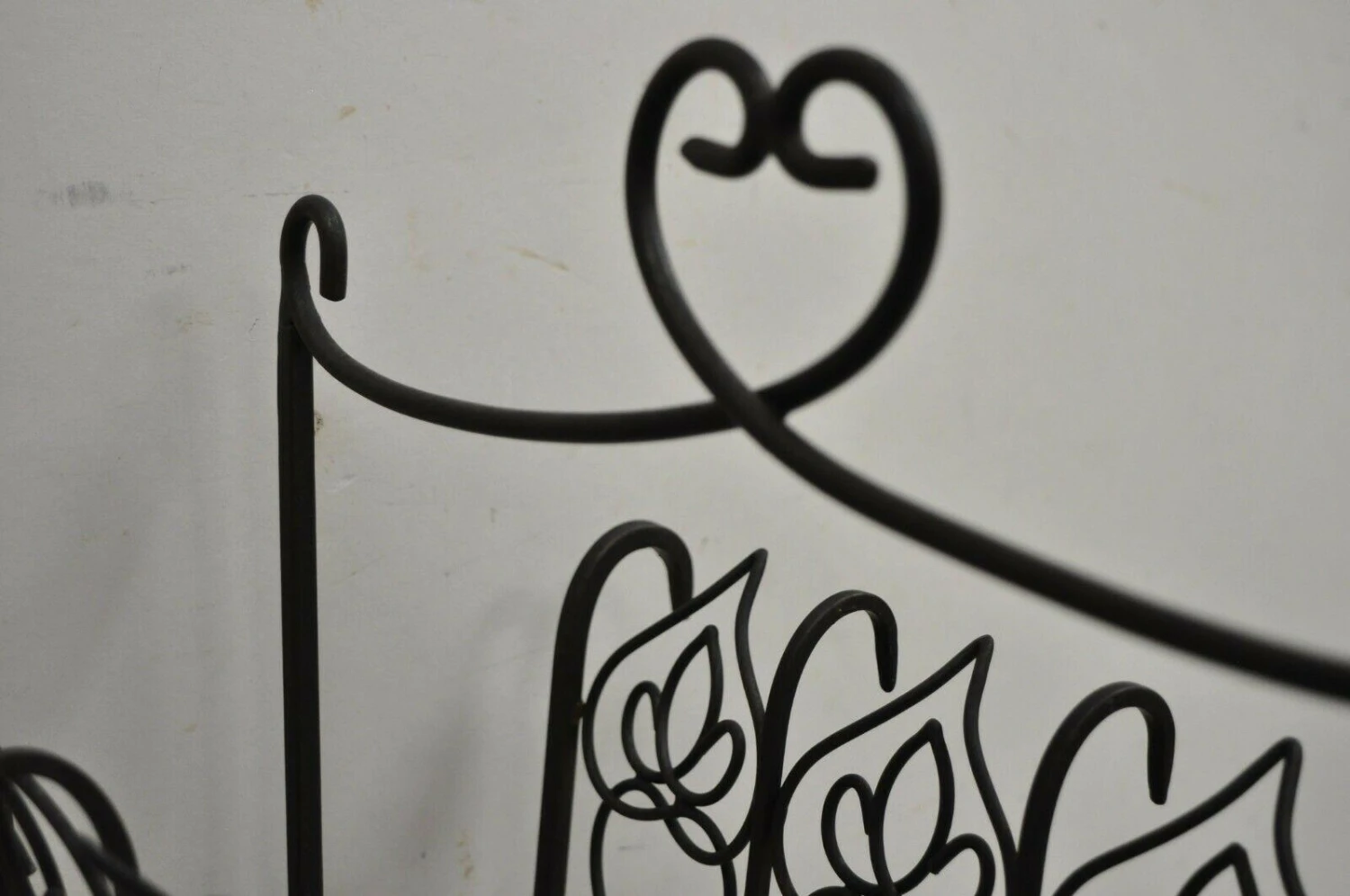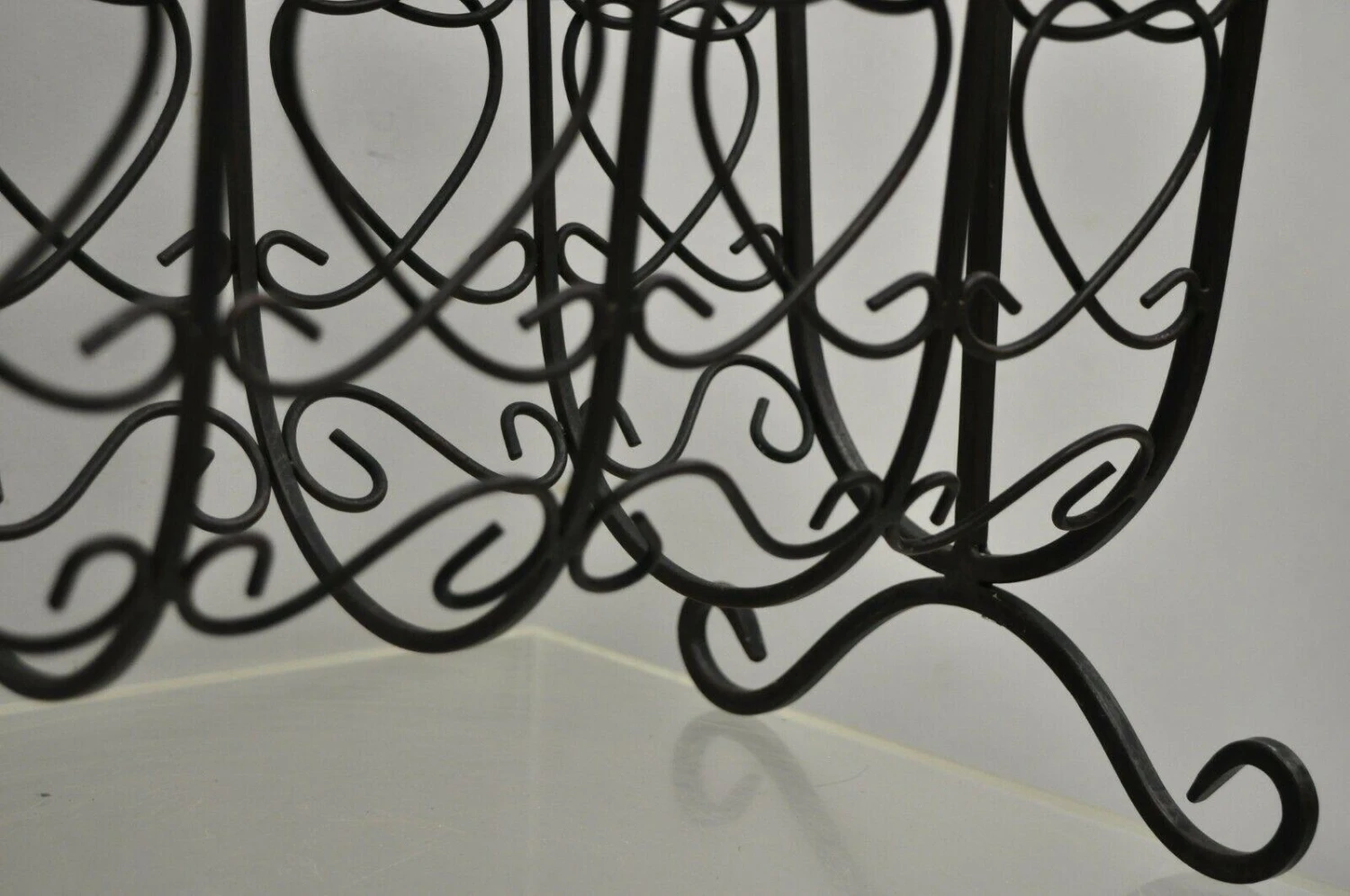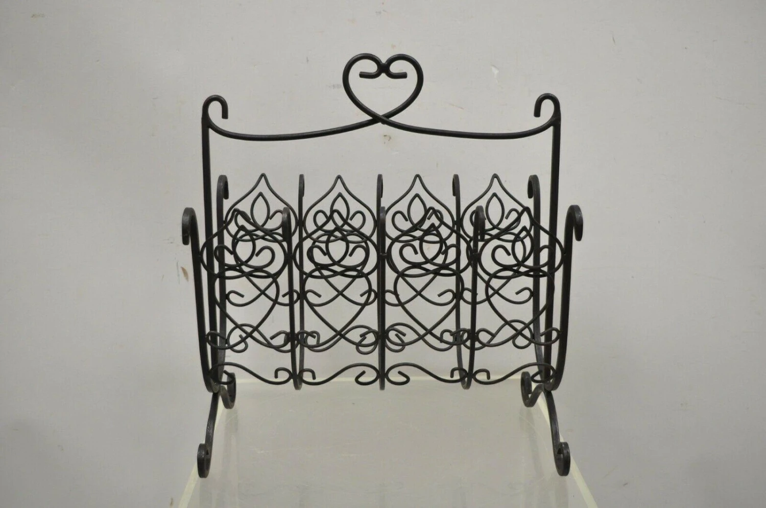 French Style Scrolling Wrought Iron Magazine Rack Stand with Heart. Item features scrolling wrought iron frames, heart design, great style and form. Circa Late 20th Century. Measurements: 16.75″ H x 14.5″ W x 10″ D