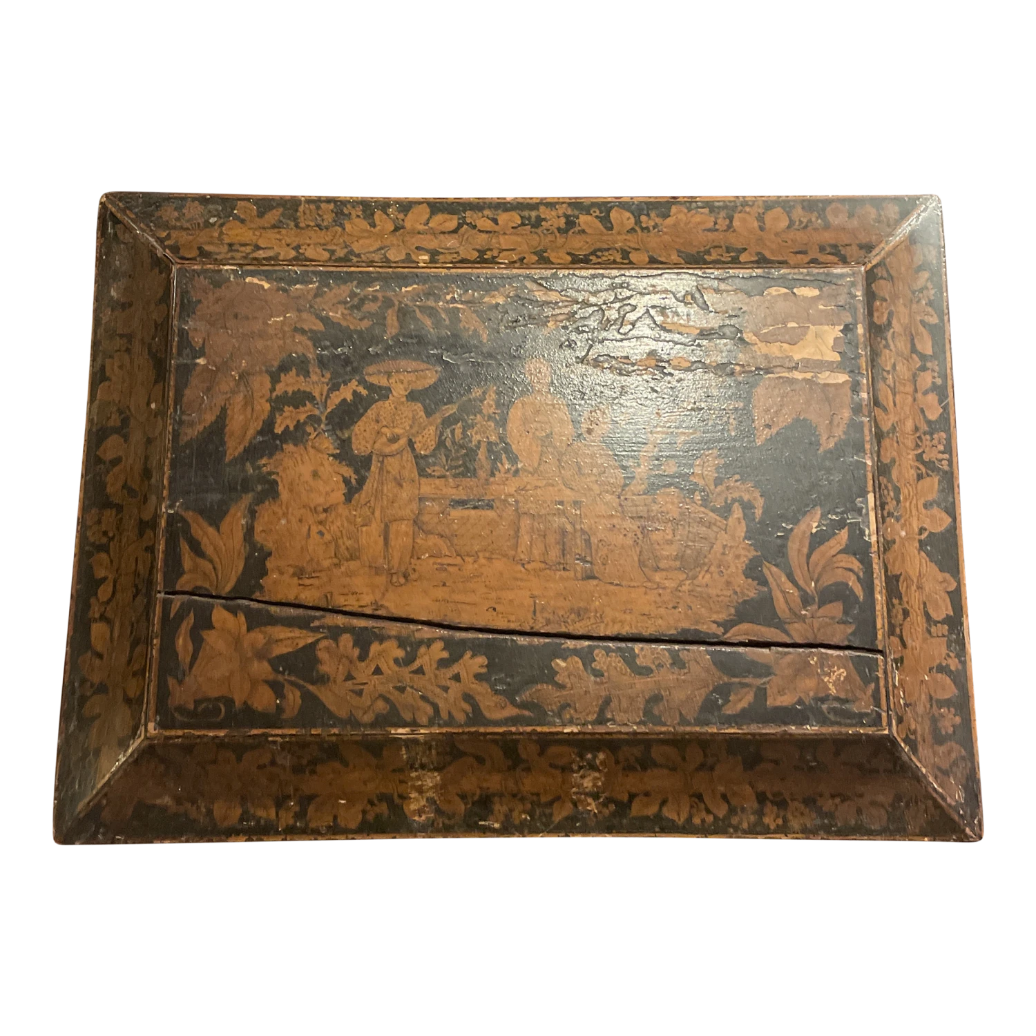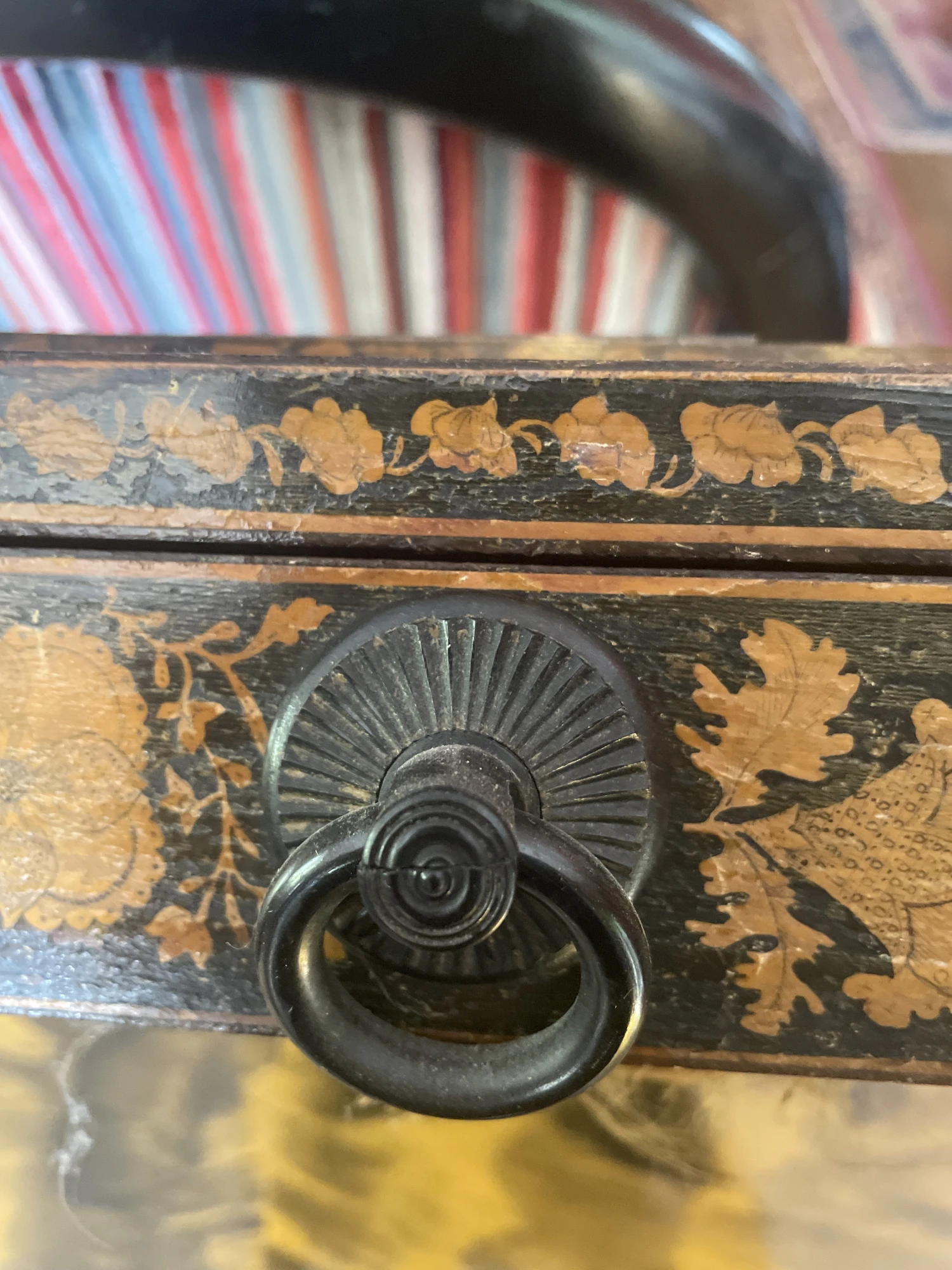 A Georgian whatnot box Interior compartments we’re removed Hand painted chinoiserie design. Box handles and feet are either ebony or carved from a nut or so I have been told. The bottom is signed either with the name of the owner or the maker and the name of the shop. All of which I have written down and must locate.