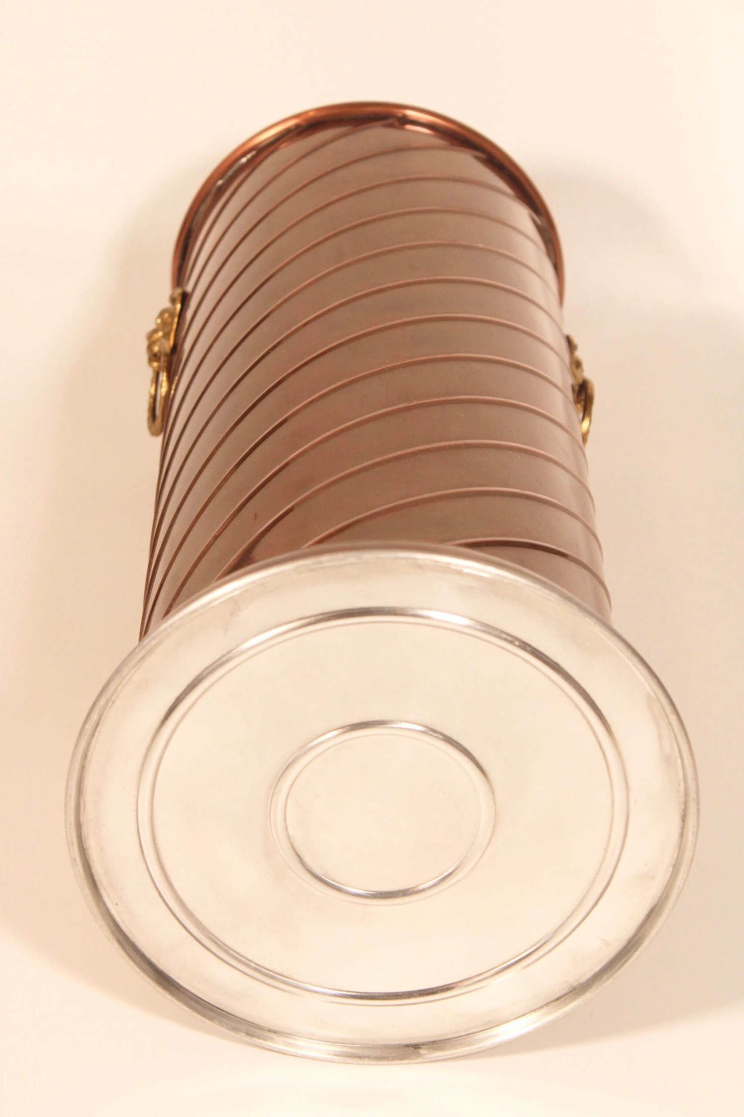 This is a unique Mid-20th Century Copper Umbrella Stand or Cane Holder with Lions Head Ring Handles. This Hollywood Regency …