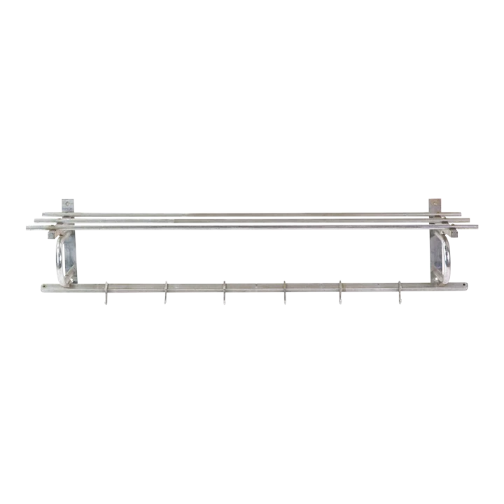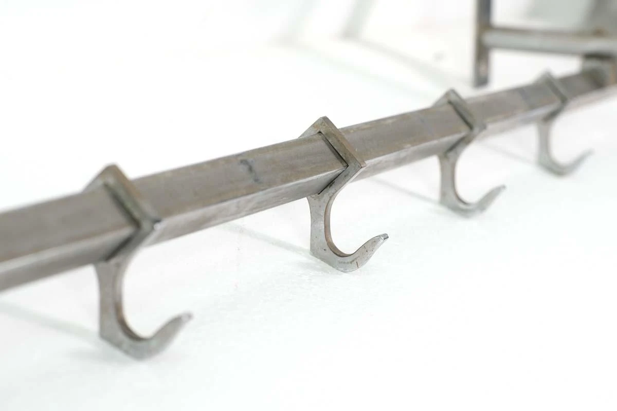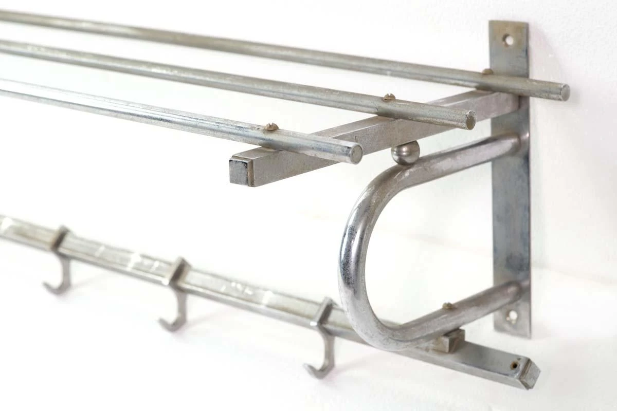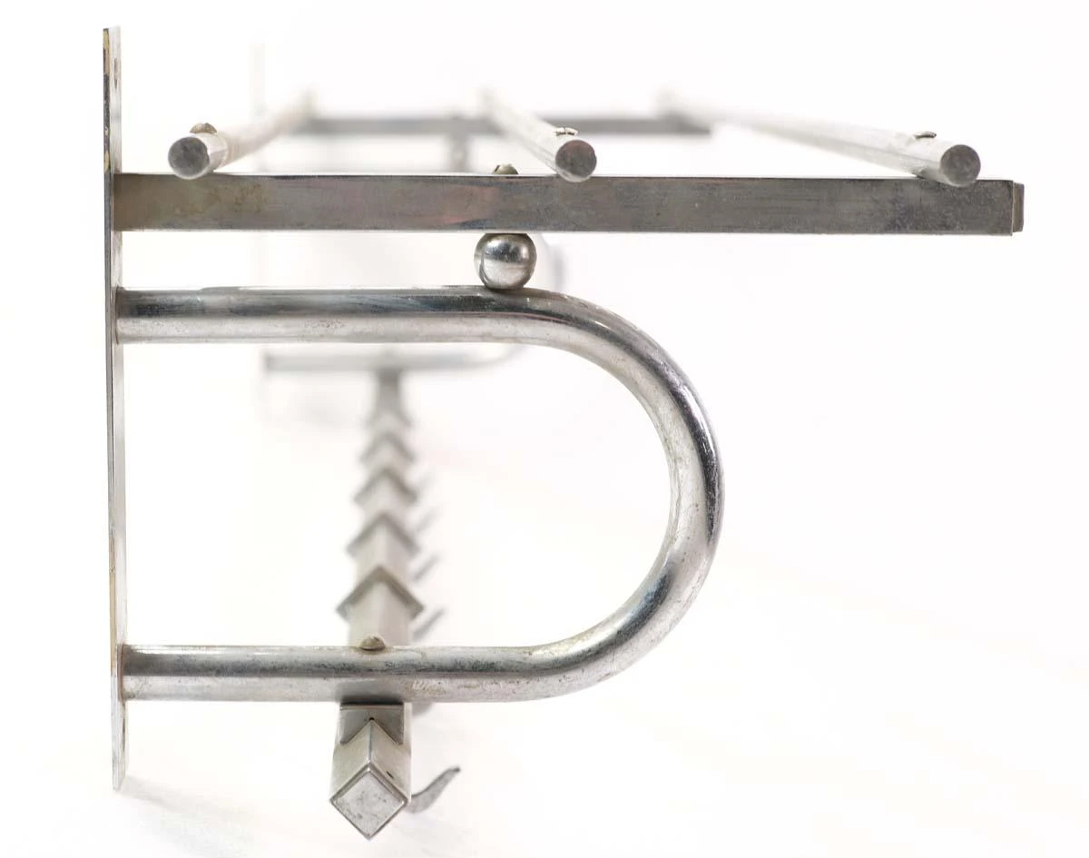 Vintage European brass train rack with nickel plating. The rack has three bars across the top and six small hooks …