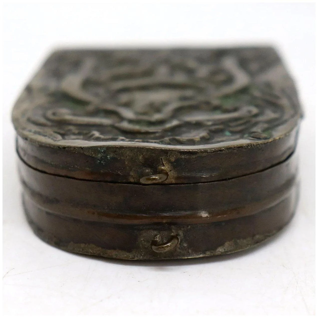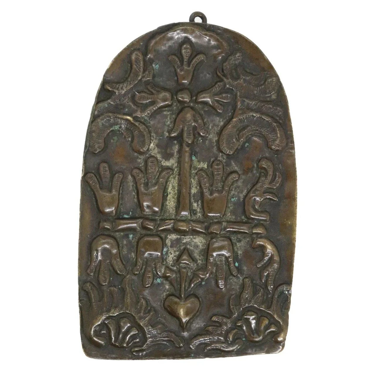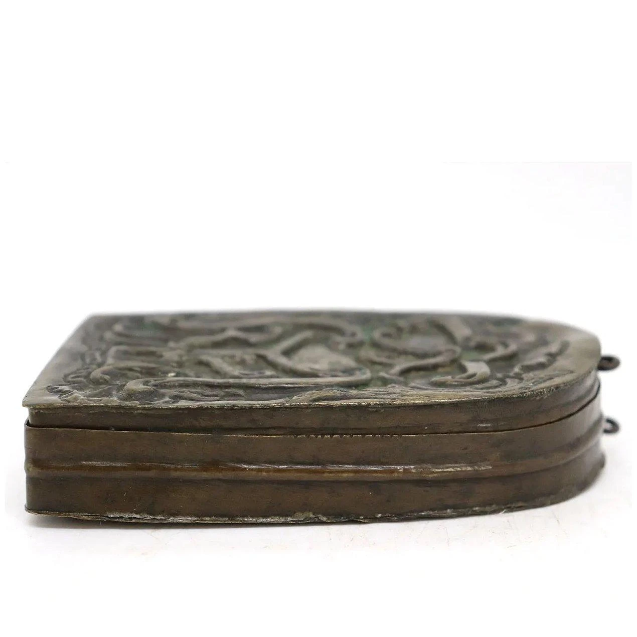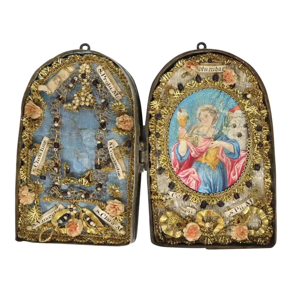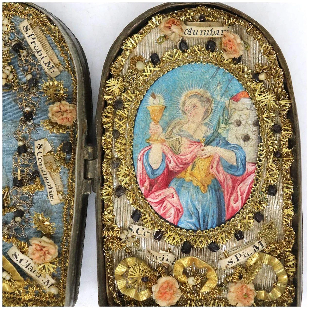 The antique arched top brass case opens to reveal the image of a female saint surrounded by small scrolls with …