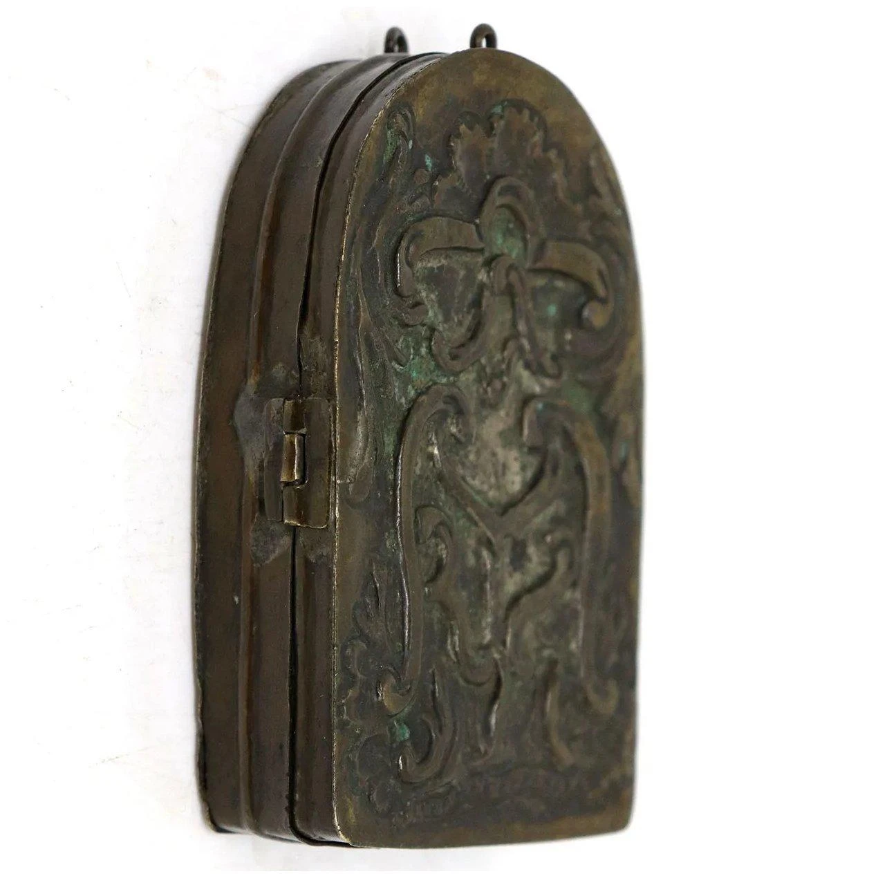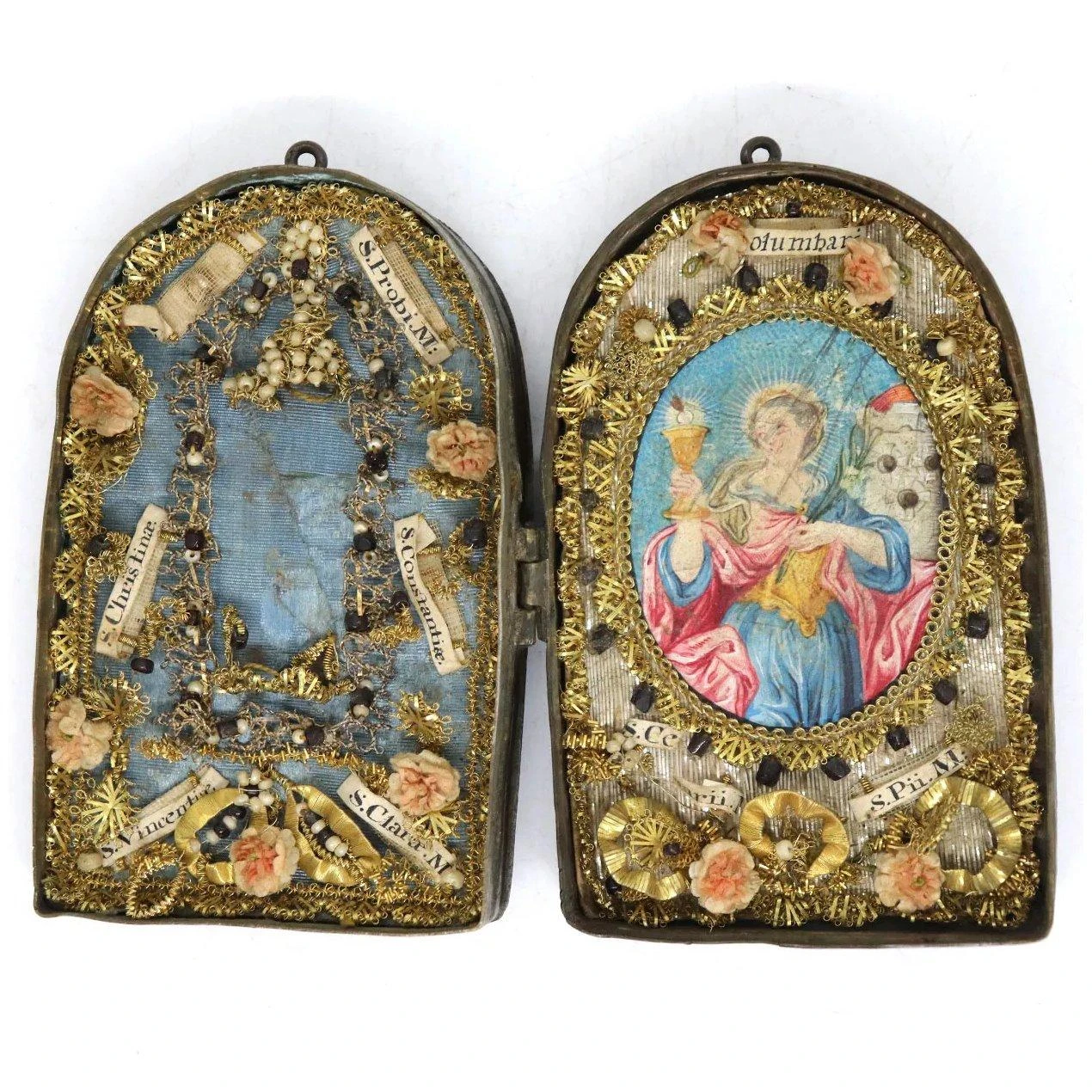 The antique arched top brass case opens to reveal the image of a female saint surrounded by small scrolls with saints names including: S. Probi.M:, S. Christina, S. Constantine, S. Vincentine, S. Clara, Columbari, S. Pii. M:. This small, religious reliquary case was made for transport and was carried by the owner.