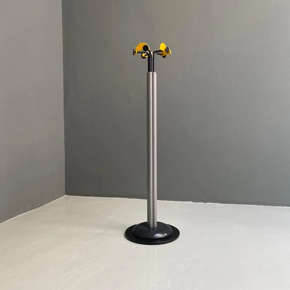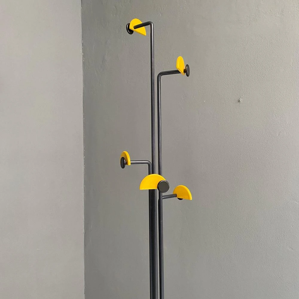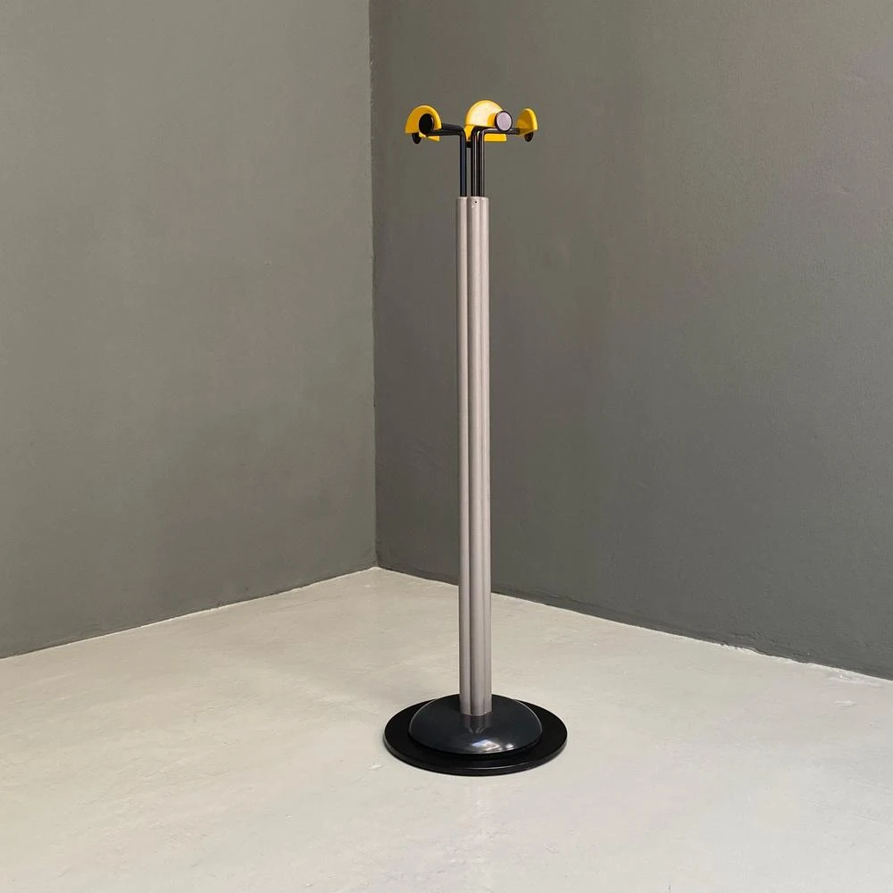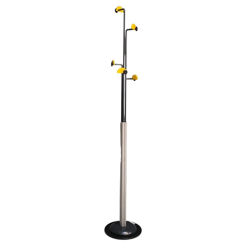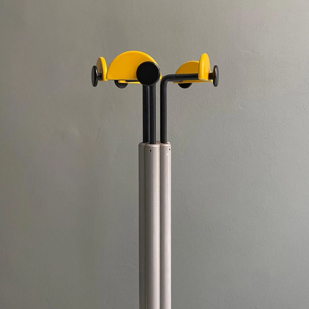Italian modern plastic and metal floor coat hanger from Bieffeplast, 1980s Floor coat hanger with arms adjustable to different heights, in metal and plastic colored in yellow, gray and black. Made by the Bieffeplast company. 1980s. Good conditions Measures in cm 36x205h. This piece is attributed to the mentioned designer/maker. It has no attribution mark and no