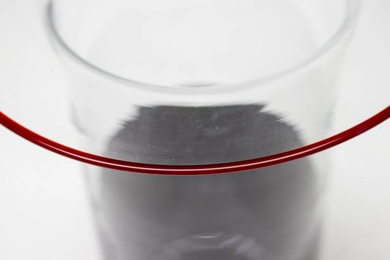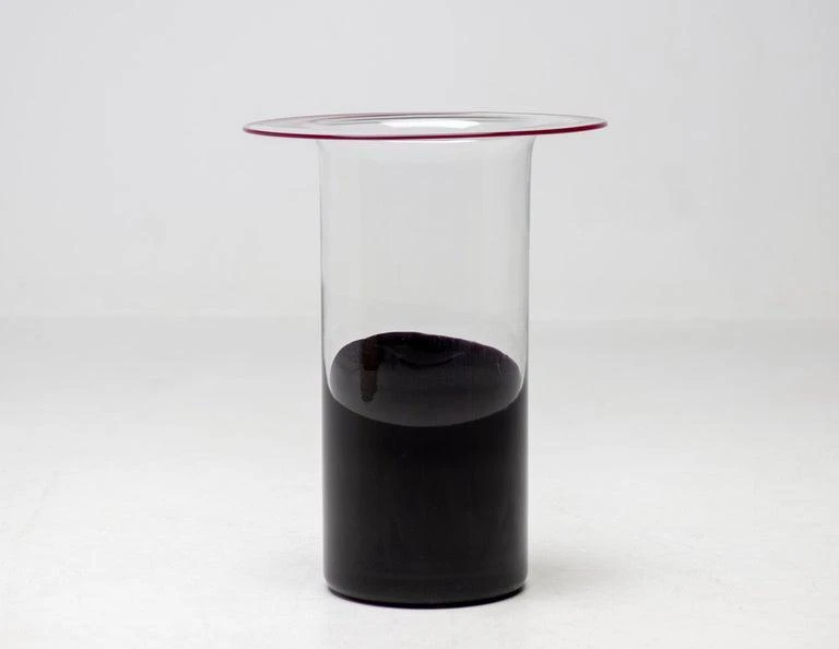 Beautiful Vistosi cylinder hat shaped vase in clear glass with partial black glass at the bottom and a red glass edge. Designer Alessandro Pianon started working for Vistosi in 1956 and founded his own design office in 1962. Vistosi is one of the oldest glassblowing families, their roots date back to the 18th century. In 1945, Guglielmo Vistosi opened a manufacture of innovative design and concepts of production. The industrial design fascinated Vistosi. He connected this with local glass-making techniques. After his death in 1952, his younger brother Oreste Vistosi acquired the company, assisted by the sons Gino and Luciano. The factory now specialised in light objects. His nephew and external artists worked in the factory, such as Peter Pelzel, Alessandro Pianon or Fulvio Bianconi. In 1963, a big exhibition took place in the Danese Gallery. In the same year, the factory received the Golden Compass Award for a series of cylindrical vase with spirals. I have official proof of authenticity such as vintage catalogs,