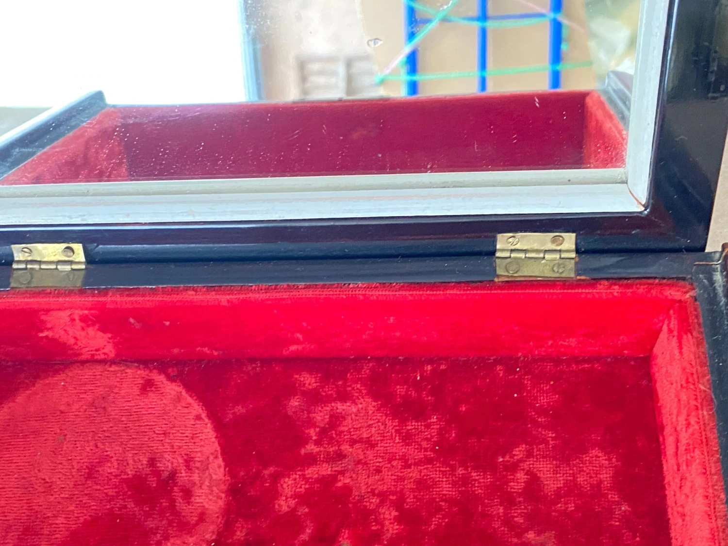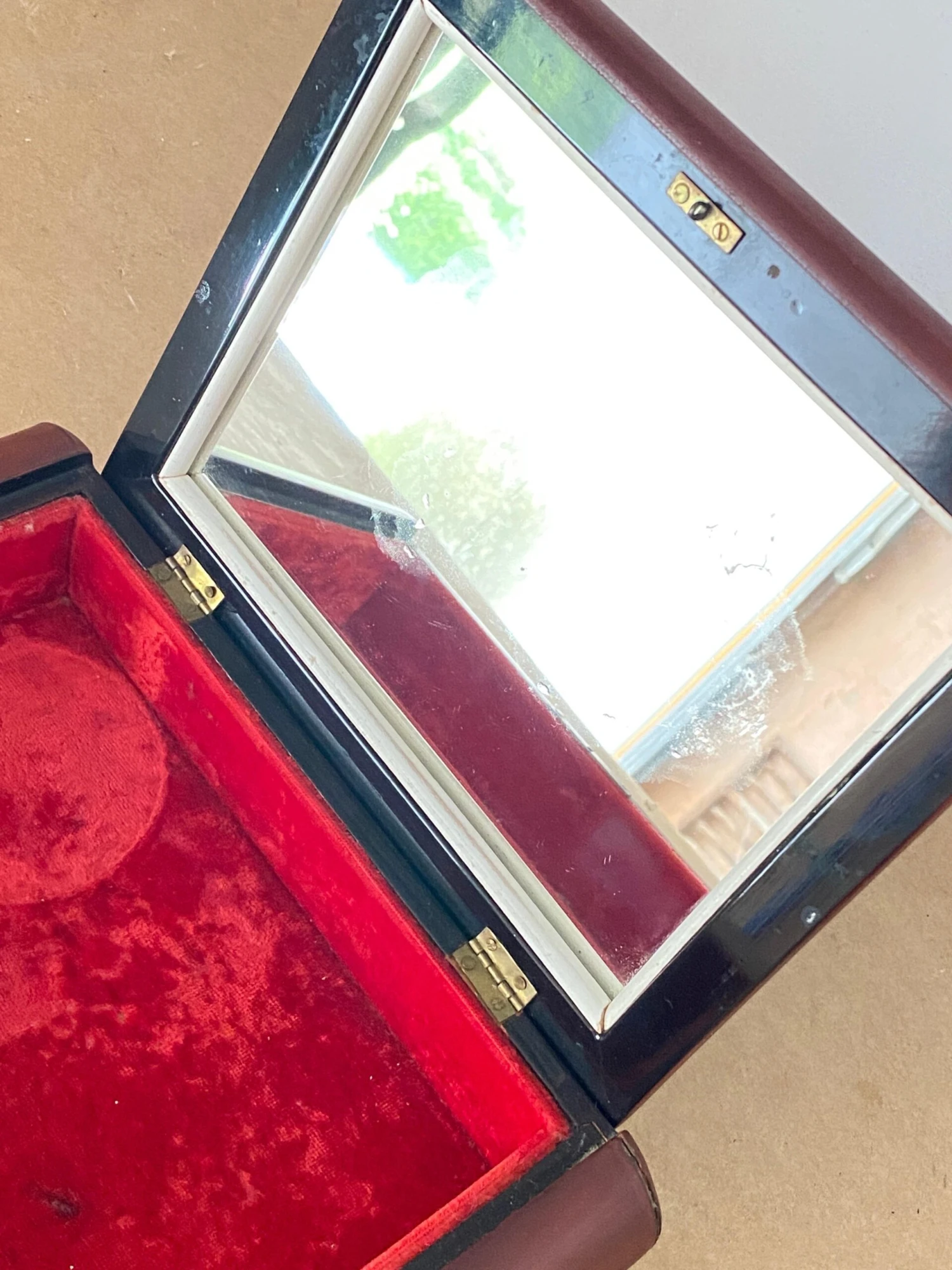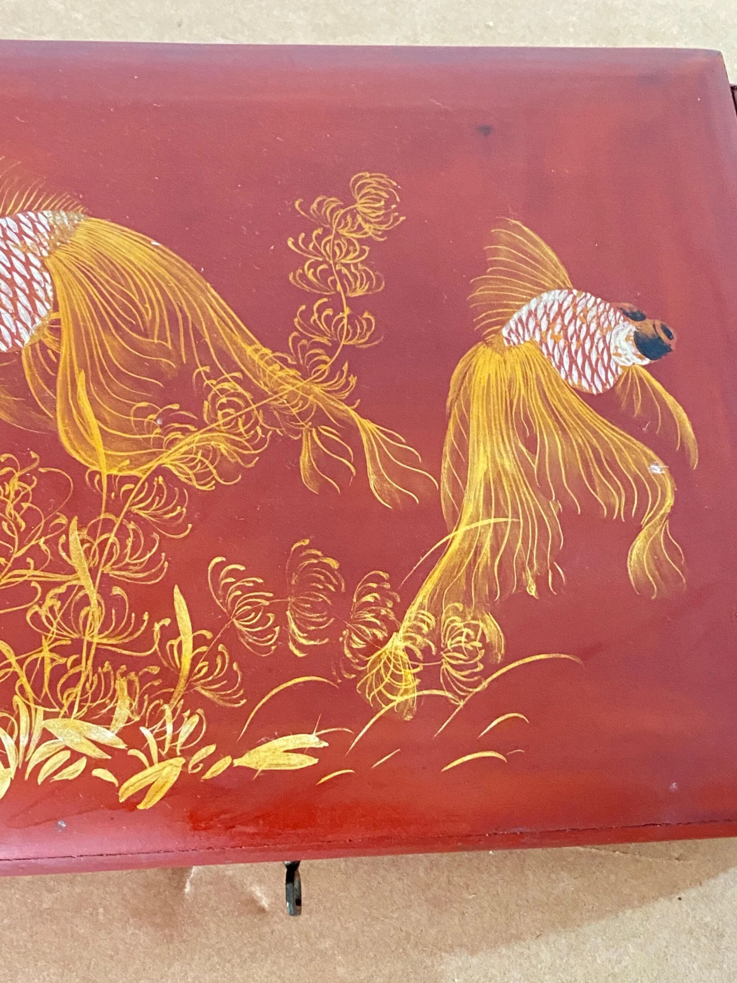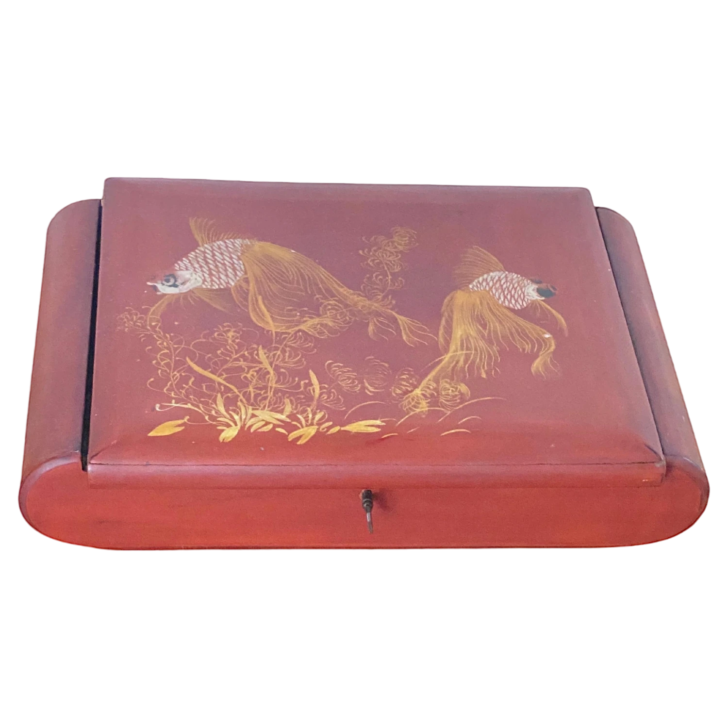 Large box from Vietnam. Manufactured at the end of the 19th century. Red in color slightly pinkish, with magnificent fish decorations in white and yellow colors. This box locks, the system works. Inside on the inner fold-out panel is a mirror that allows you to look at yourself as you try on your jewellery, for example.