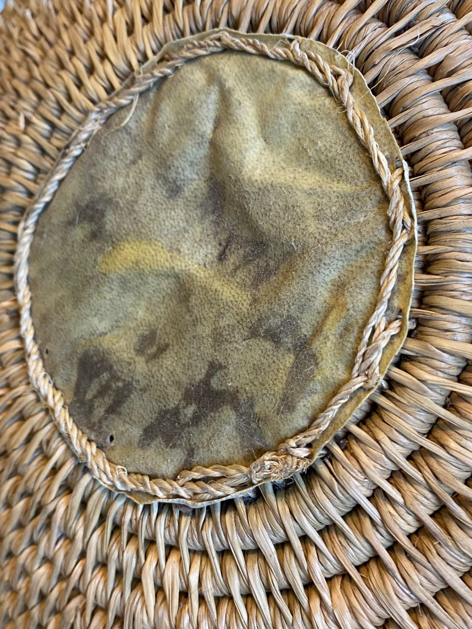 Set of 2 HUGE Vintage handwoven Papago/Tohono O’Odham Bowl Baskets have geometric designs and especially high quality well-made collectibles with VERY RARE hand sewn hide reinforced bottoms. Fine collection of two EXCELLENT condition Papago Indian baskets.
