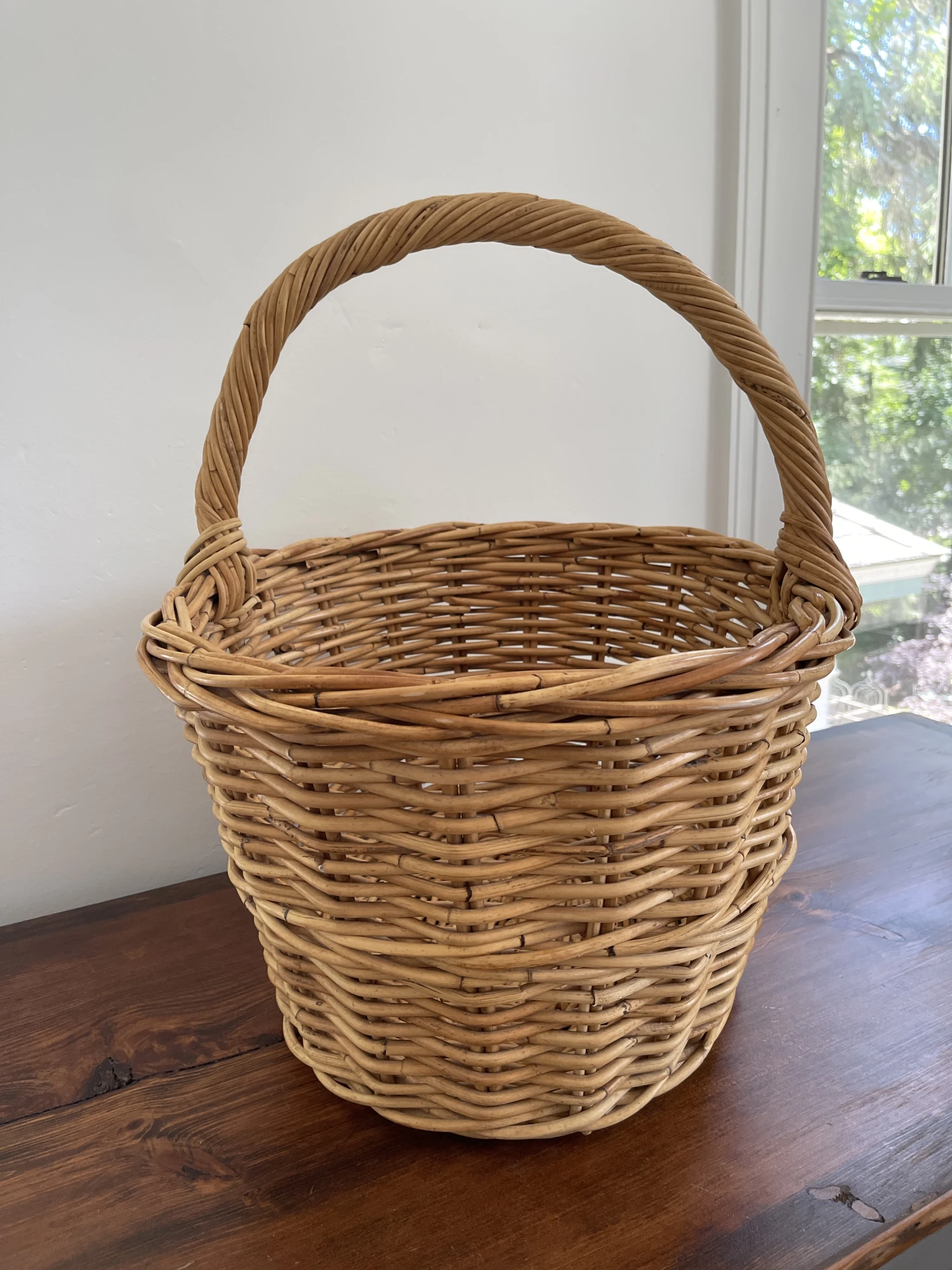 Large handwoven wicker/reeded basket. Large enough for blankets, throw pillows or anything else you’d like to store.