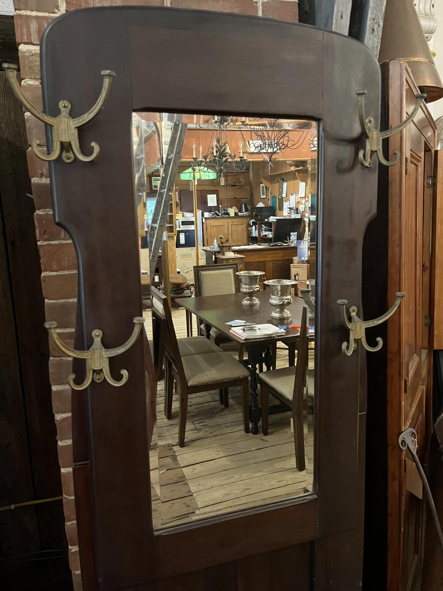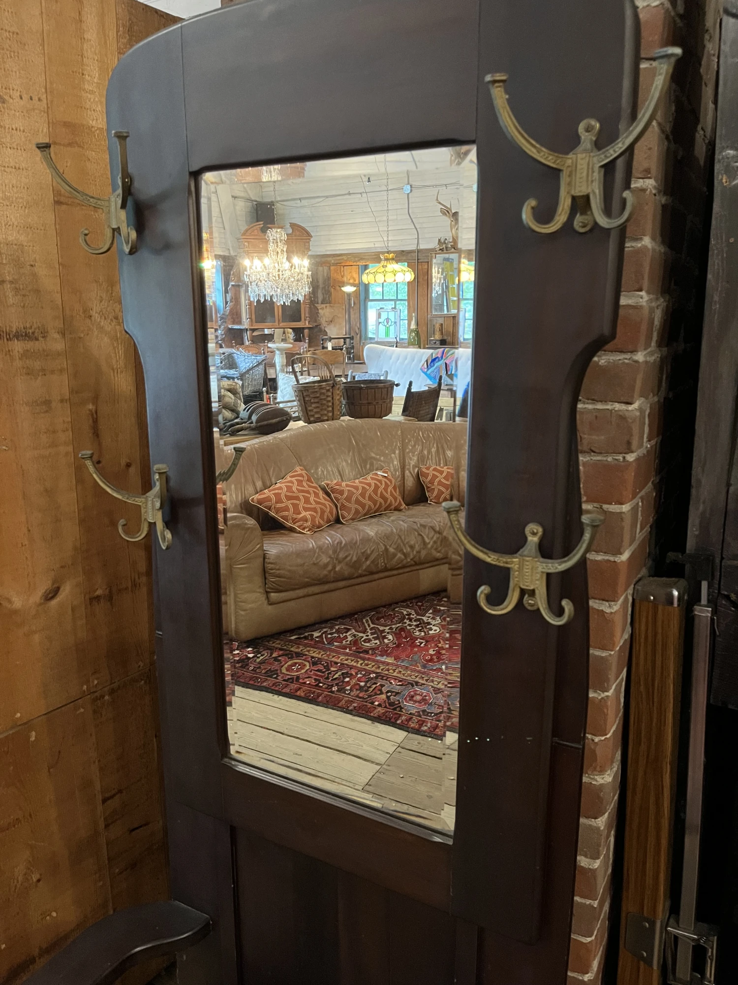 Antique Mahogany Hall Tree with Beveled Mirror and Storage Seat. Dimensions: W: 29.5″ x D: 16″ x H: 73.5″, Seat Dimensions: W: 22.5″ x D: 15″ x H: 16.5″