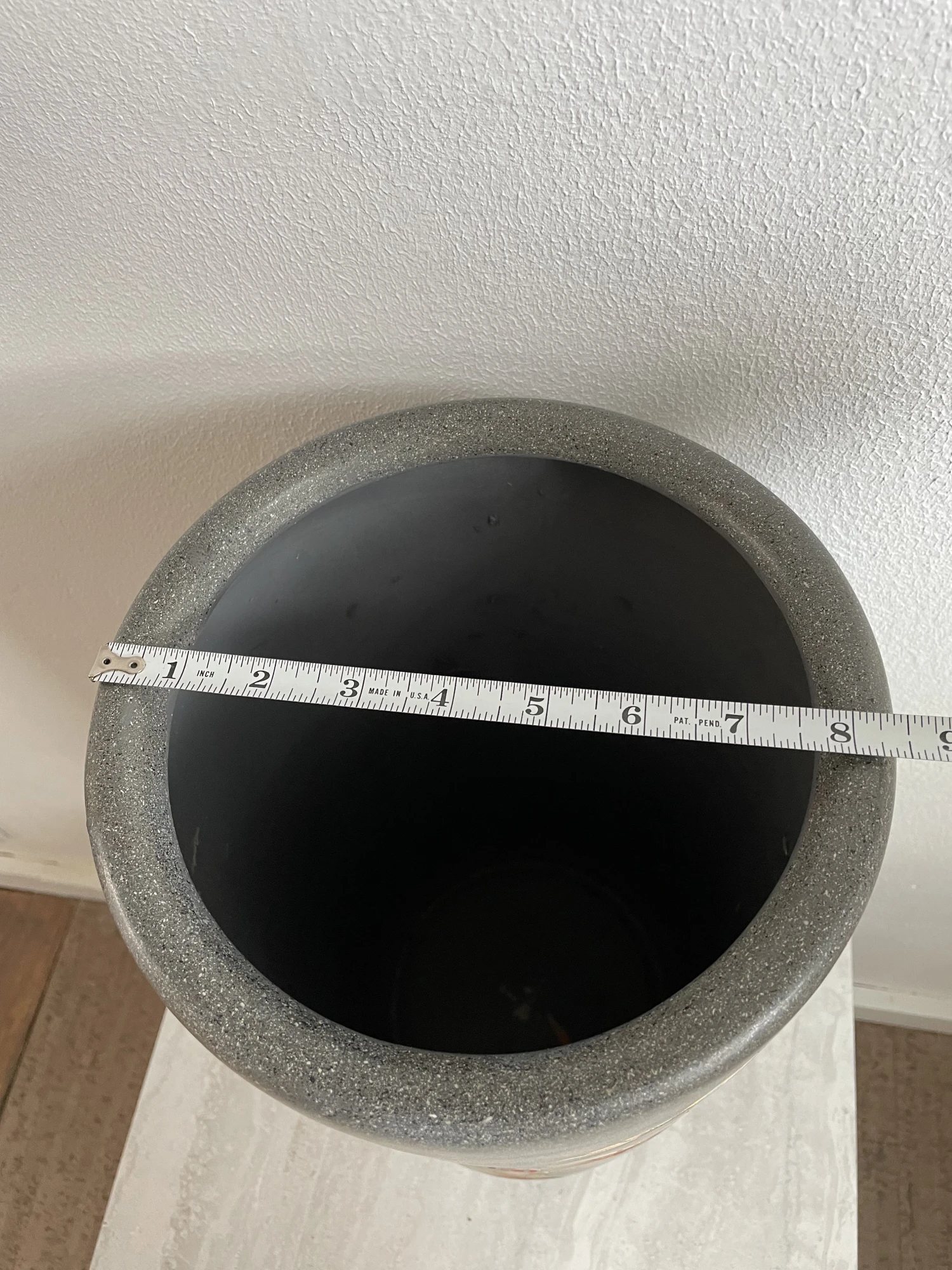 Vintage tall ceramic floor vase or umbrella stand featuring a stylized art deco Japanese motif with Geisha and cranes.