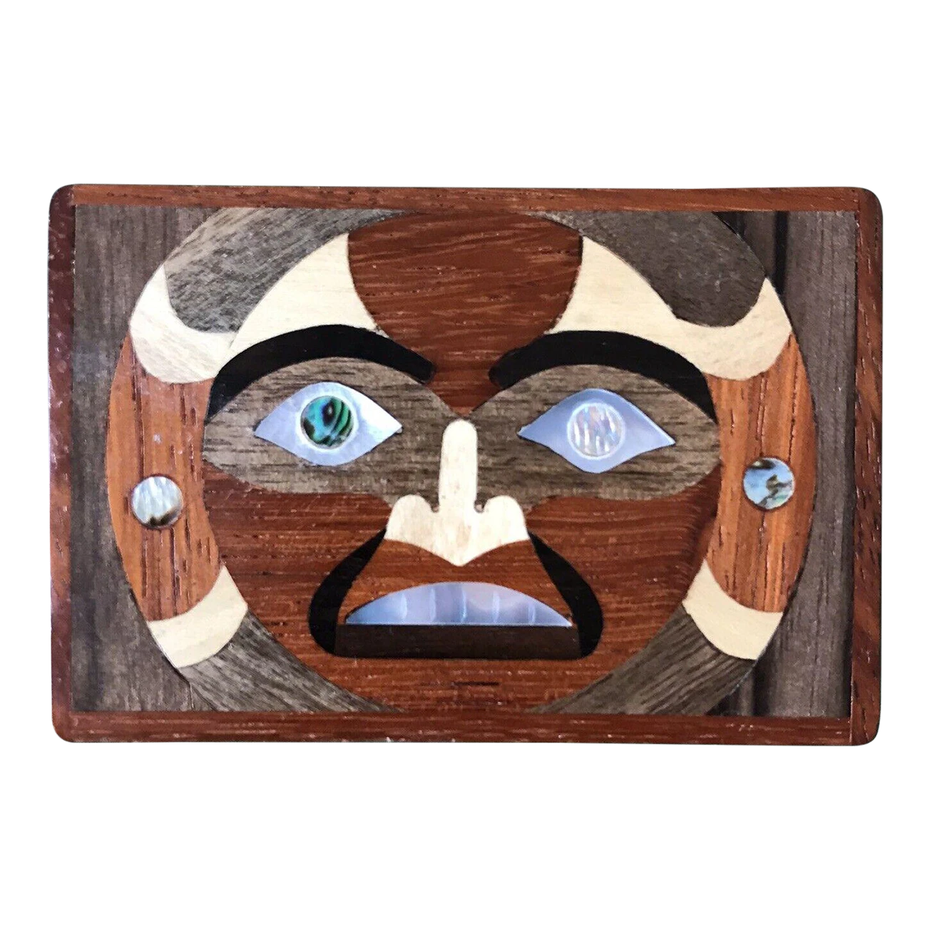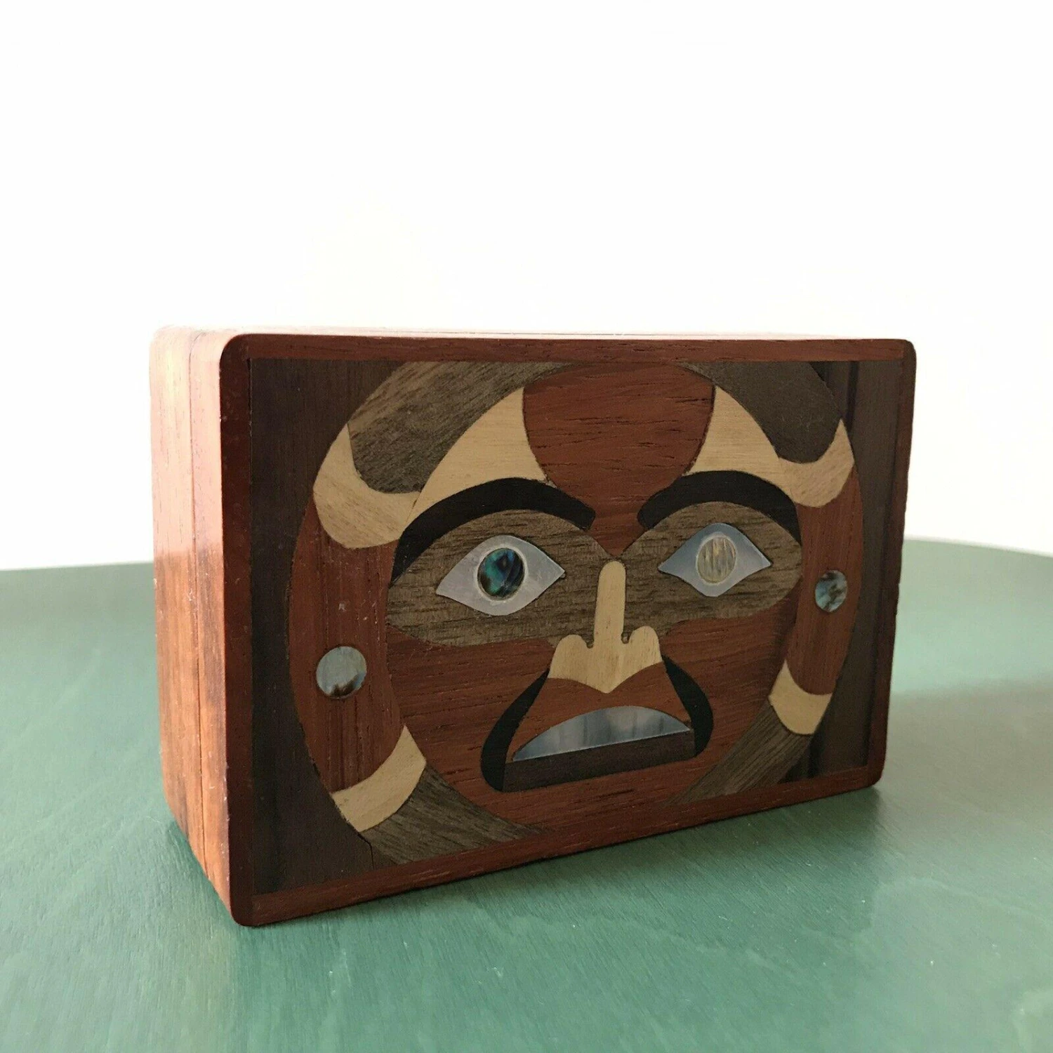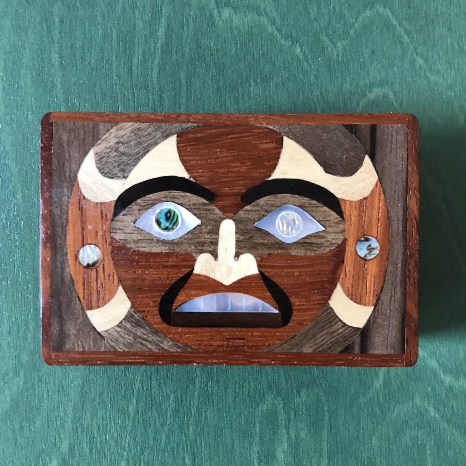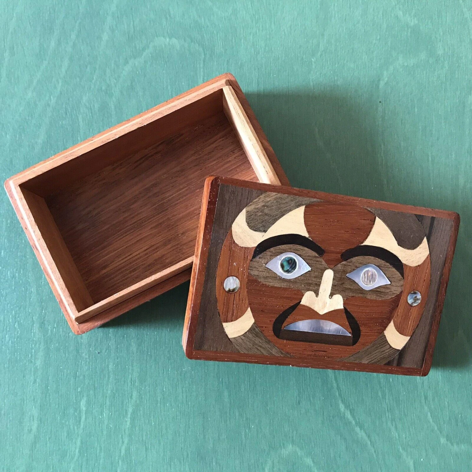 Meticulously handcrafted wooden trinket box that features a face made out of inlaid wood and abalone. A very unique piece …