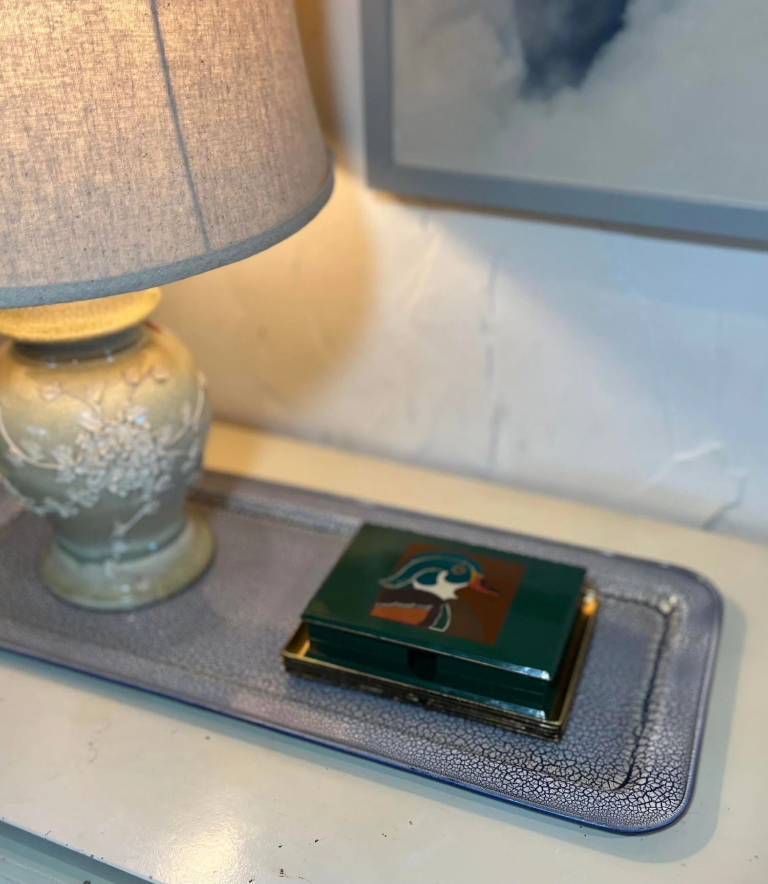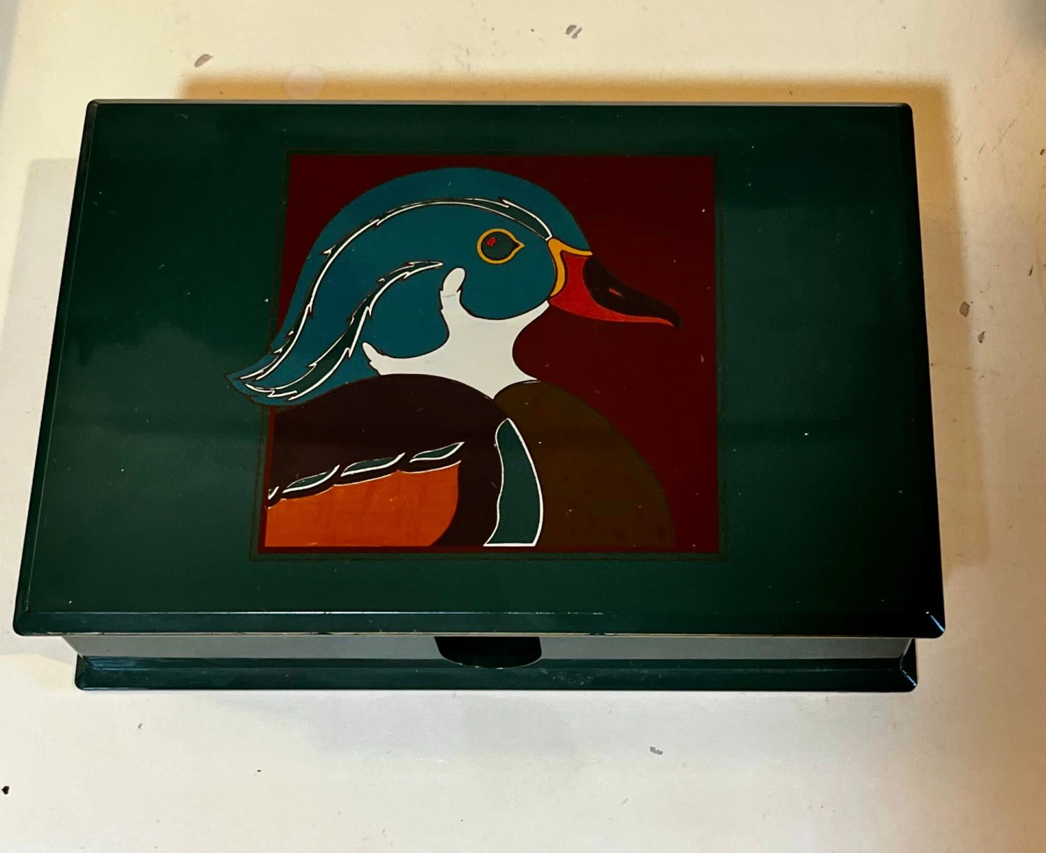 This handsome hunter green lacquer box with a wood inlay of a mallard duck head is the perfect addition to …