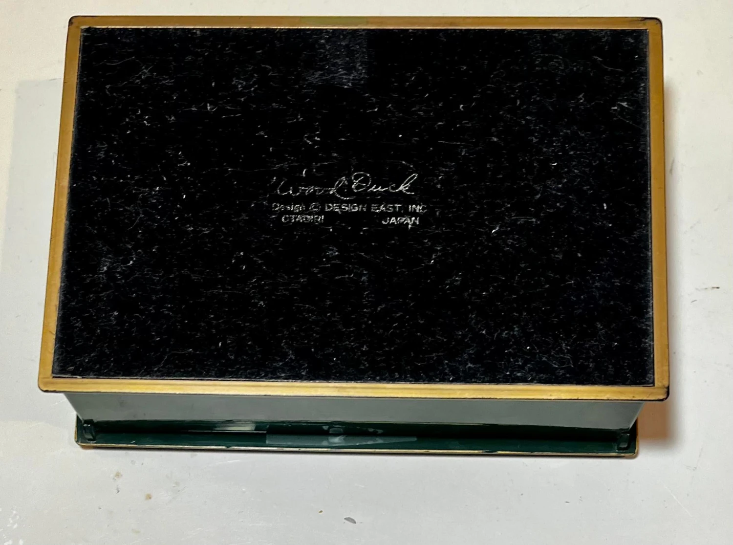 This handsome hunter green lacquer box with a wood inlay of a mallard duck head is the perfect addition to your decor. Set it on an entry table for trinkets, an end table for matches or cards, or on a gentleman’s dresser for cufflinks etc. It will be eye catching any place you put it. The colors and details are perfection, and it includes a soft black felt bottom with the makers mark and style listed as “Wood Duck”