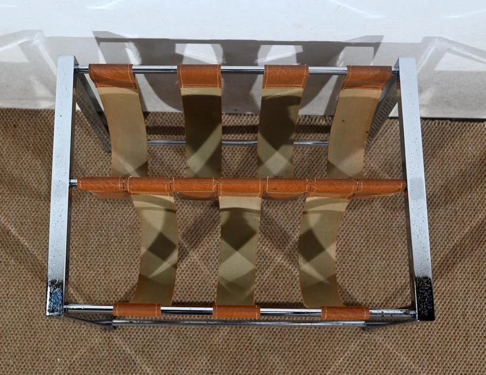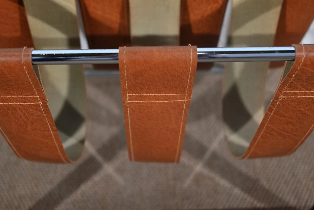 It has seven straps in brown cowhide leather, forming two storage spaces.