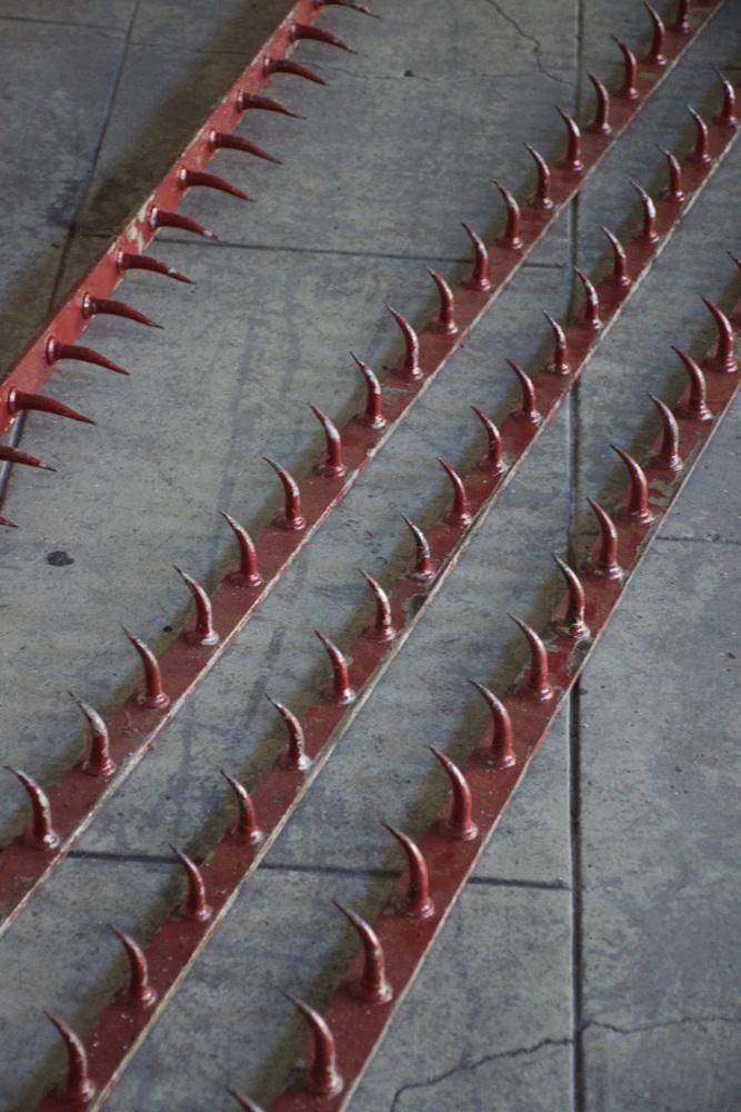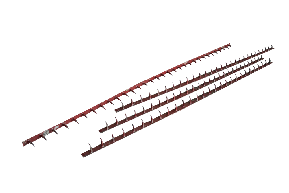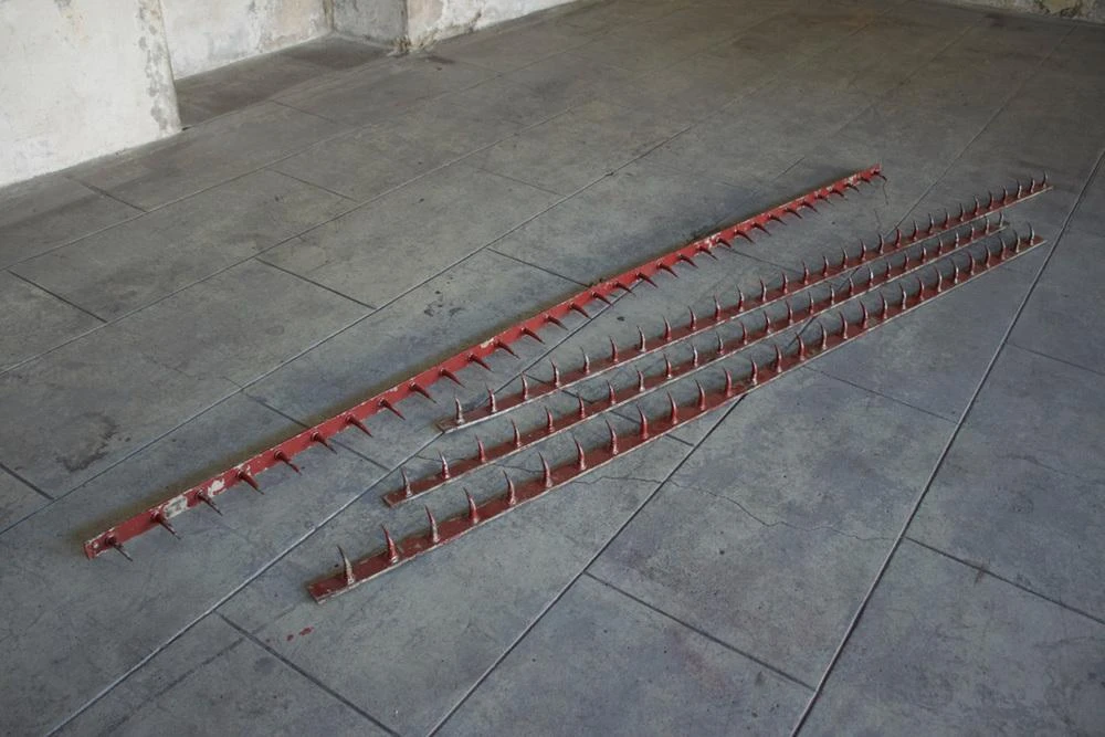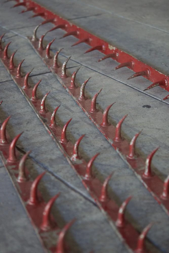 Butcher’s cross in red metal. The first bar is 319 cm long, 10 cm high, 5 cm deep. The second bar is 290 cm long, 9 cm high, 4 cm deep. The third bar is 286 cm long, 9 cm high, 5 cm deep. The fourth and last bar measures 260 cm in length, 7 cm in height, and 3.5 cm in depth.