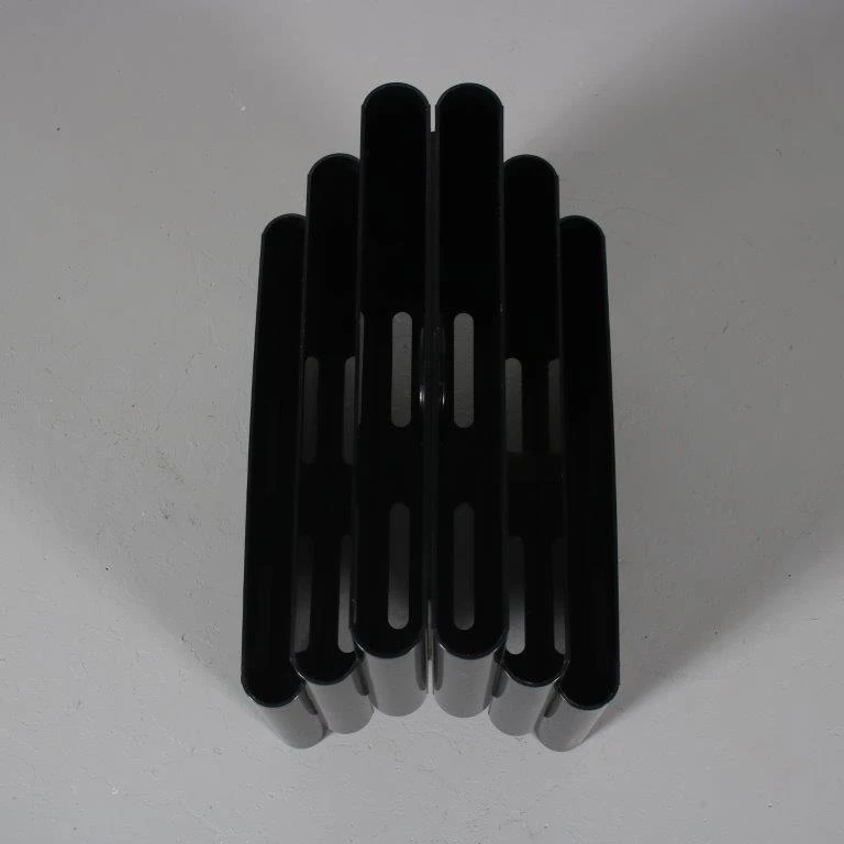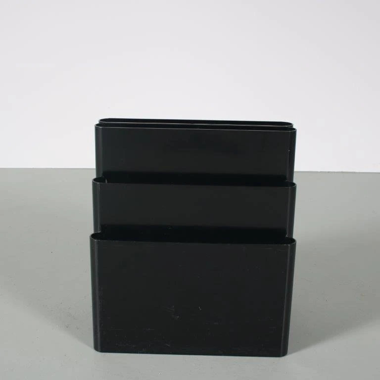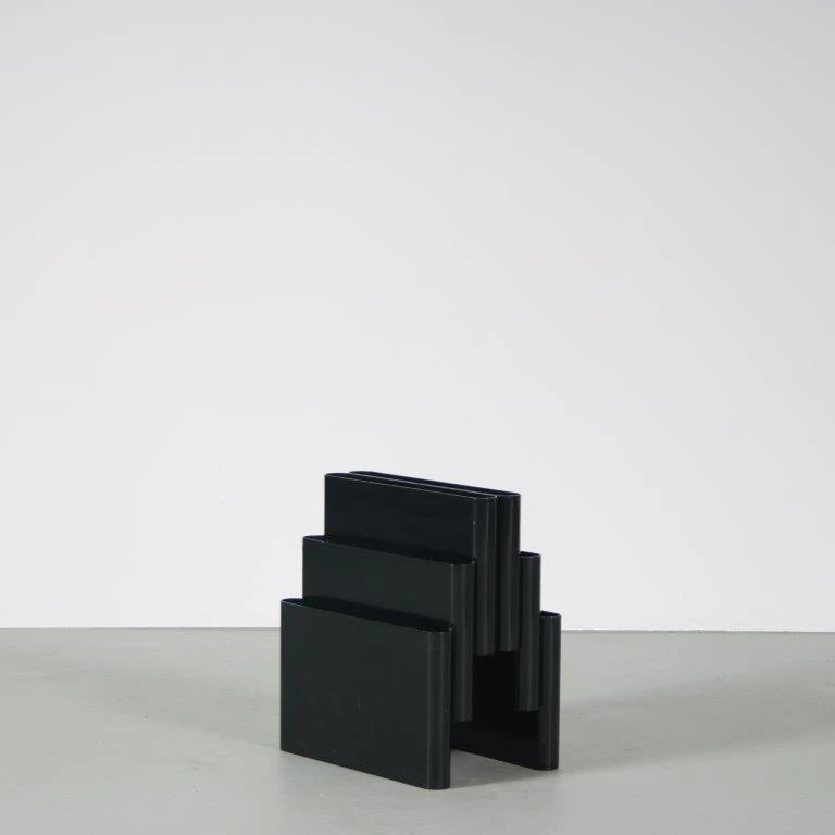 Made entirely of black plastic, which is a typical choice for mid-century Italian design. It has three storage compartments on different heights at each side.Combined, this creates a nice pyramid like shape that adds a wonderful appeal to the design. The round finish of the corners are a nice finishing touch. A wonderful accessory to the interior!