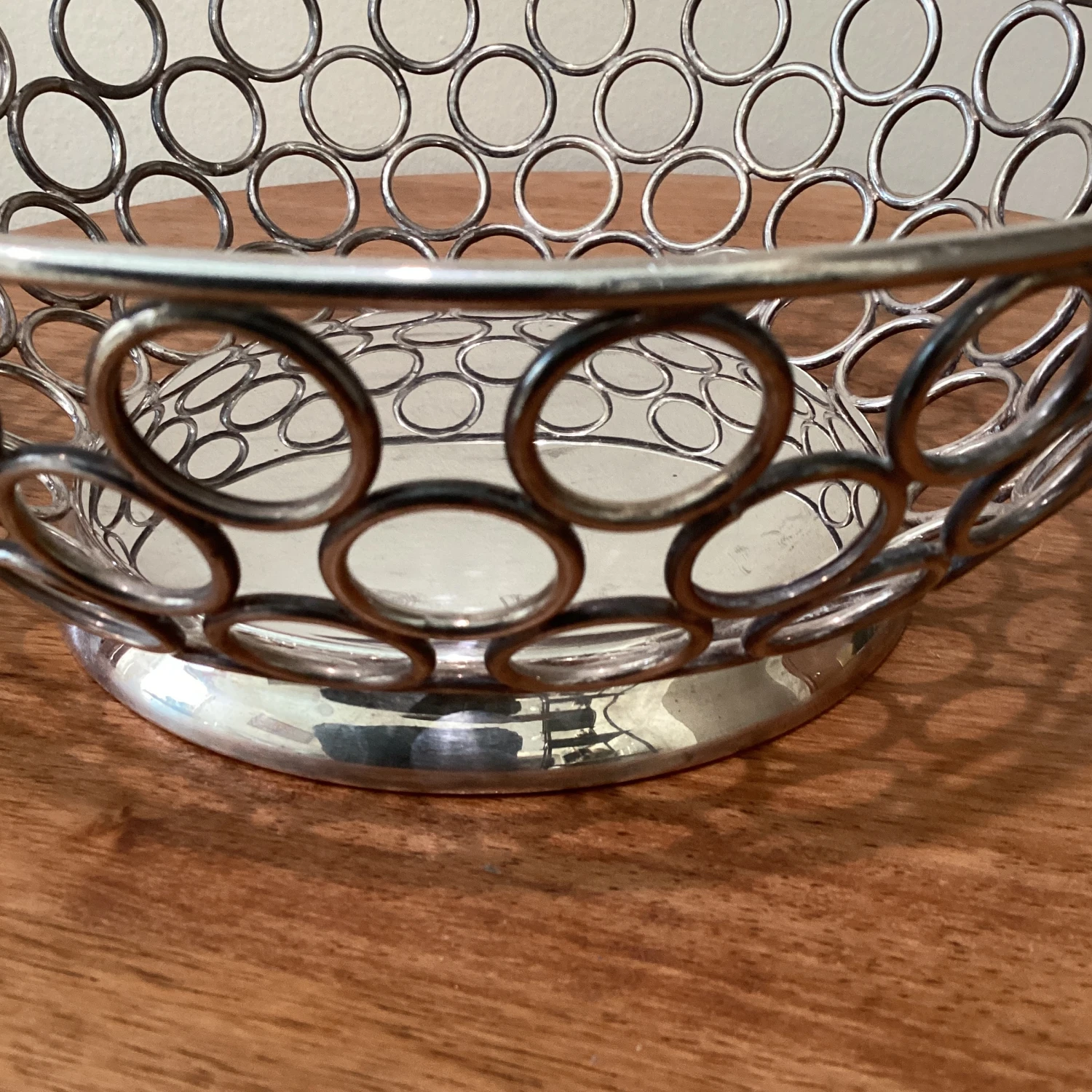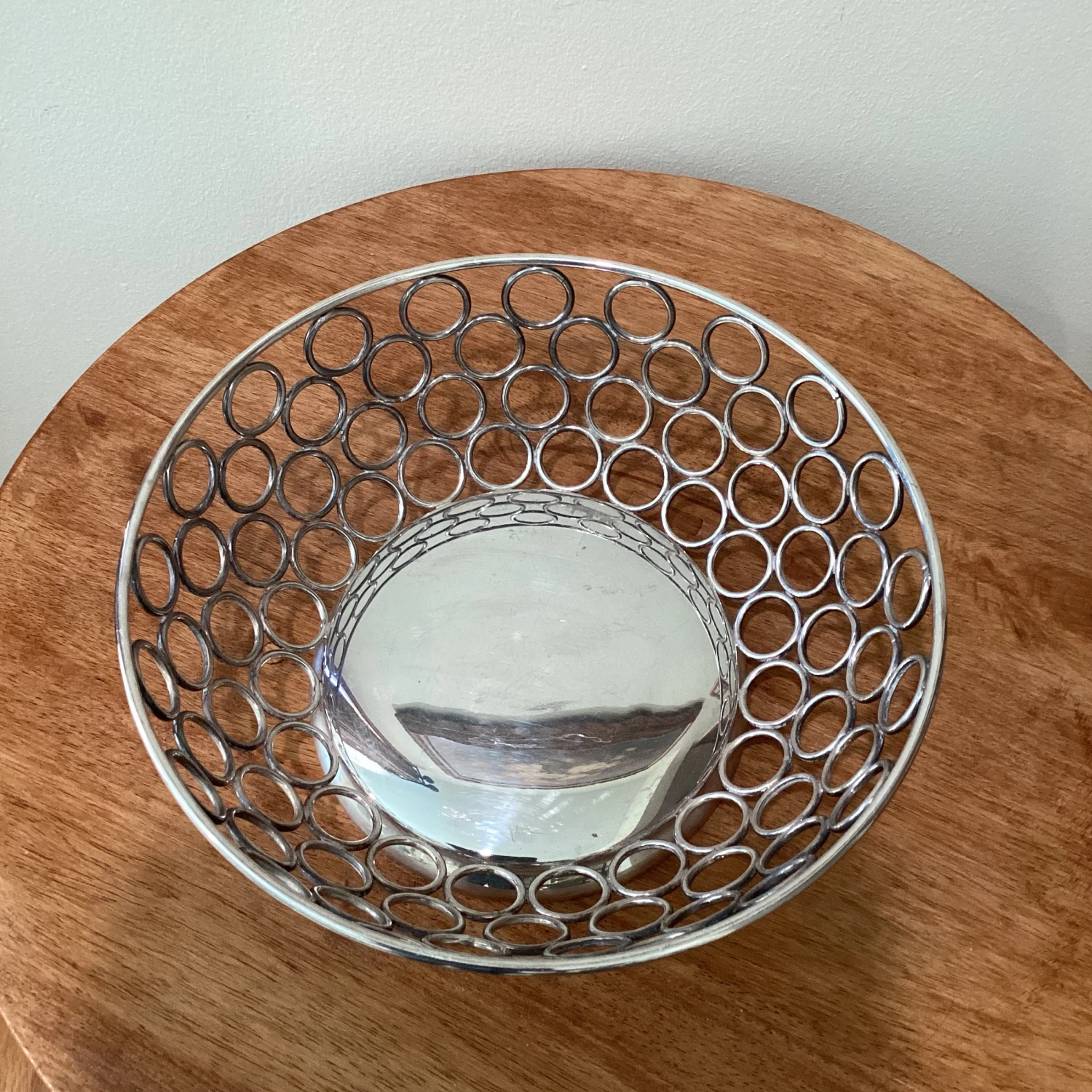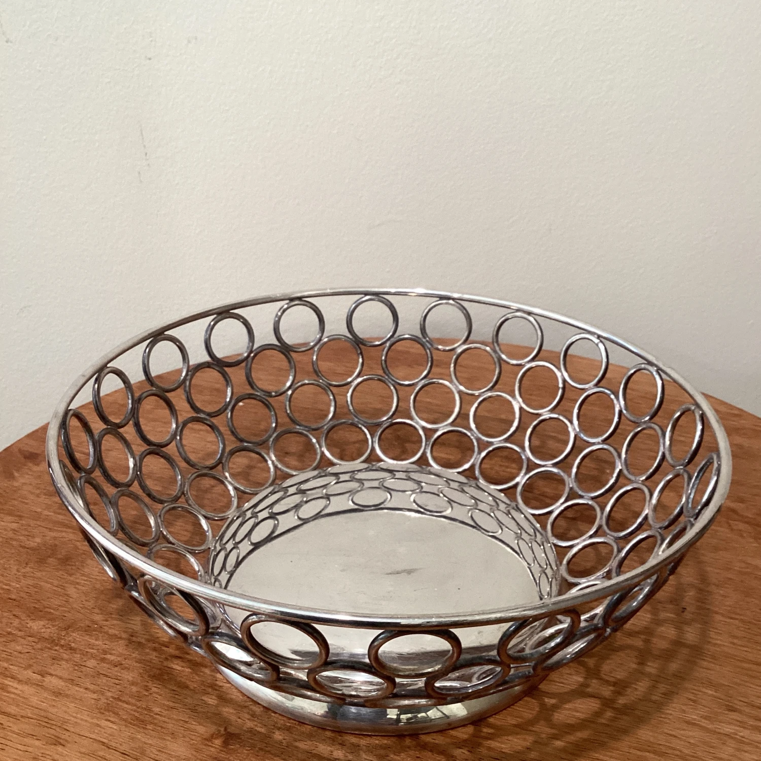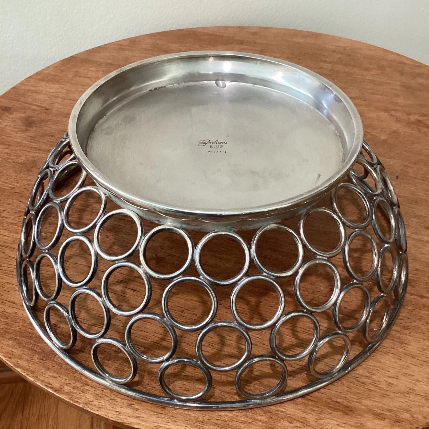 This Mid- Century Modern silver plate bowl or basket, This peace reads as quintessentially of the period with its myriad curvilinear forms,including the domed bottom and myriad touching circles, this peace would make an excellent fruit bowl, bread basket,or a sophisticated object d’art atop an occasional table or etagere , signed “ Gorham E .P. YC 744 – 1 .