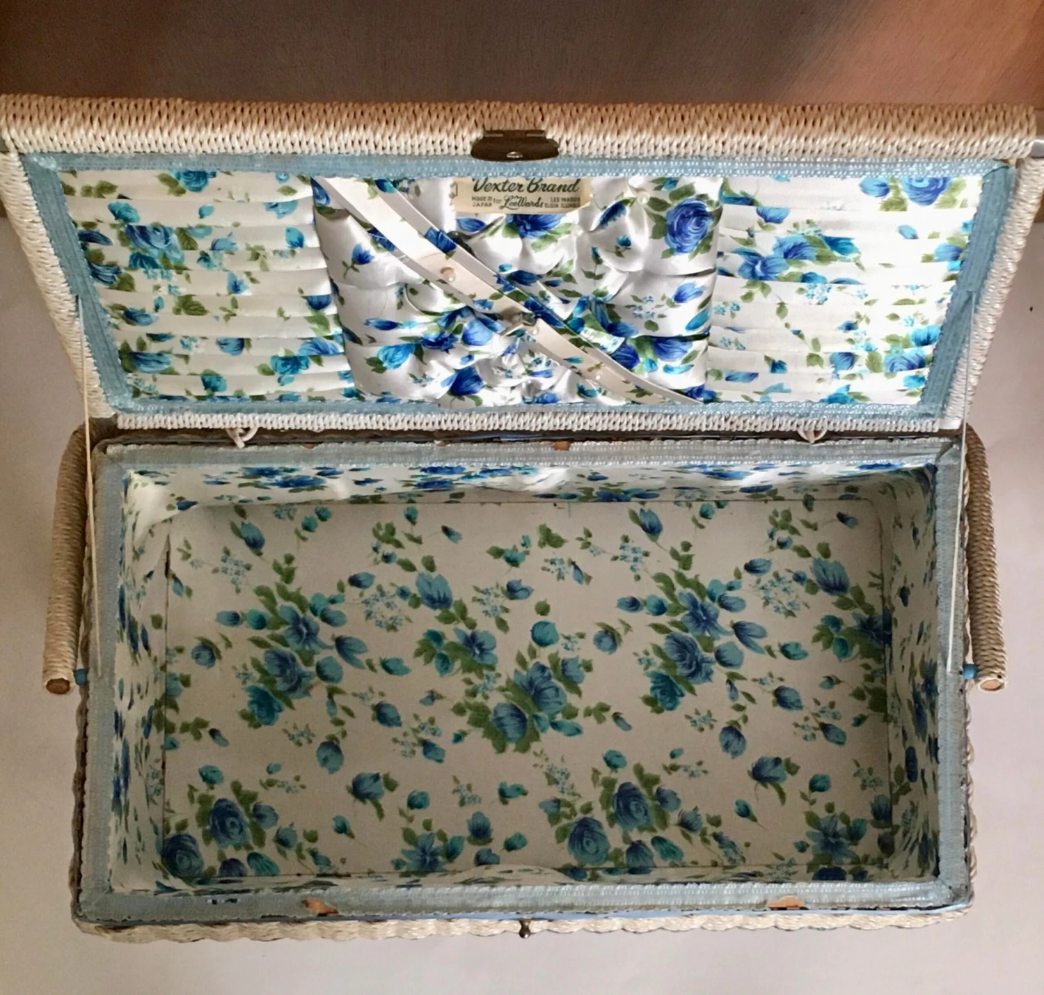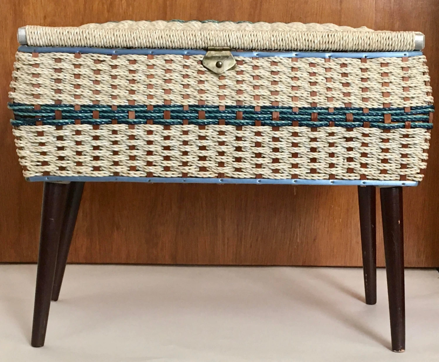 A classic mid 20th century footed sewing box with interior in excellent condition and exterior in very good condition.