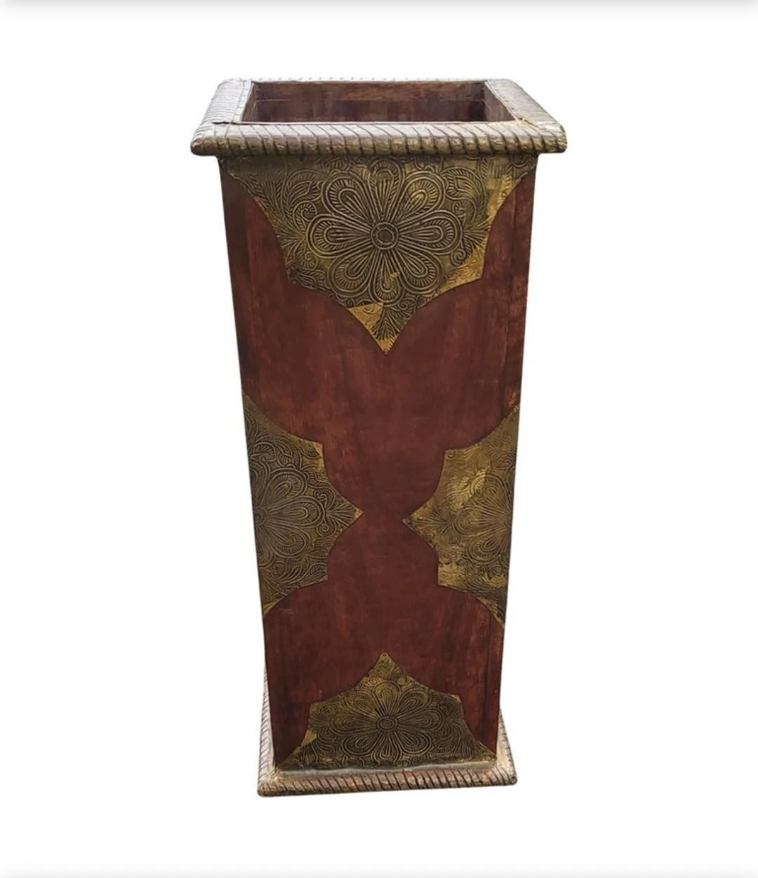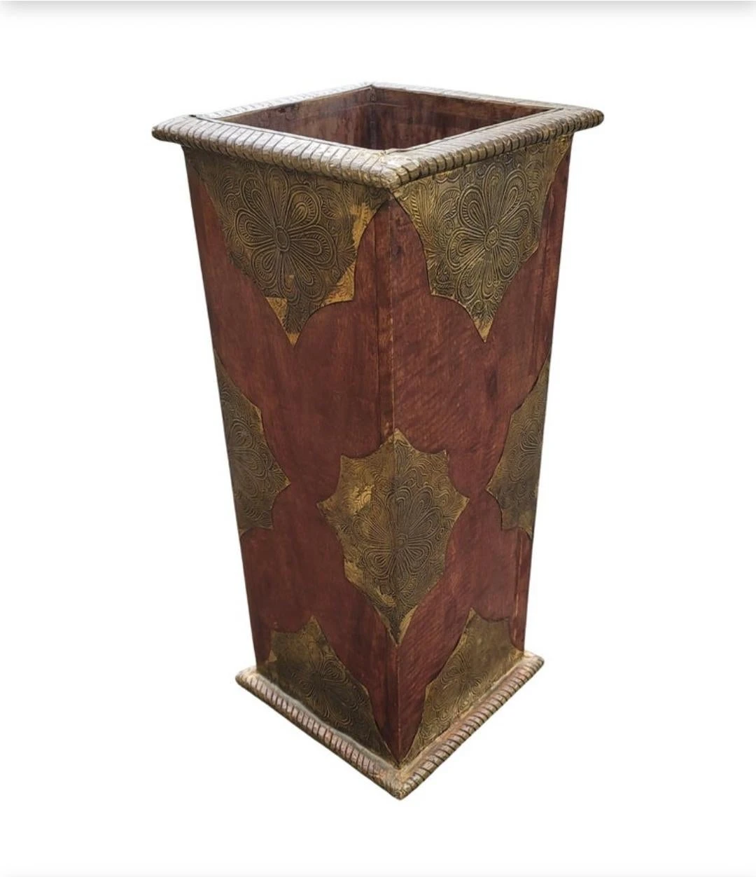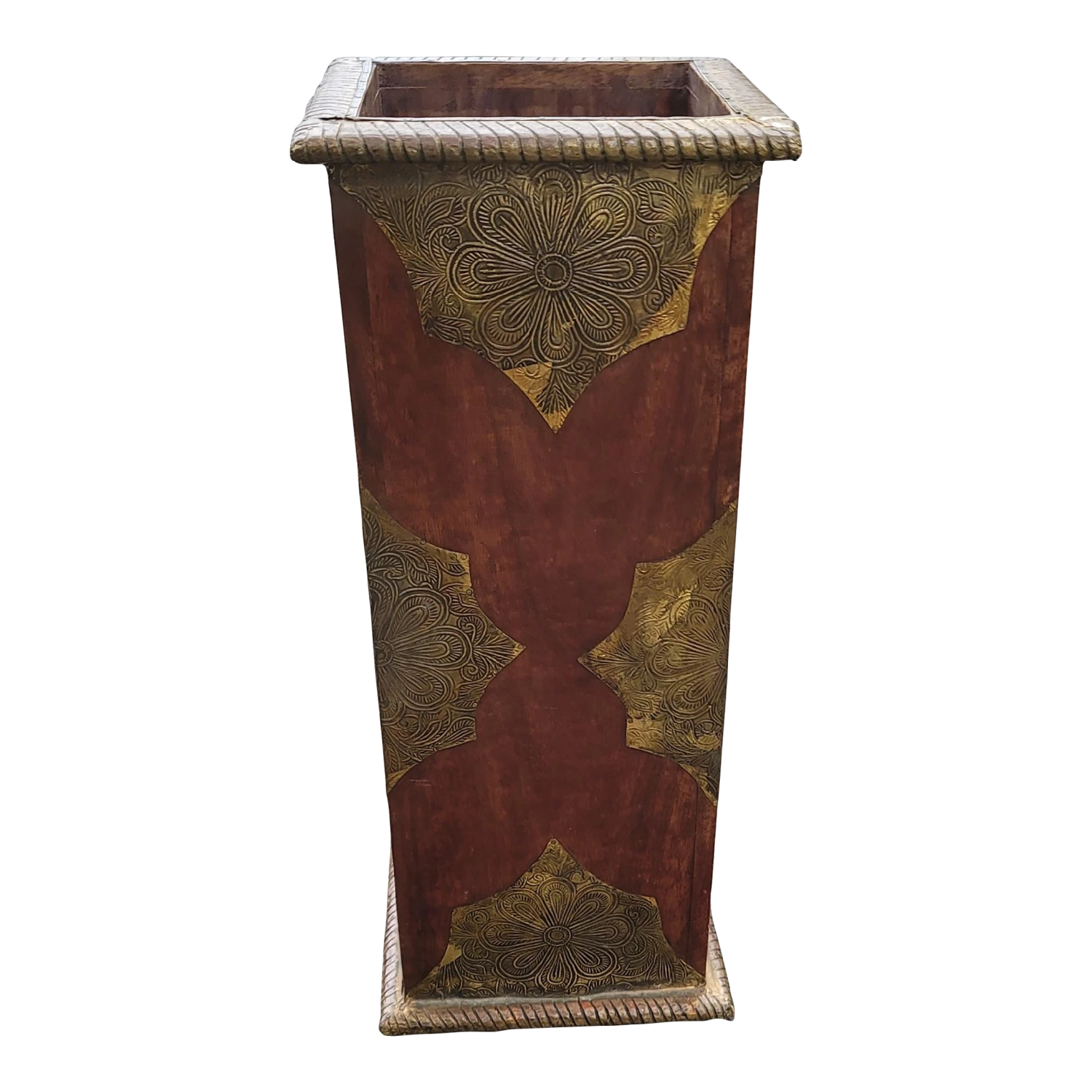 A Mid-Century Modern Mango Wood Ornate with Mounted Brass Sheeting Umbrella Stand in good vintage condition.