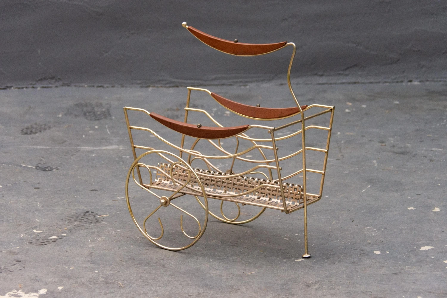A fun mid century brass wire frame chariot magazine rack with functional wheels.