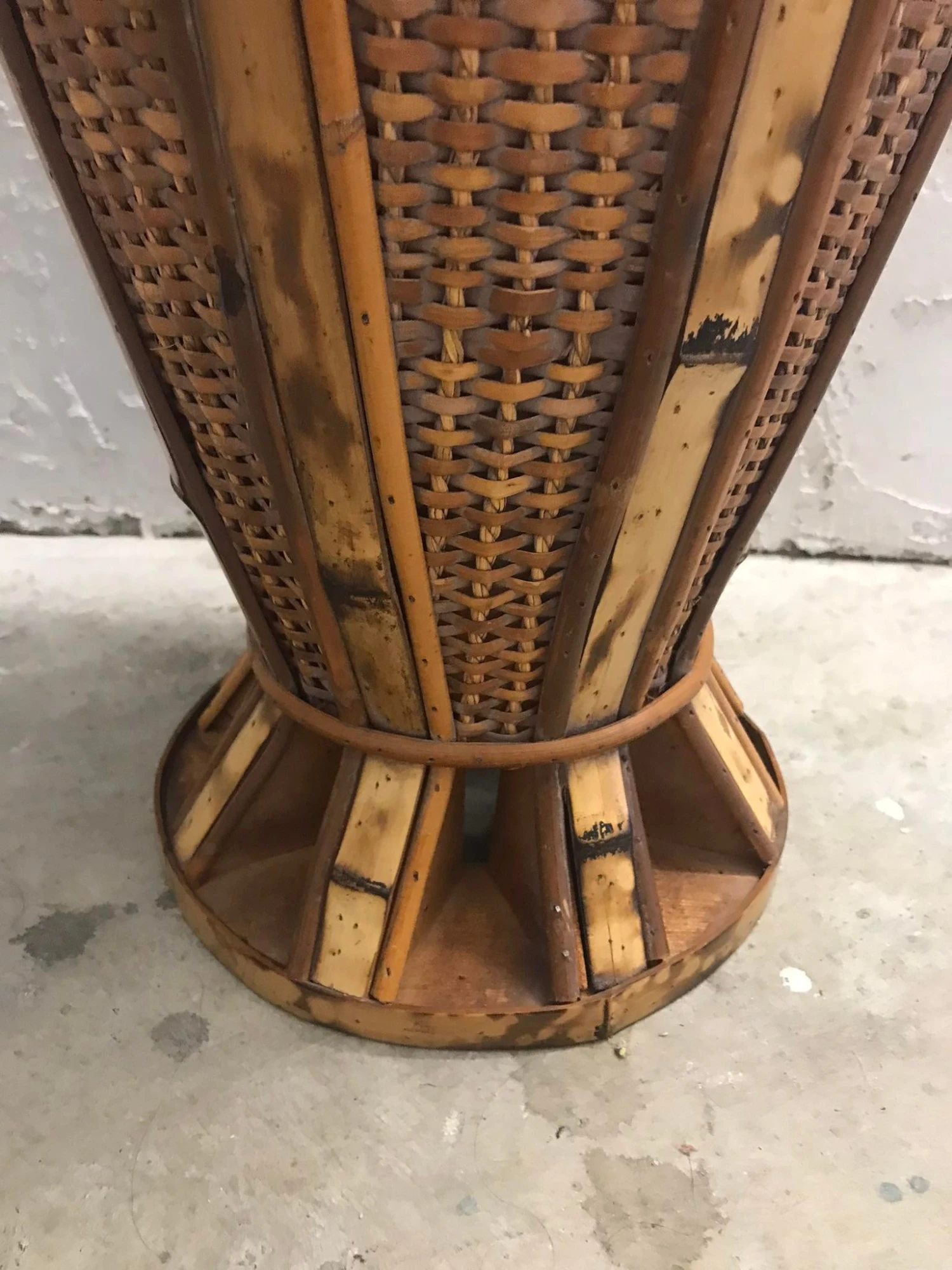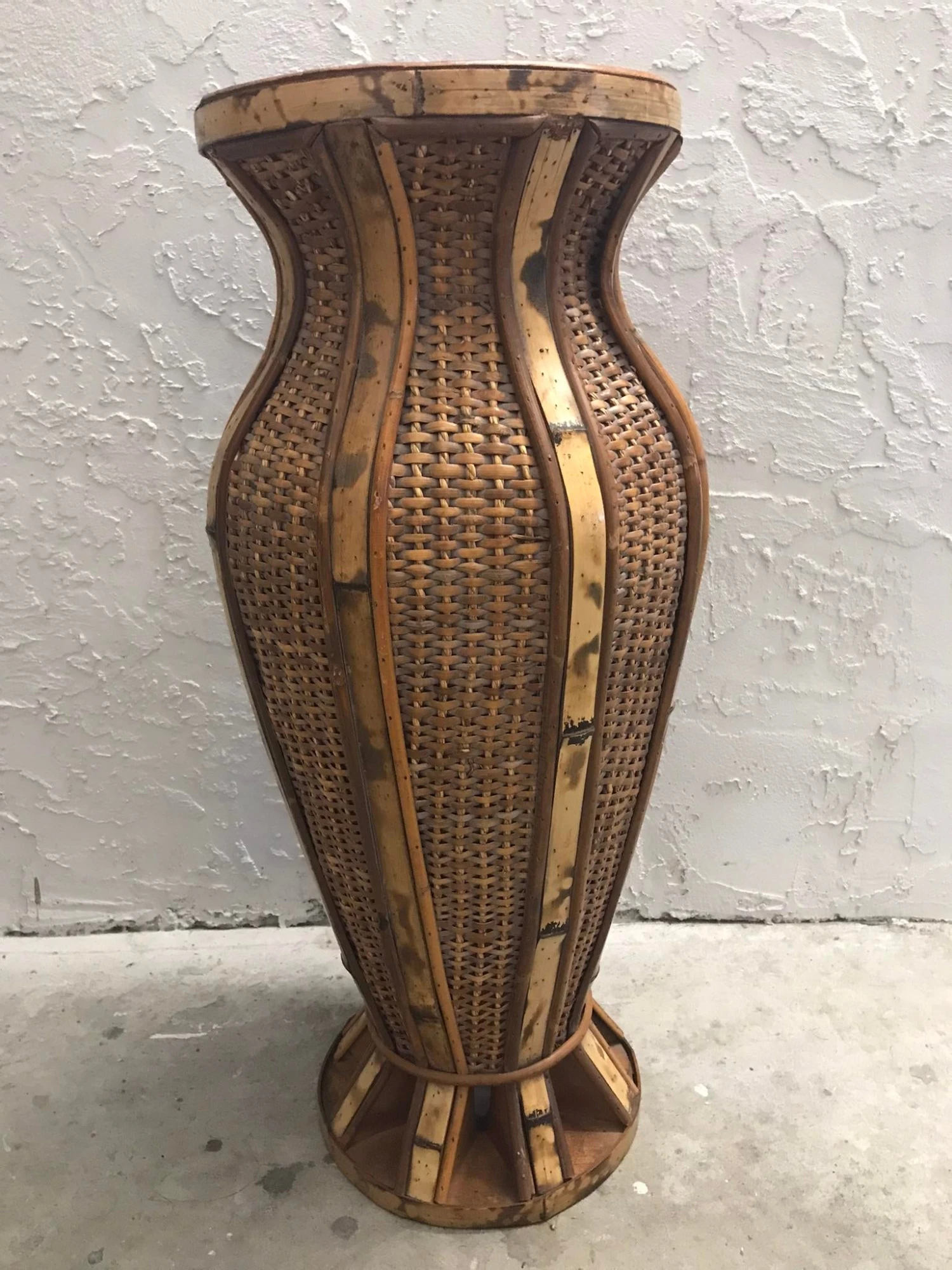 A really nice vintage Umbrella Stand made from cane and wicker. It is a very sturdy piece with a wood weighted base for stability. We estimate that it dates from the 1970s. It would be a lovely bohemian addition to any space and could be used for umbrellas, walking canes, or twig/branch/dried flower stem arrangements.