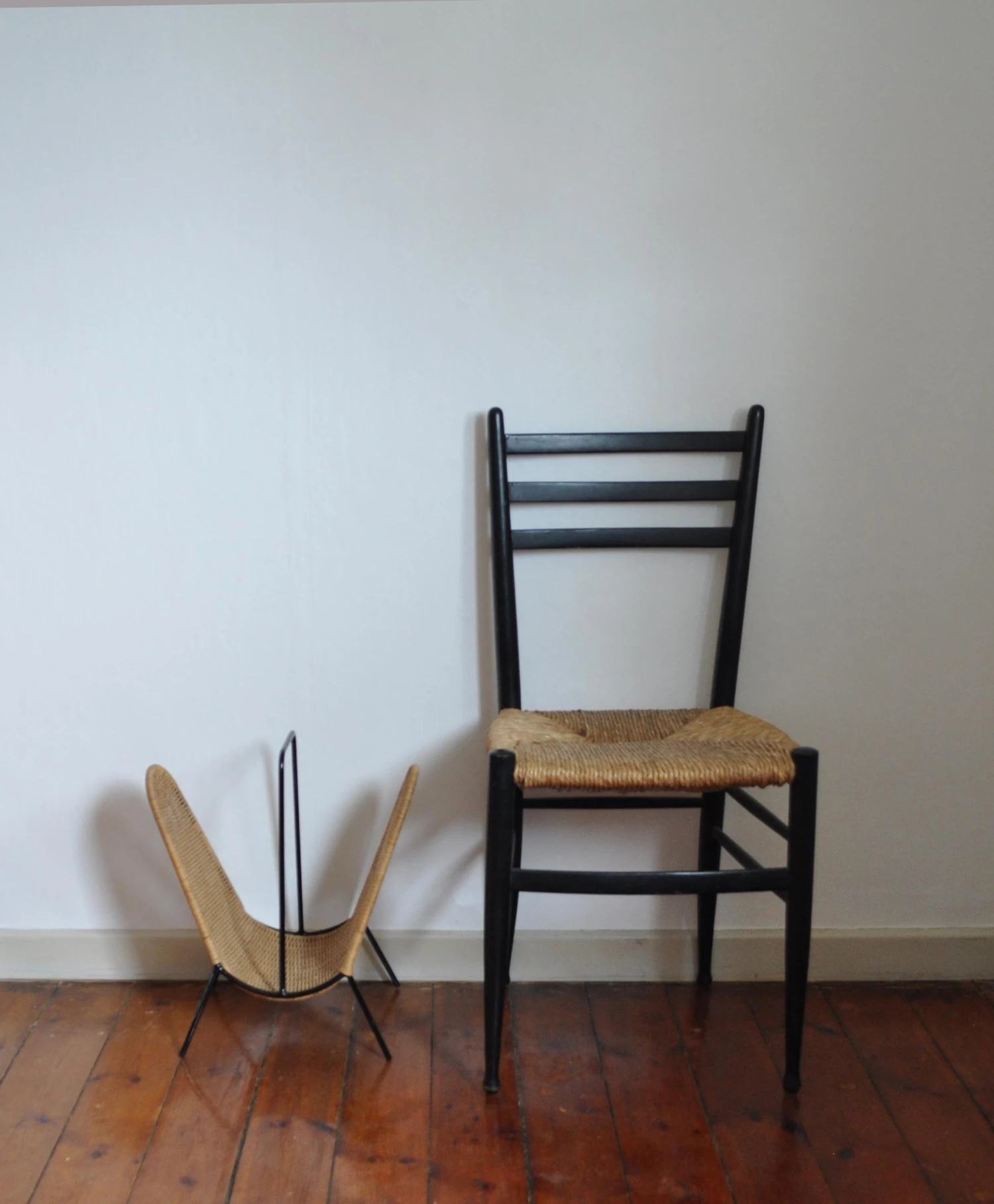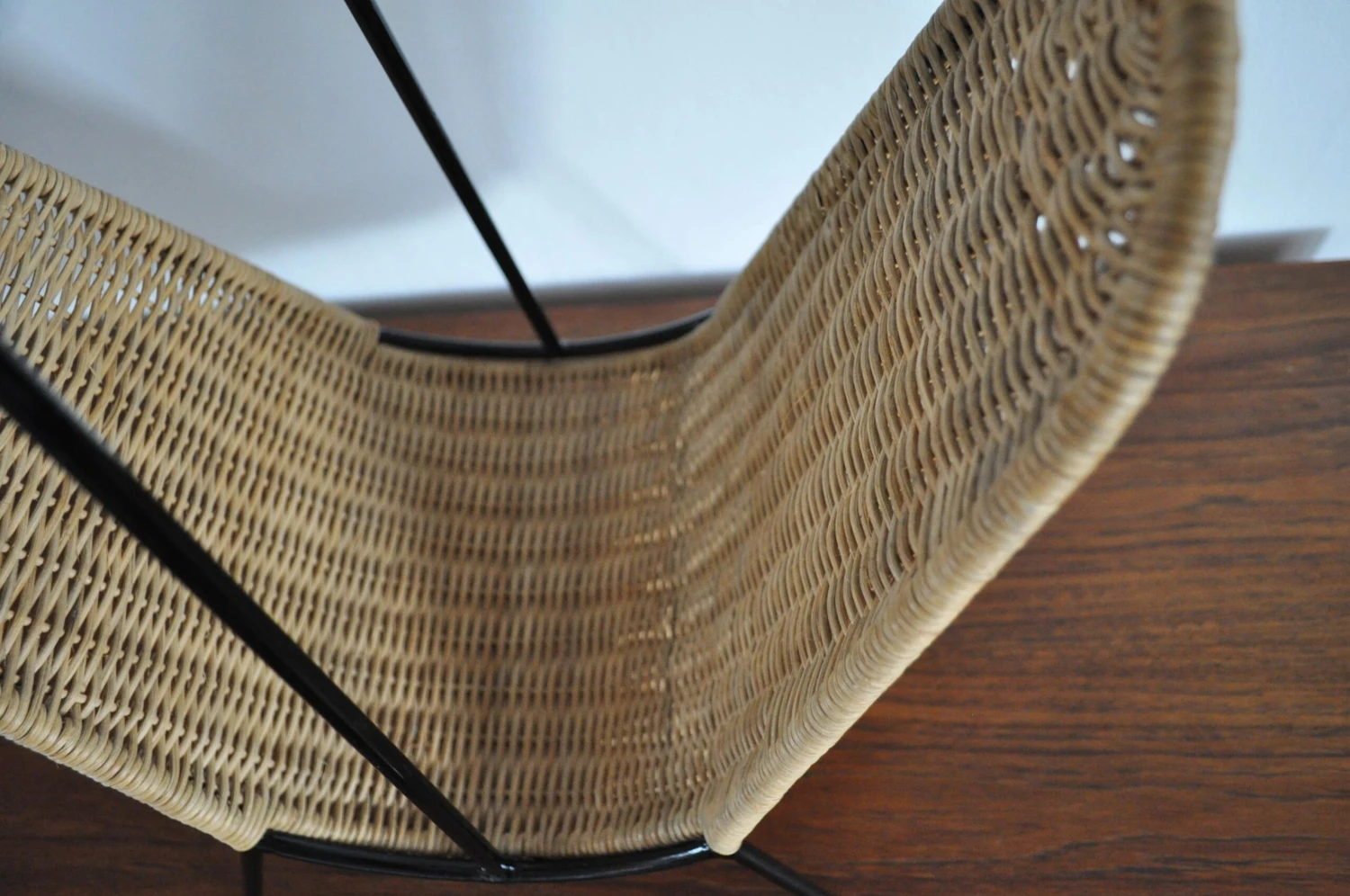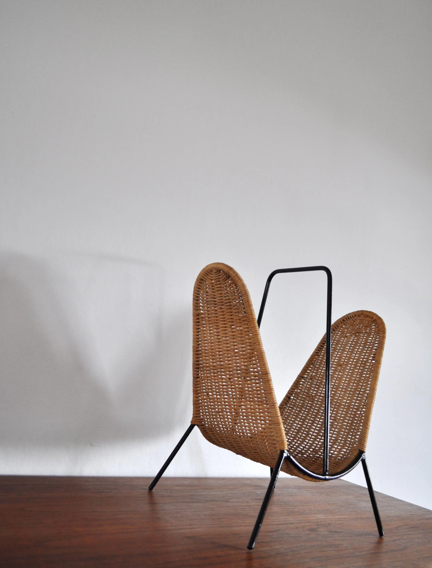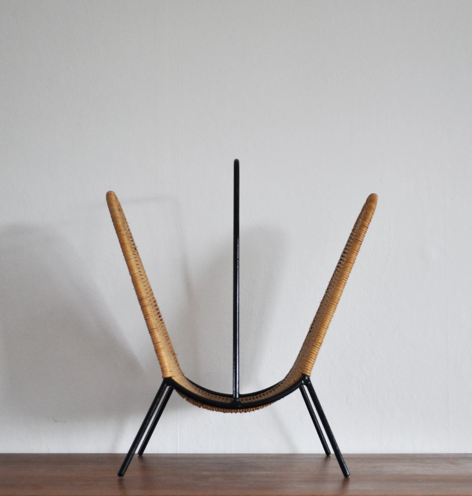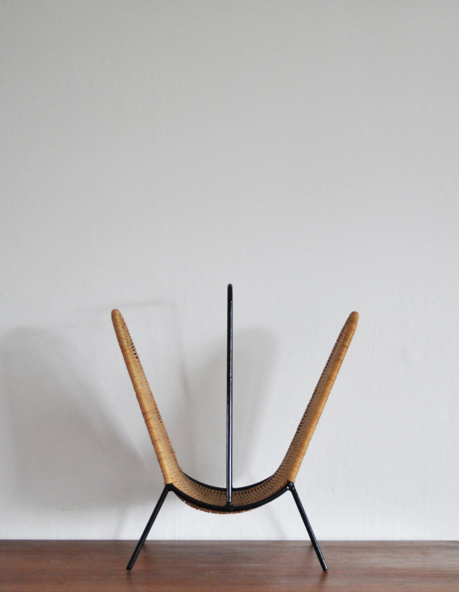 Danish magazine stand or rack circa 1960s, features woven rattan strands which wrap around the black painted steel wire frame.