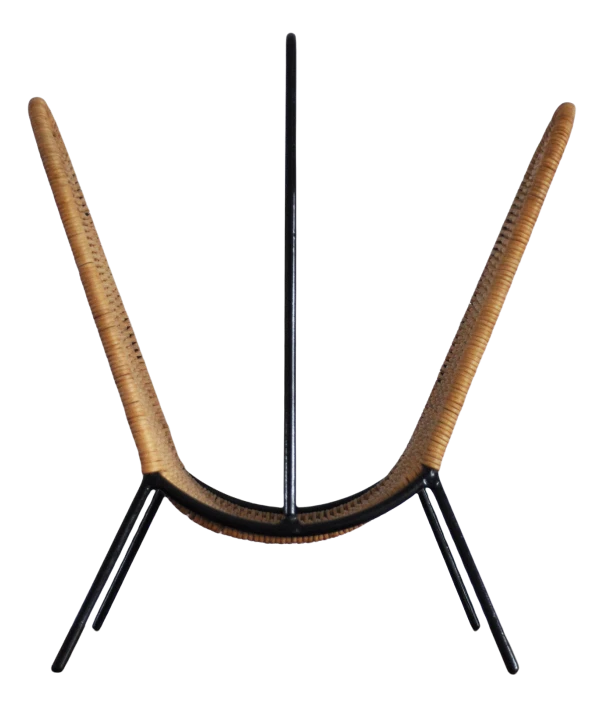 Danish magazine stand or rack circa 1960s, features woven rattan strands which wrap around the black painted steel wire frame. …
