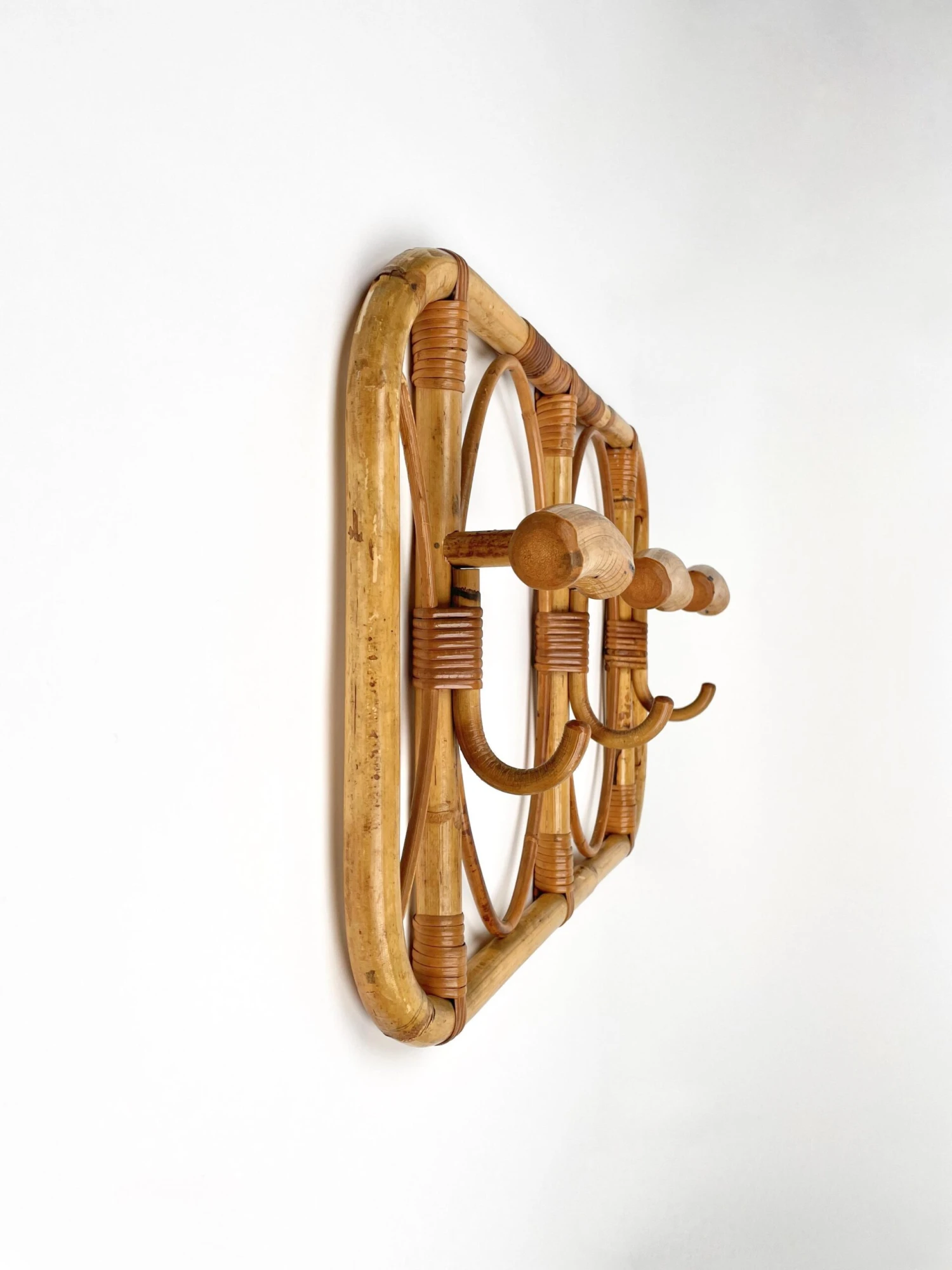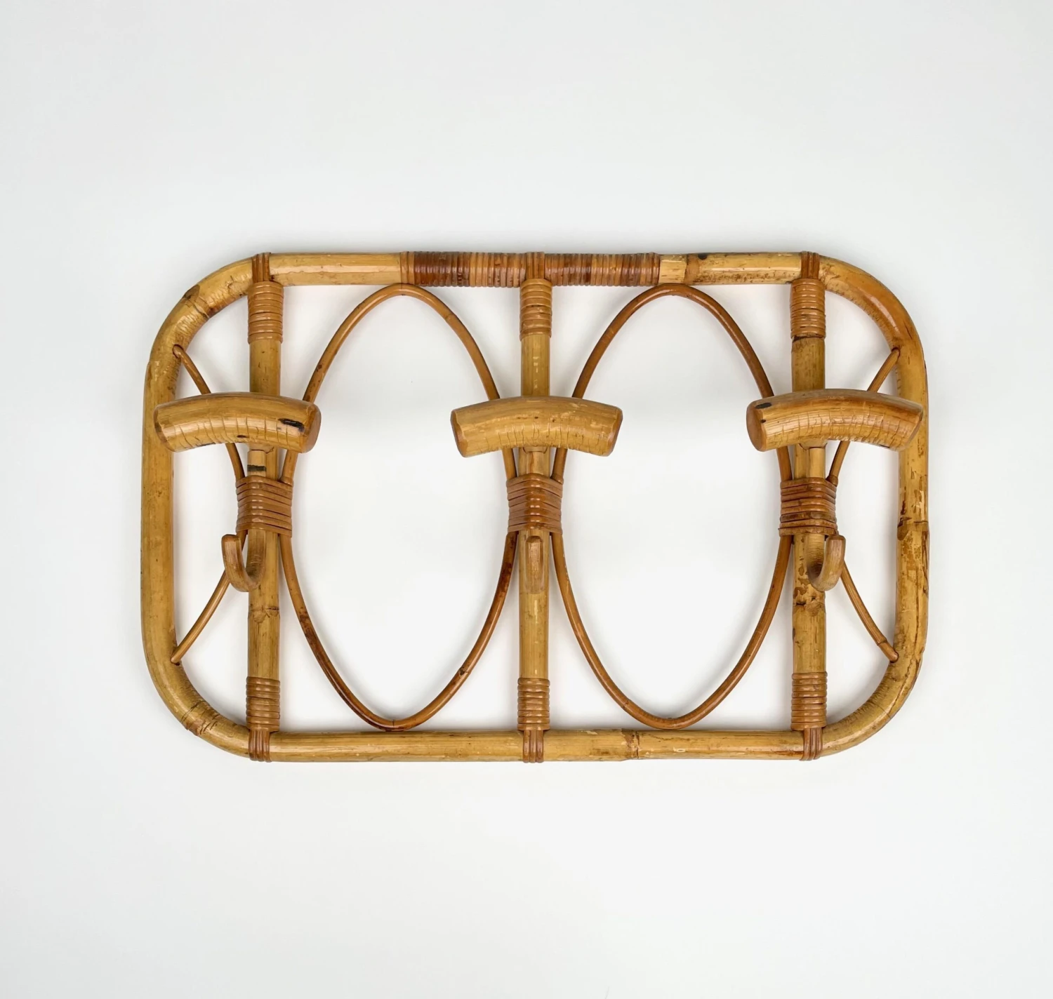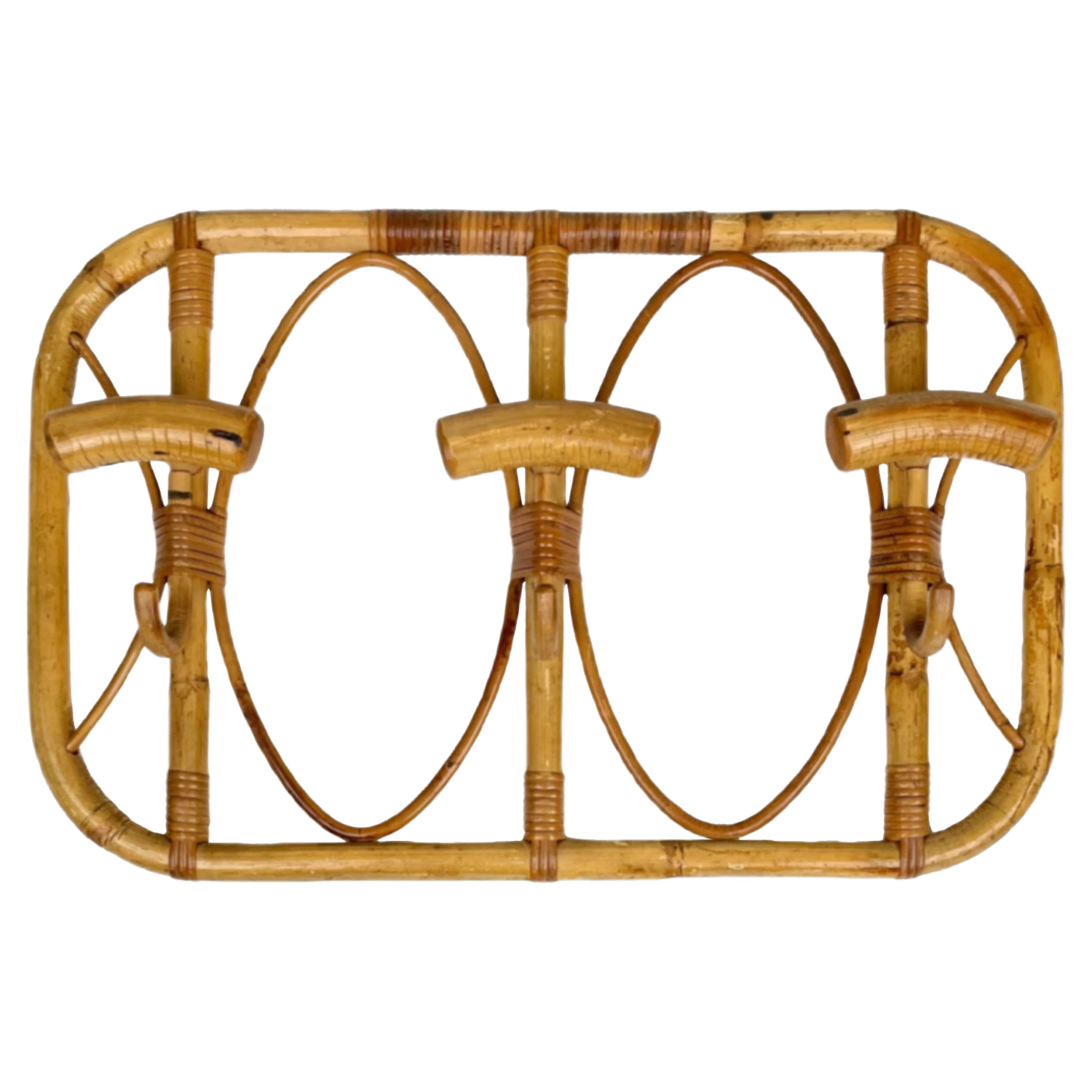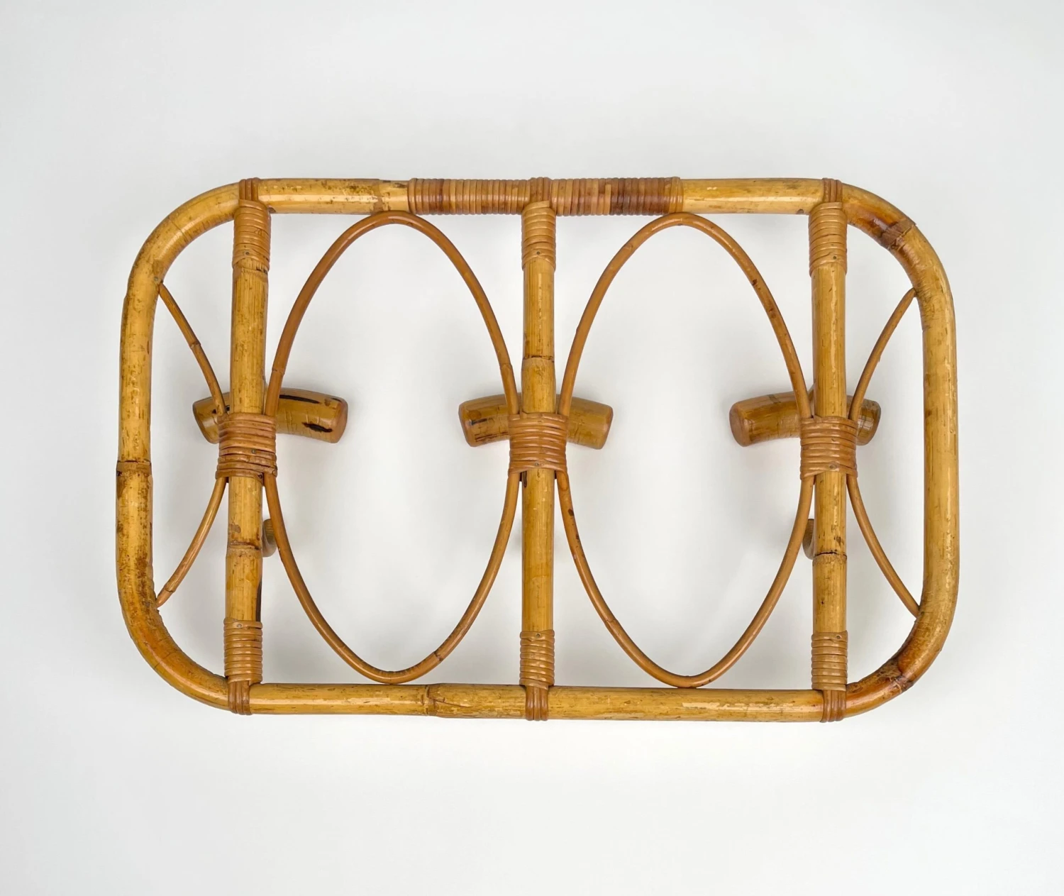 Rectangular coat hanger with rounded corners in bamboo and rattan featuring three hooks. Made in Italy in the 1960s.