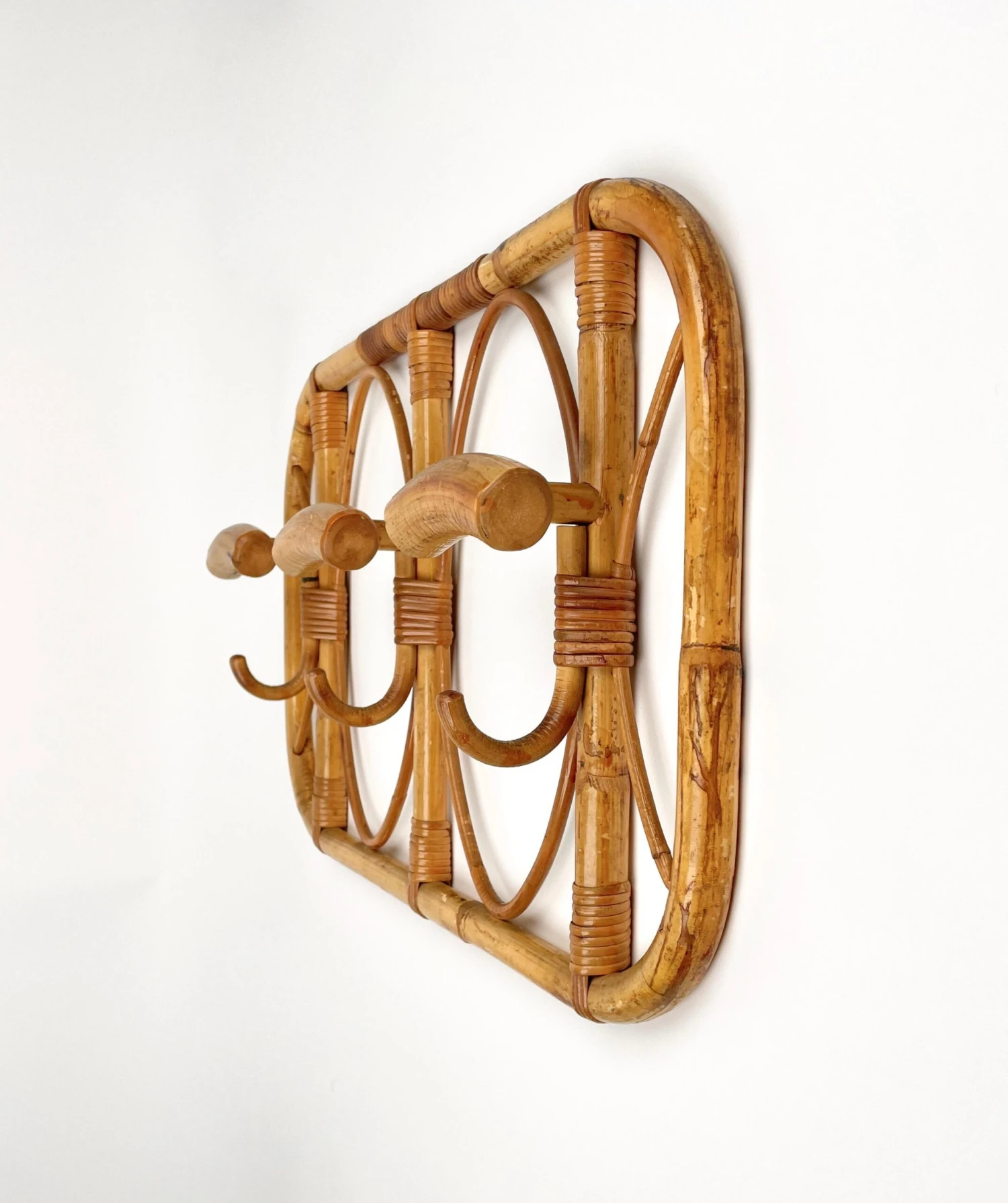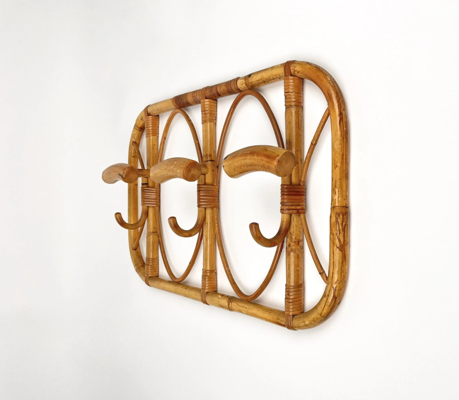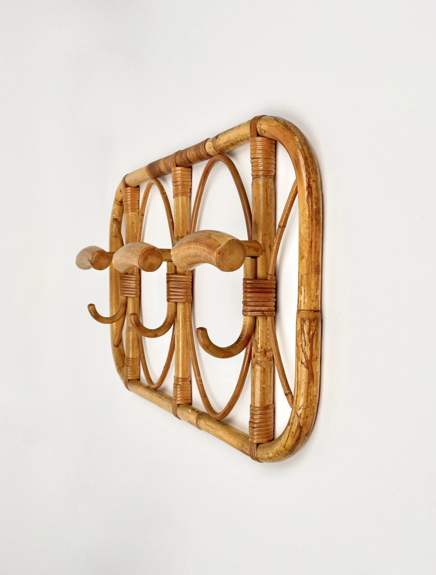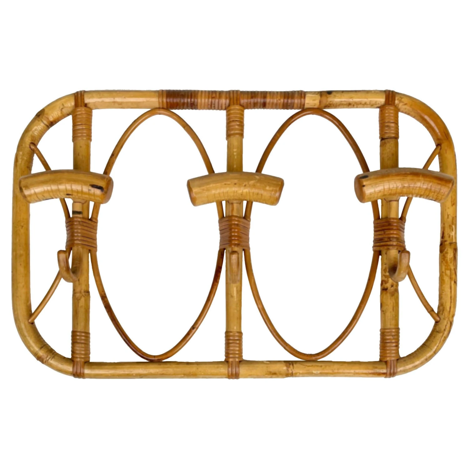 Rectangular coat hanger with rounded corners in bamboo and rattan featuring three hooks. Made in Italy in the 1960s.