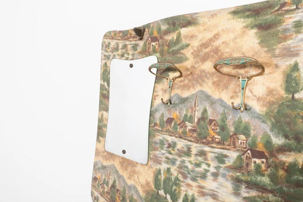 Beautiful entry hall wall panel from 1960’s, Italy. Exceptional Italian craftsmanship. Wooden frame upholstered with fabric, equipped with brass hangers, shelf and a mirror. Condition Good, age related wear and marks. I have official proof of authenticity such as vintage catalogs,