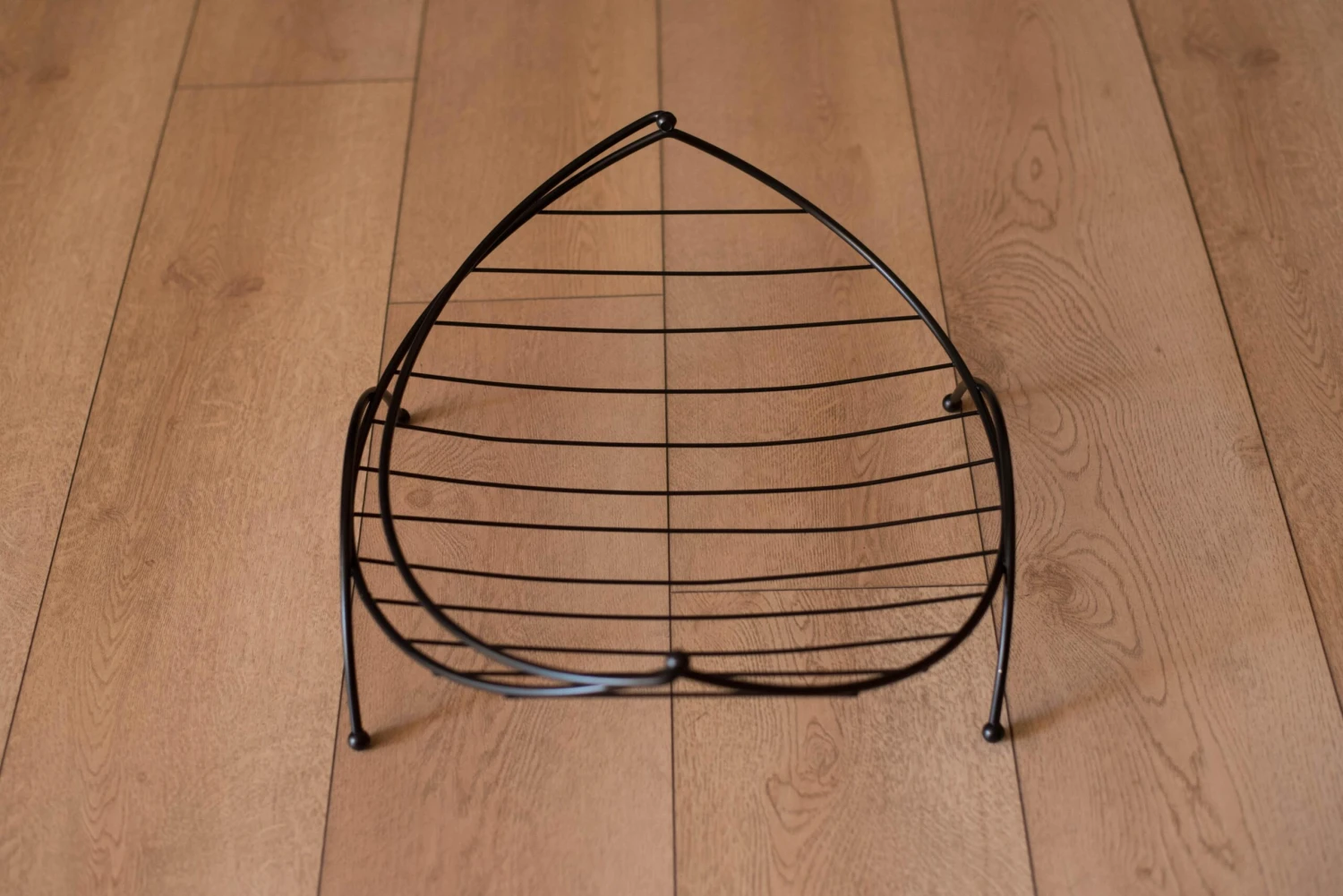 Vintage atomic magazine rack basket holder circa 1960’s. This piece is the perfect home accessory to organize and display magazines, newspapers, or books. Features an adjustable handle, protective ball feet, and is lightweight making it easy to move around.