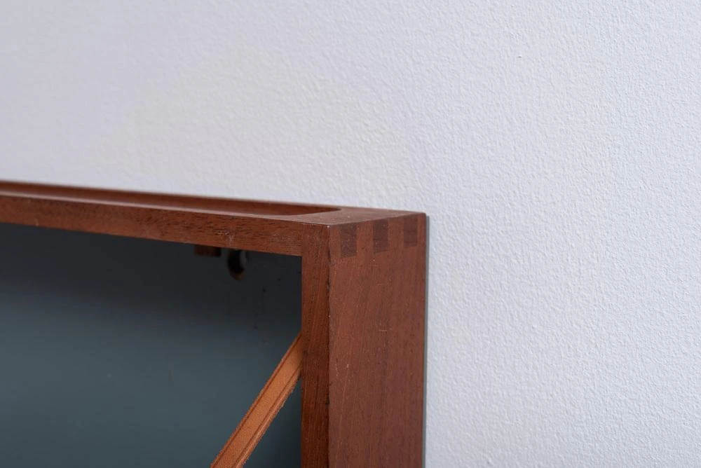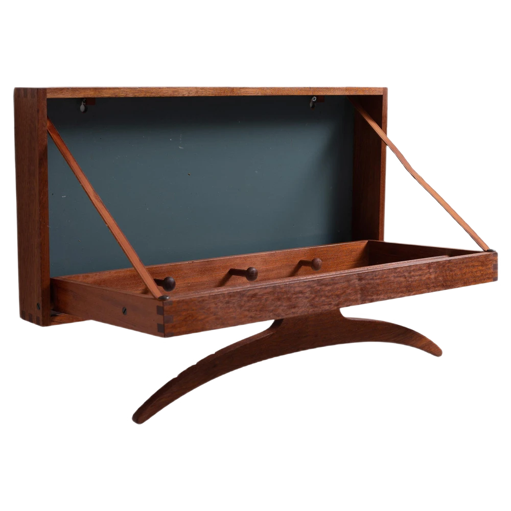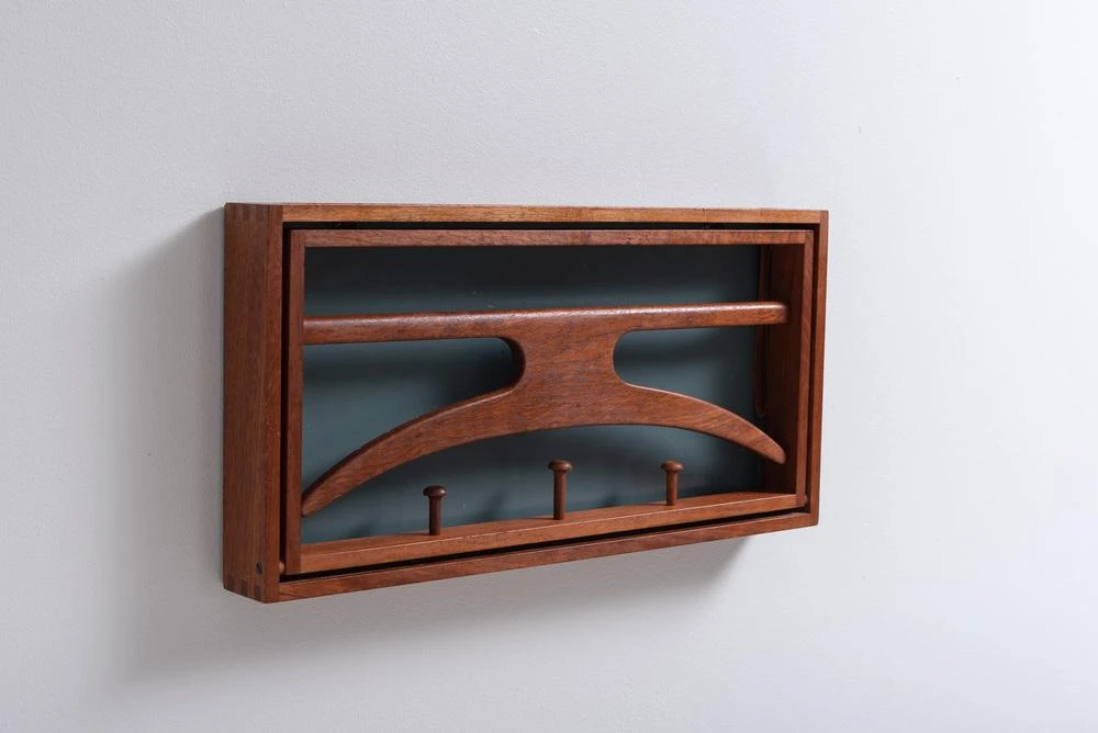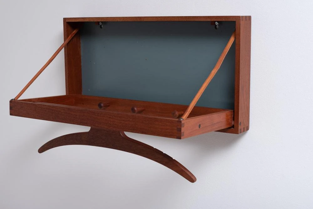 Mid-Century Modern teak coat rack or hanger. The rack is made by Virum Møbelsnedkeri and designed by Adam Hoff and Poul Østergaard in Denmark around the 1960s. The rack is hung on the wall and has a folding hanger and pegs in teak. Good vintage condition consistent with age and use. The rack would be a fun and unusual detail combining function with the unmistakable Scandinavian Modern design. This piece is attributed to the mentioned designer/maker. It has no attribution mark and no