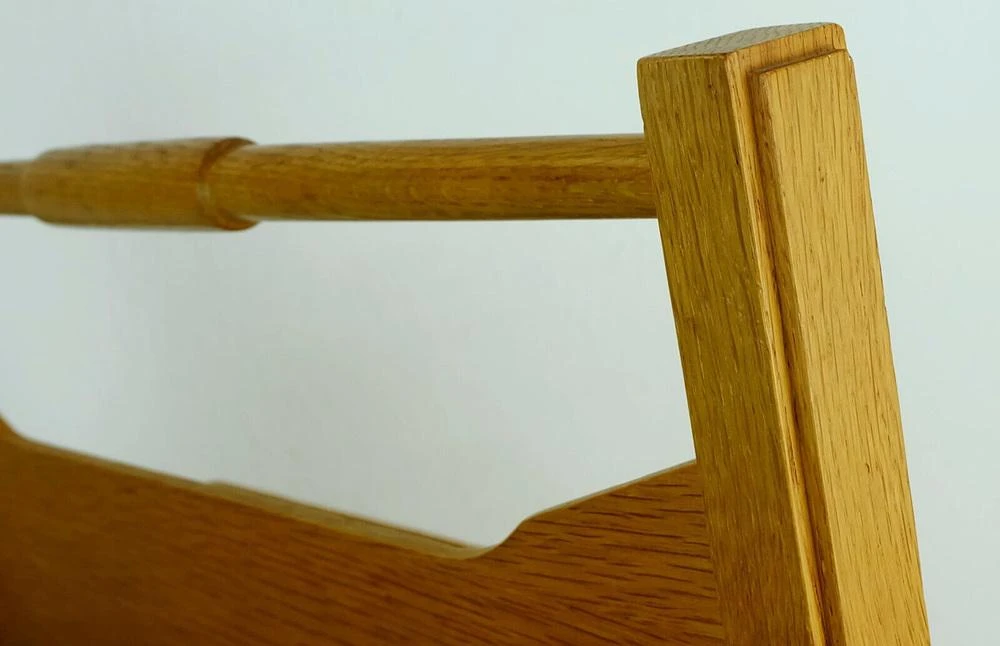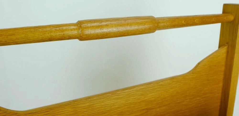 A very nice newspaper stand from the 1960s. It is made entirely of oak wood. Very cool puristic design with the legs on display.