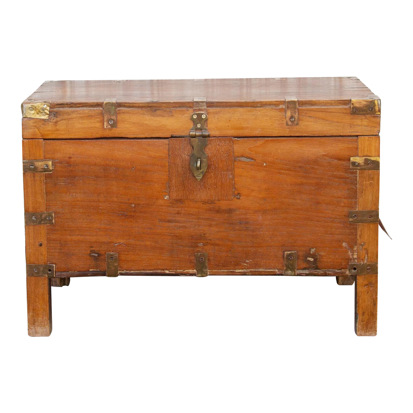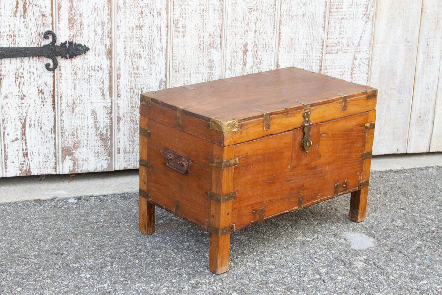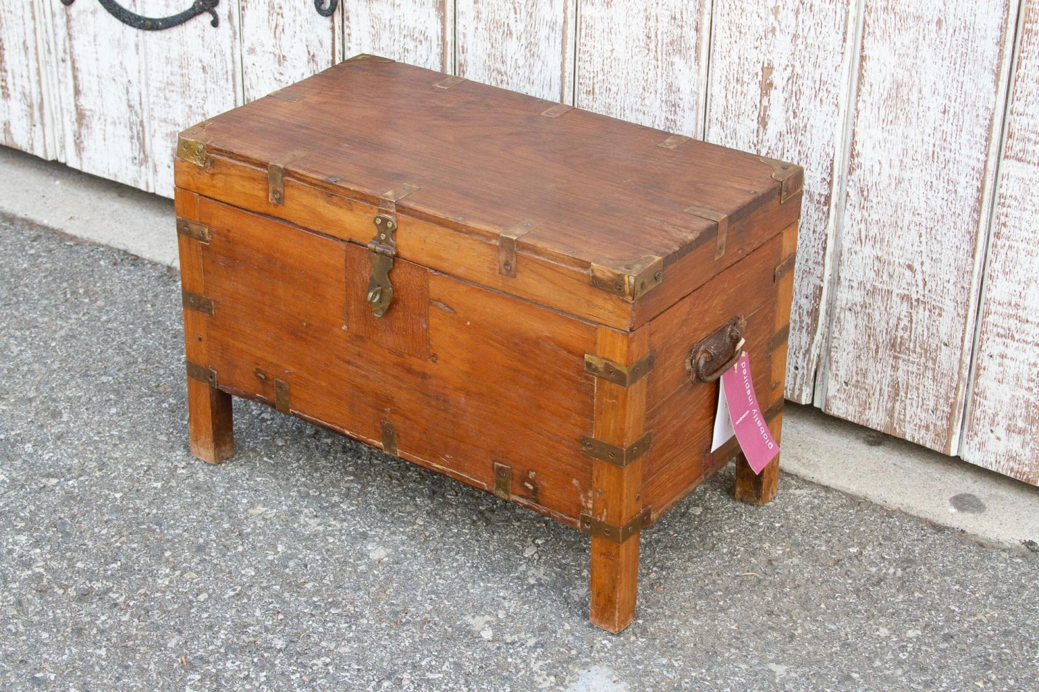 This small wooden campaign box is the perfect storage piece as it stands on square legs and is accented with decorative brass bindings and handles on its sides. It wears a teak wood finish and has a top that opens to a space perfect for tucking away small trinkets.