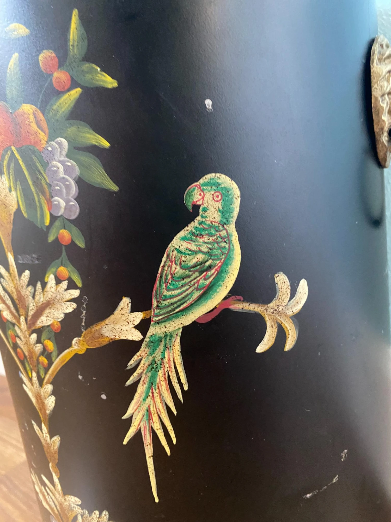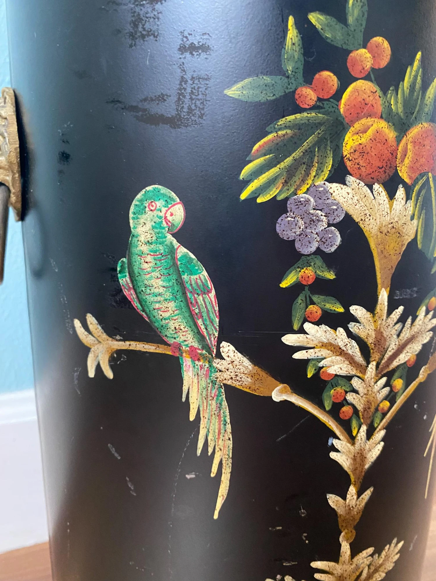 Captivating black tole umbrella stand from the mid 20th century. Hand painted with delightfully colorful and detailed parrots on a …
