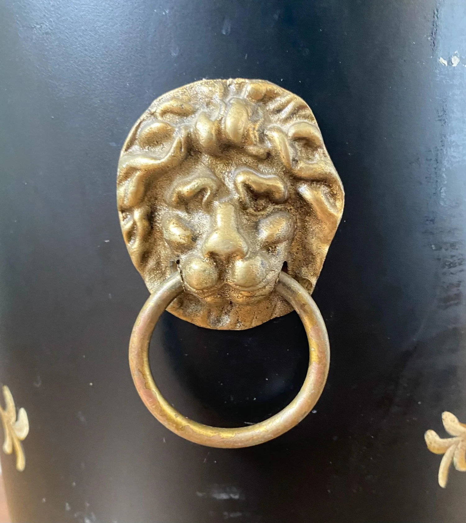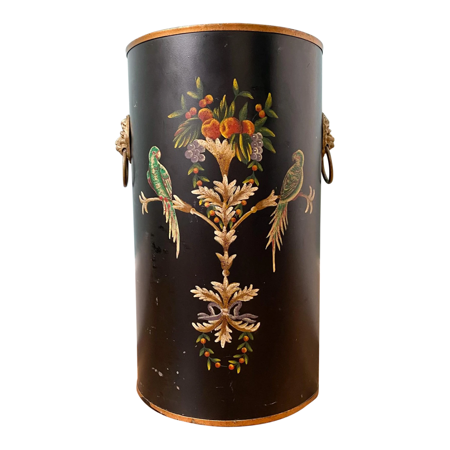 Captivating black tole umbrella stand from the mid 20th century. Hand painted with delightfully colorful and detailed parrots on a branch. Also embellished with gorgeous painted fruit and leaves. Regal brass lion head handles adorn the sides. Perfect for holding umbrellas or walking sticks. Would look stunning in any entryway.